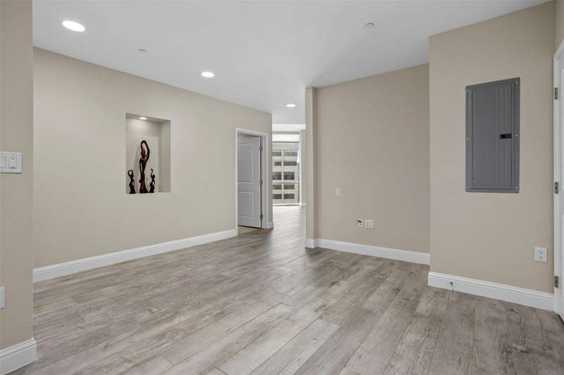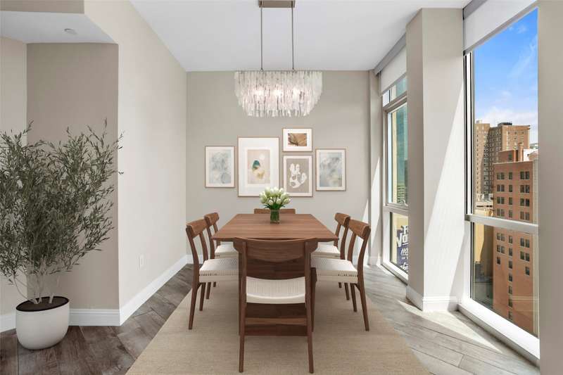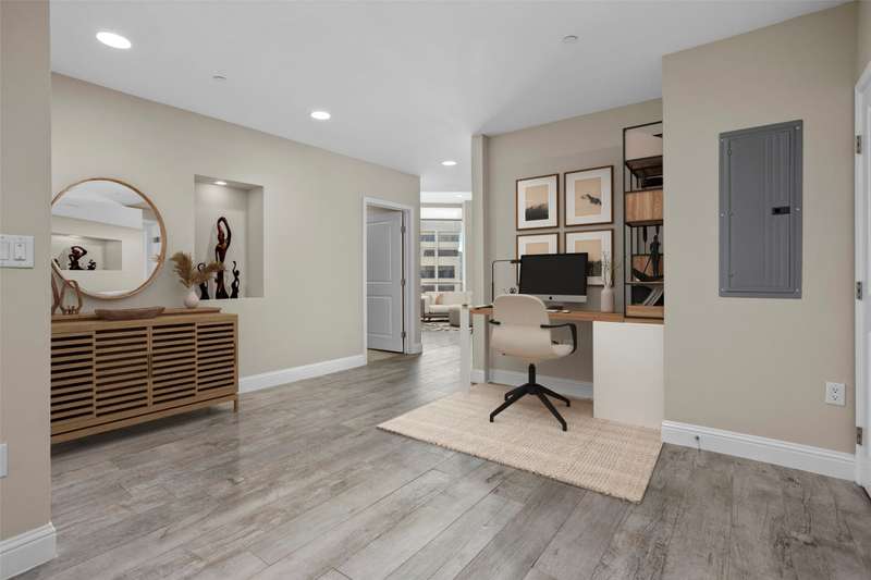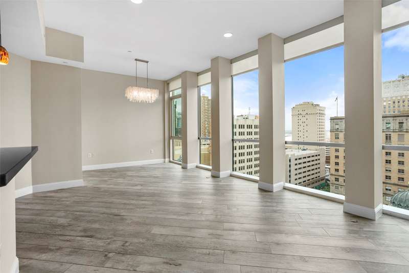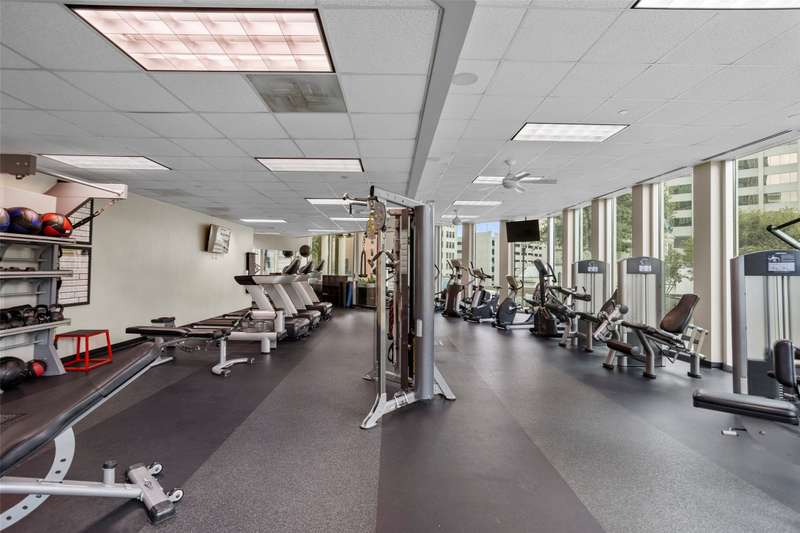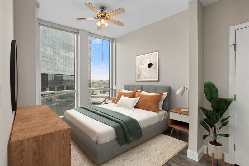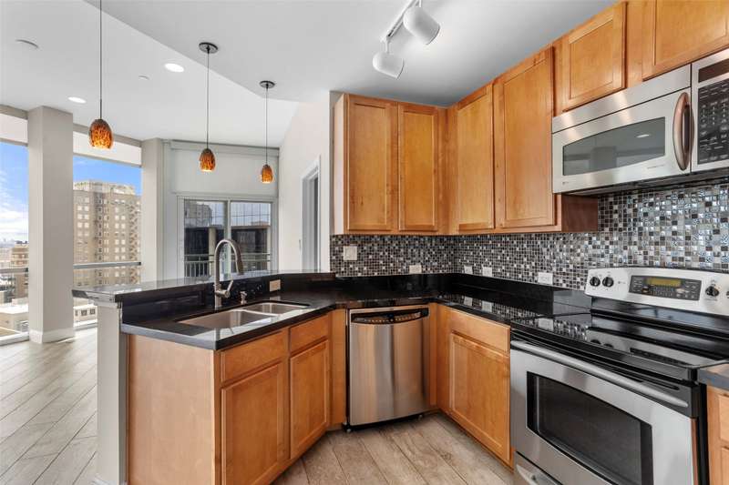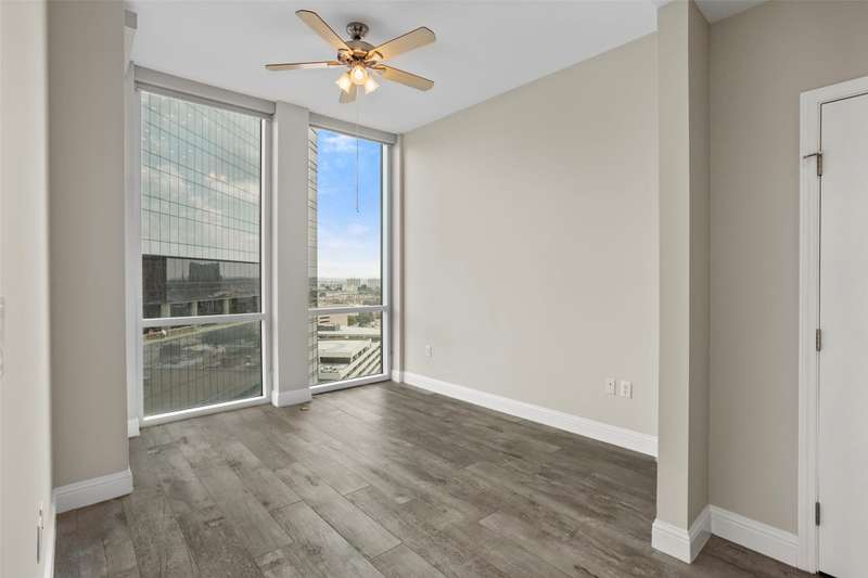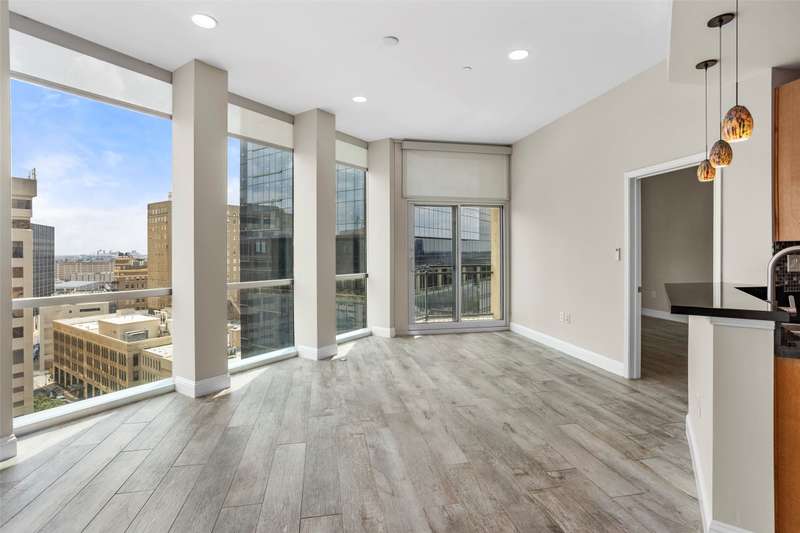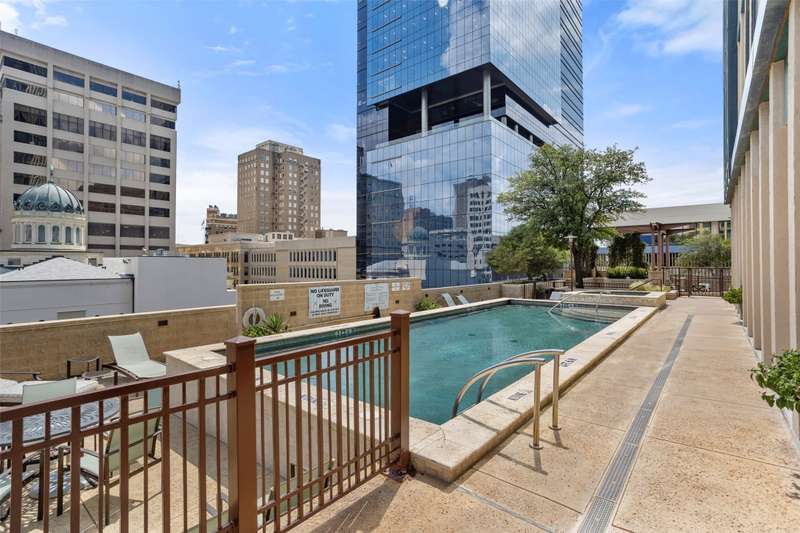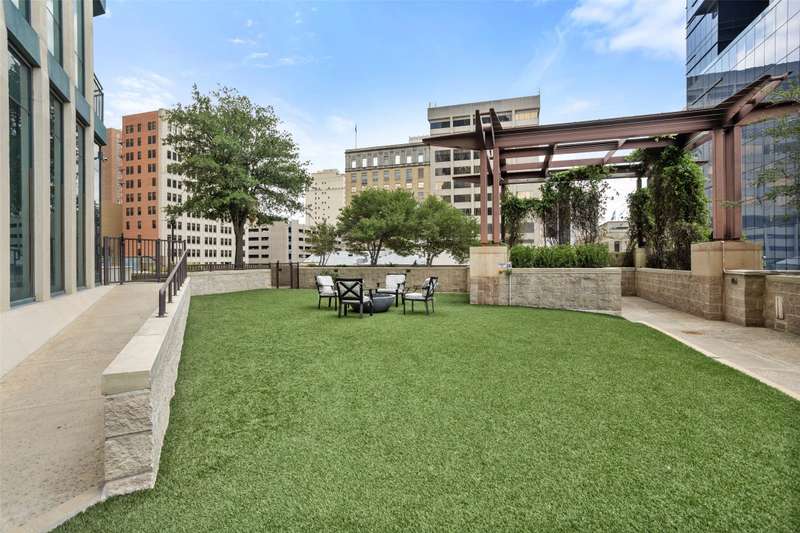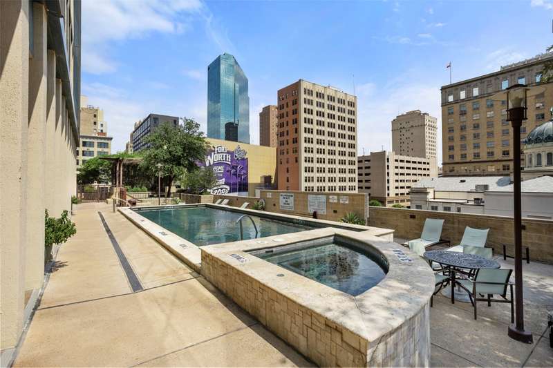 This 1-bedroom, 2-bath, den, living room, dining area, + 2 DEEDED PARKING SPACES - beautifully updated and freshly painted residence offers 1,124 sq. ft. of light-filled living space and spectacular skyline views from floor to ceiling windows. A unique floor plan with reconfigured walls to expand and enlarge the den and main living area, adding over 65 sq. ft. for a seamless open-concept flow. Gorgeous porcelain tile flooring with sound-deadening underlayment, private balcony overlooking downtown, perfect for enjoying Branch & Birds live music, Custom art nook with spotlight feature, Granite kitchen countertops, newer refrigerator, imported Murano glass pendants, floor-to-ceiling windows with electric sunshades + new bedroom privacy shades, Spacious primary suite with ensuite bath + full guest bath, Community Amenities: Resort-style pool & spa, grilling stations with cabanas, golf tee, firepit, fitness center, and resident lounge. Live in the heart of downtown Fort Worth with unmatched style, comfort, and convenience.