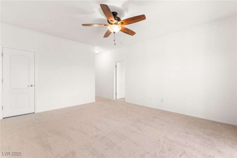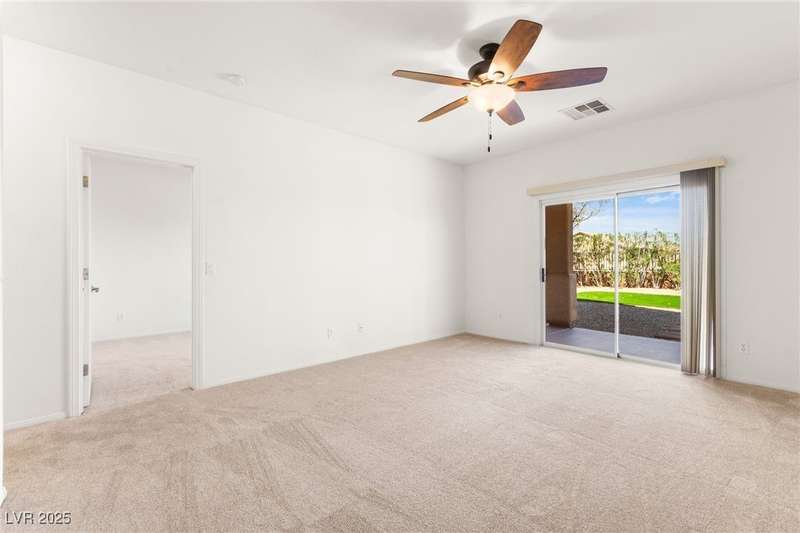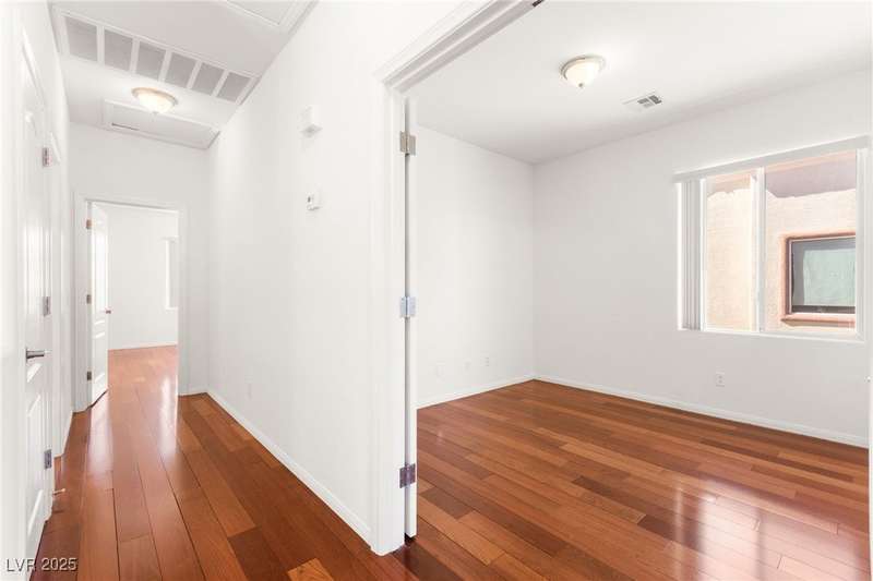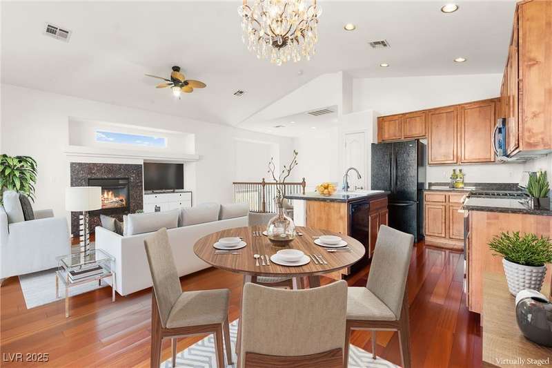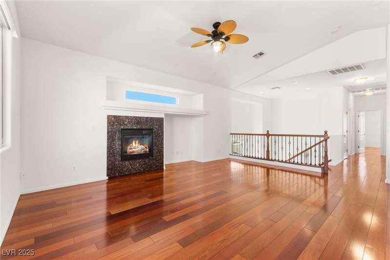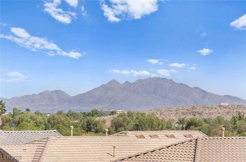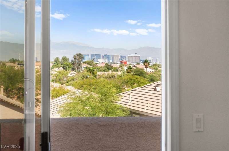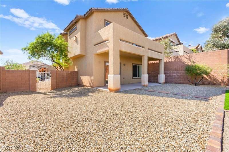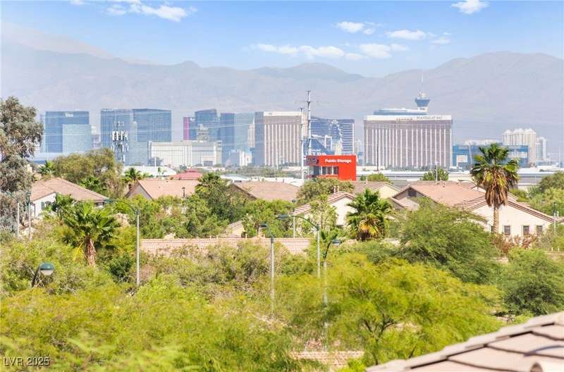 Located in the sought-after Southern Highlands community in Southwest Las Vegas, this elevated 3-bedroom, 3-bath home offers breathtaking views of the Las Vegas Strip and surrounding mountains. Upstairs, an open-concept kitchen, living, and dining area flows to a balcony with iconic Vegas views. The kitchen features a new stainless steel stove, while cherrywood hardwood floors span the upper level and staircase, complemented by brand-new carpet downstairs. A wrought iron banister adds elegance, and all bathroom fixtures have been updated for a modern touch. On the first floor, enjoy a cozy family room and an additional bedroom with direct access to the backyard. The backyard itself has been redesigned with synthetic turf, pavers, and desert rock landscaping, offering a low-maintenance, inviting outdoor space. This home perfectly combines modern updates with the charm of an established neighborhood and unforgettable views—making it a true Southern Highlands gem!