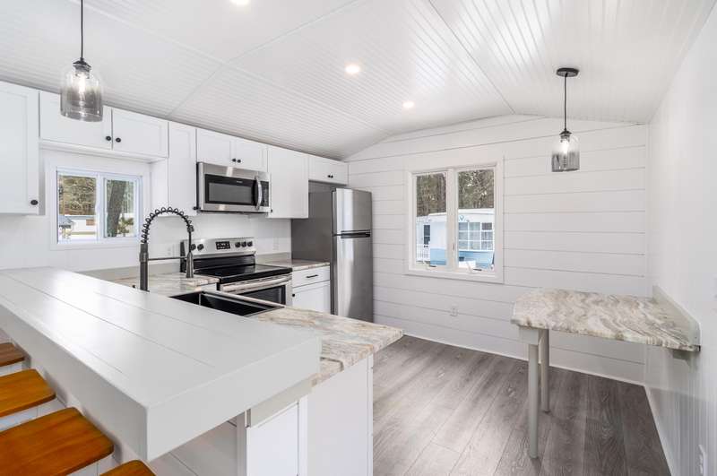 Why rent for the summer when you can live in this beautifully renovated 3 bedroom manufactured home offering approximately 854 sq. ft of living space where modern comfort meets the charm of days gone by at the Old Chatham RV Resort Park. This 3-bedroom, 1-bath SEASONAL (May 1-Oct 31) retreat has been thoughtfully updated throughout with brand-new laminate flooring in the living area, tile floors in the bathroom, new kitchen cabinets, gorgeous stone countertops, lighting fixtures, appliances, windows, roof, and siding!Enjoy the privacy of your back deck, perfect for early morning coffee relaxing or later afternoon cocktail entertaining. Rinse off after a day at the beach in the outdoor shower and store all of your beach gear in the new vinyl shed. Park residents enjoy access to a refreshing pool, a dedicated dog exercise area, and a fun-filled children's play area.Located just minutes from movie theaters, shops, a gourmet food store, and restaurants, this property offers the perfect Ca