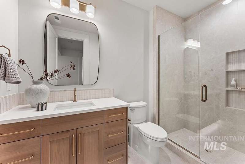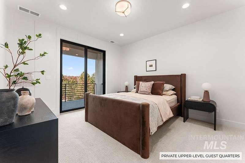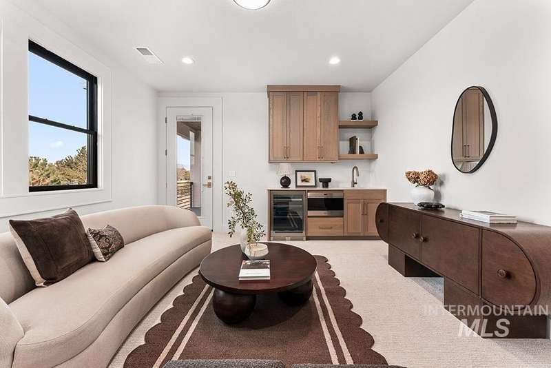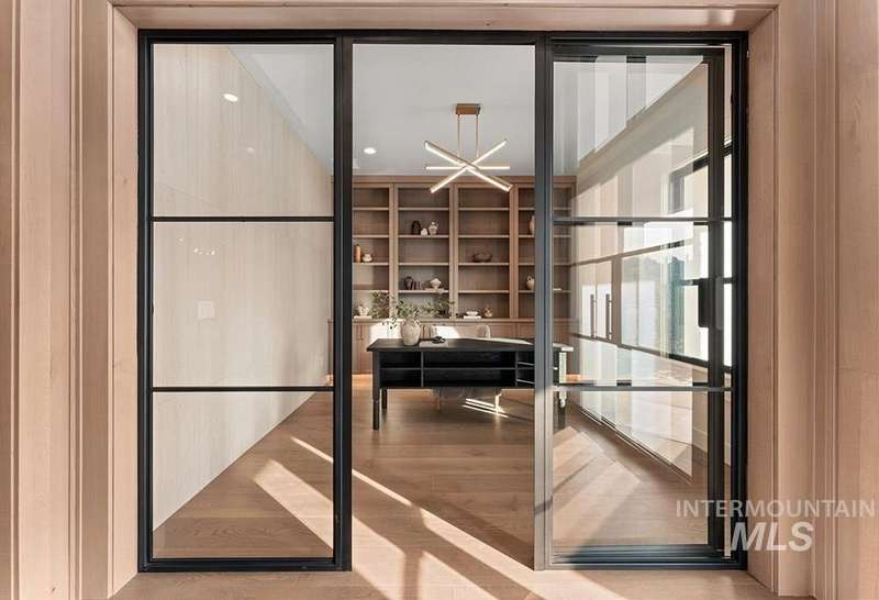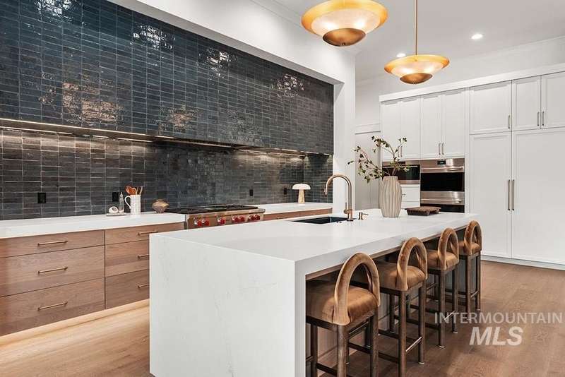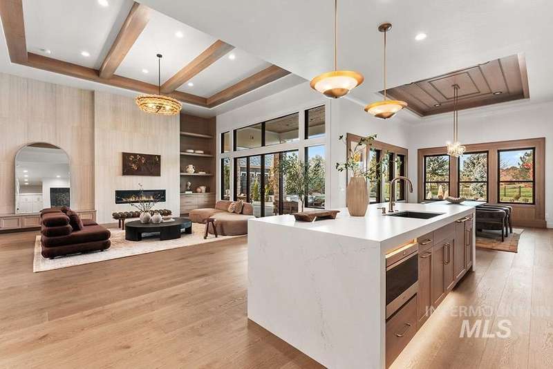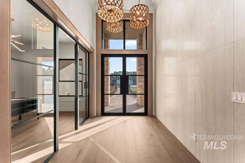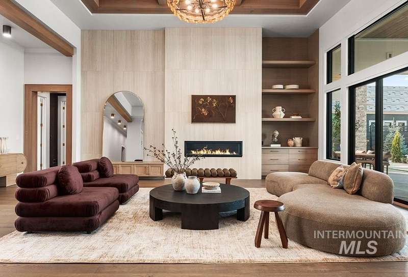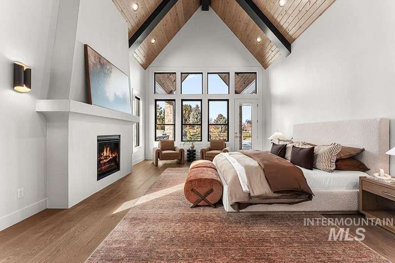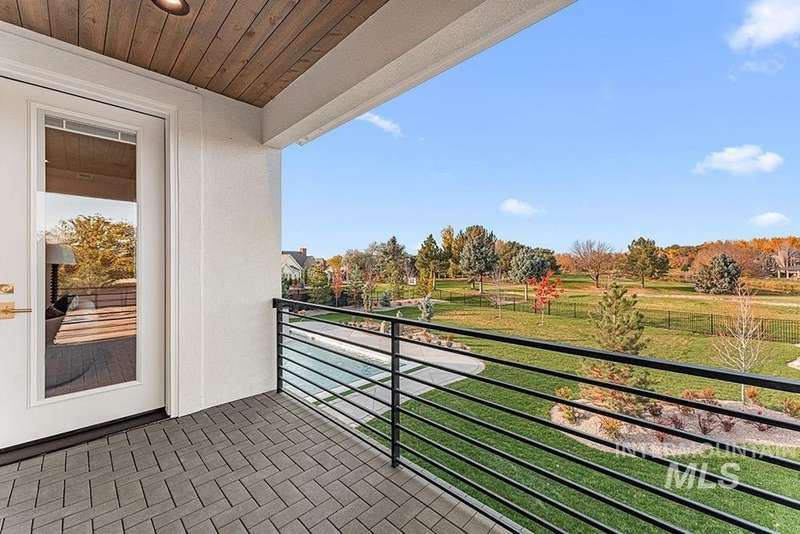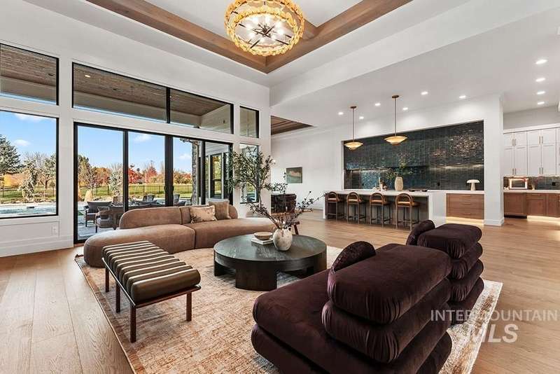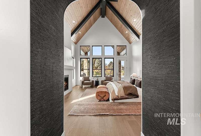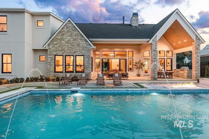 Experience the inaugural showcase home in Oakwood Meadows Eagle, a boutique enclave by Todd Campbell Custom Homes. Positioned on an acreage lot (with 30'+ of common space behind) backing to Banbury Golf Course, this estate blends timeless architecture with modern design and golf course living with an expansive RV garage (46'd × 16'w × 18'h 12'x16' door). The home lives like a single level, with all main living spaces on the first floor and an upper level guest corridors. The great room features 15’ ceilings w/ exposed beams, a floor-to-ceiling fireplace, and a series of sliding doors that flow seamlessly into the covered patio for indoor-outdoor living. The gourmet kitchen is the centerpiece of the home, boasting a statement tile feature wall, waterfall island, white oak cabinetry, and professional-grade appliances with a full butler’s pantry. The master wing is a private retreat with cathedral ceilings, plastered fireplace, wet bar, & patio access, while the luxe en suite includes a steam shower, soaking tub, & dual dressing rooms. A connected home gym/flex room enhances the functionality of the suite. The home also includes an executive office, bonus room, and three additional bedrooms. The resort-style backyard invites relaxation with an expansive covered outdoor living room, built-in kitchen, in-ground pool, hot tub, & sunken fire-pit surrounded by professional landscaping.