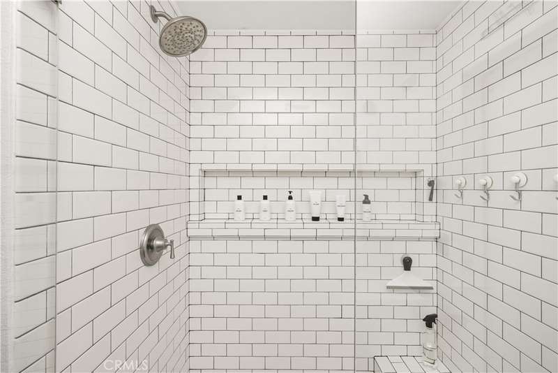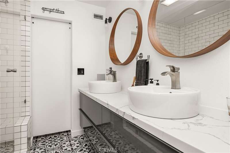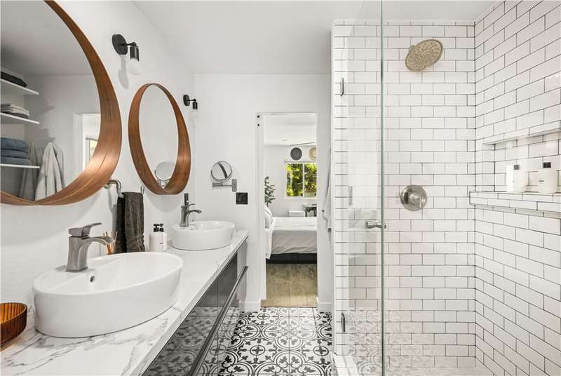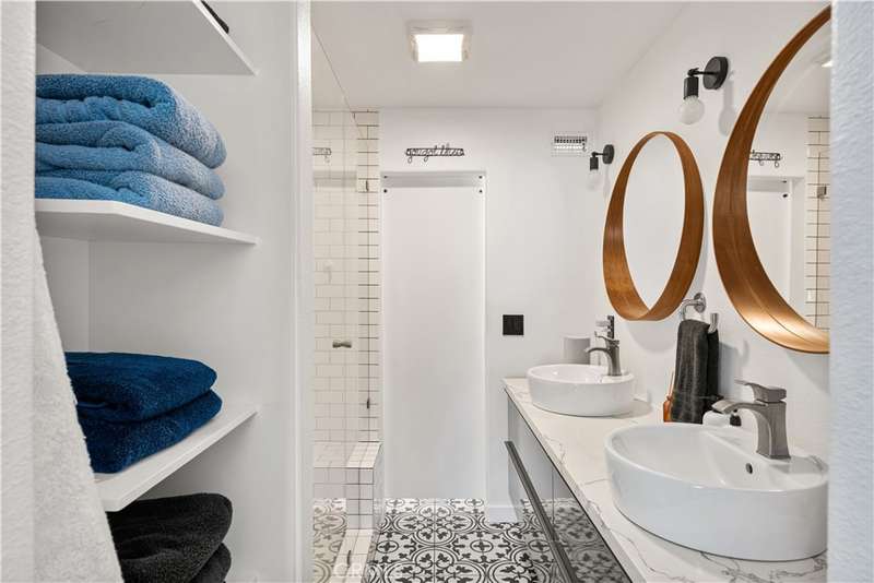 Retreat to the primary suite, where a custom shower with seat, dual sinks, and ample storage in granite-topped vanities offer spa-like relaxation. The second bathroom features a deep soaker tub and the same high-end finishes. Both bathrooms include tile flooring, sleek custom shelving, and plenty of vanity storage.