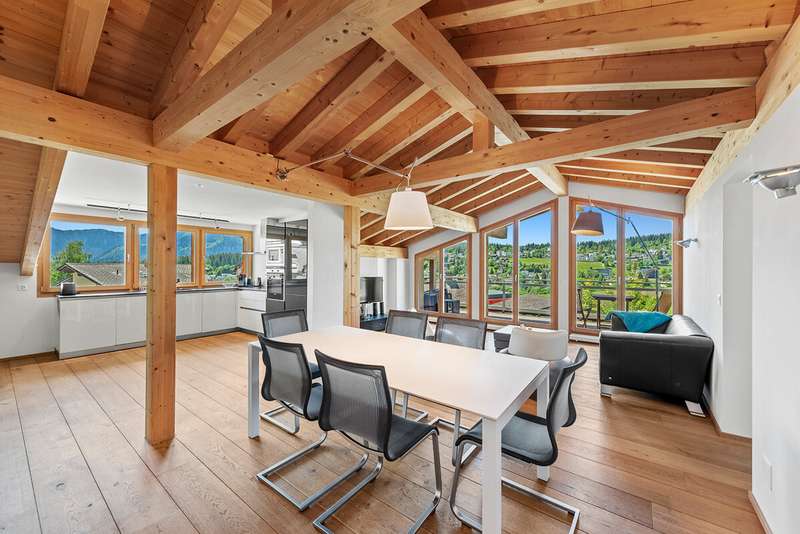 This property combines two self-contained flats in a building with just four units in all. While completely independent. An ideal setup for families, multi-generational living, shared ownership arrangements, or a mix of private use and rental. The top-floor flat offers generously sized rooms, an open-plan kitchen, and a balcony with sweeping alpine vistas. Two bathrooms and two bedrooms provide comfort and space to retreat in a refined setting. The flat on the second floor below features a clearly defined layout, a bright living area with adjoining kitchen, and its own balcony. Two bedrooms and an additional room, suitable for use as a study or guest room, complete the interior. This flat also includes two modern bathrooms. A dedicated part of the garden affords space in which to unwind and enjoy spending time. A separate toolshed provides practical storage capacity. Situated on a quiet road with next to no traffic in a sunny hillside location above Flims, this property offers a tranquil living environment with convenient access to the village and chair-lift via a nearby bus stop. The property: - 3.5-room flat on the top floor - Approx. 115m² living space - 4.5-room flat on the second floor - Approx. 107m² living space - Approx. 10m² ancillary space - Balconies and dedicated share of garden included - 1 garage space, 2 outdoor parking spaces