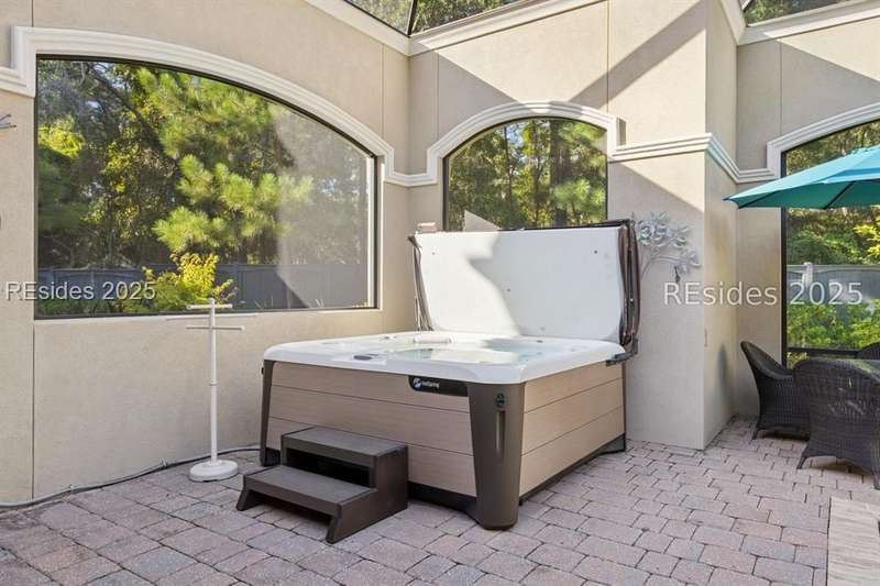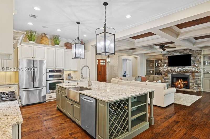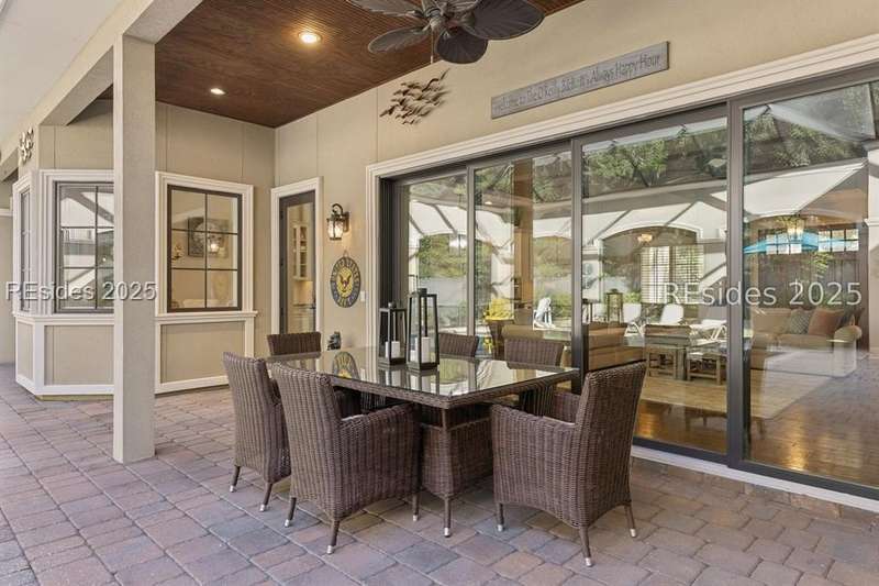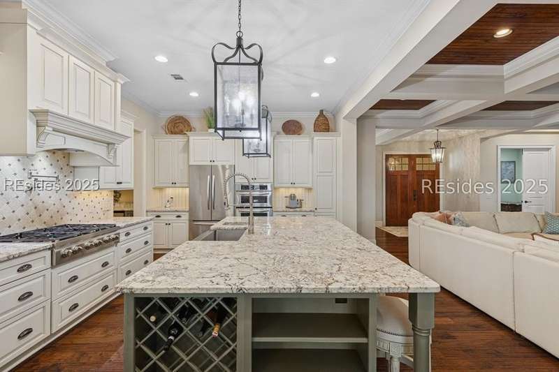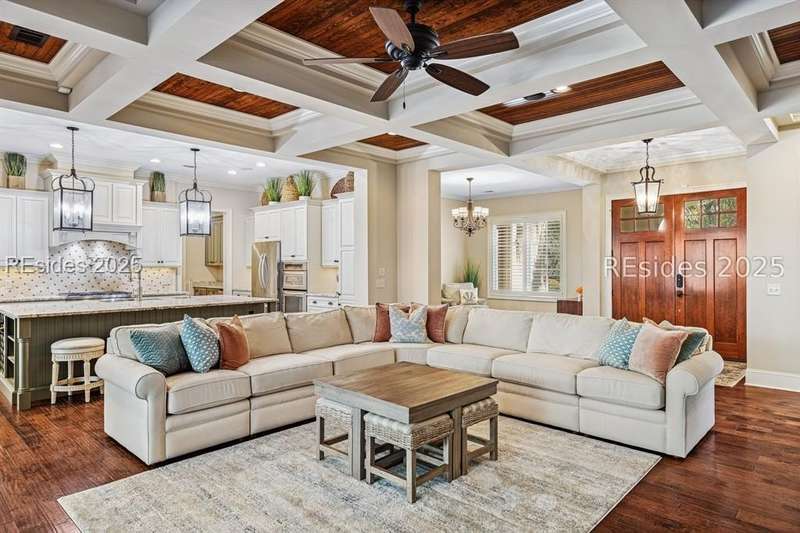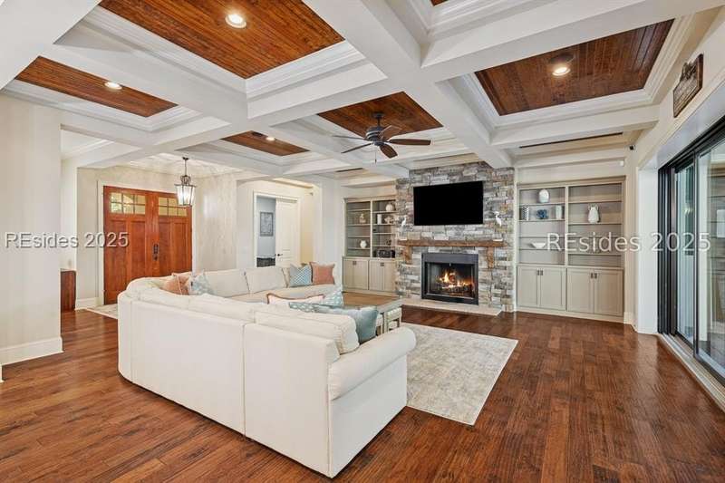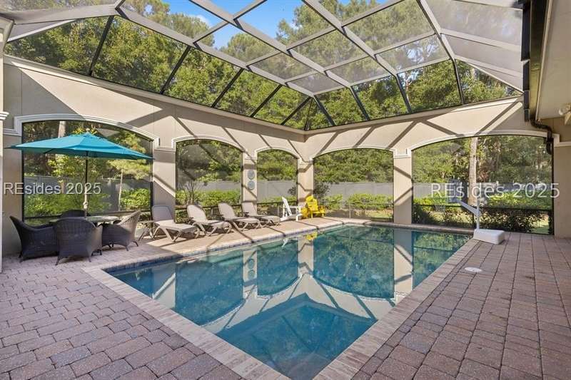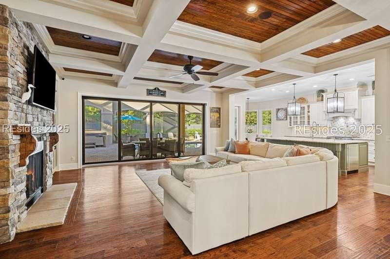 Exceptional custom home in Broad Pointe at Indigo Run offering an unparalleled indoor-outdoor living experience. Designed with a thoughtful layout, open floorplan and higher ceilings throughout, this nearly new home has been sparingly used as a second residence and is in pristine, move-in-ready condition. The heart of the home is the gourmet kitchen featuring a 6-burner gas cooktop, large island with seating, stainless farm and prep sinks, separate beverage fridge, plus a charming breakfast nook and butlers pantry with built-in cabinetry, wine cooler, and additional beverage fridge. The Great Room boasts a coffered, wood-inlay ceiling and striking stacked stone fireplace, and is open to the kitchen and dining room, creating a warm and inviting space for everyday living and entertaining. A first-floor guest bedroom with adjoining full bath offers direct access to the lanai and pool area. Additional functional spaces on the main level include a drop zone with built-in cubbies, 2-car garage, and outdoor shower. The screened lanai is enhanced by architectural walls with pavers surrounding a gorgeous pool, separate saltwater hot tub, and covered outdoor living area complete with a stacked stone fireplace, built-in grill, sink, beverage fridge, bar and dining area - perfect for entertaining or relaxing in privacy. Upstairs, the spacious primary suite includes a large walk-in closet and a luxurious bath with oversized shower featuring multiple shower heads. Two additional guest bedrooms (one with an ensuite bath) also offer walk-in closets. A large bonus room features custom built-in sleeping areas and storage drawers. The second floor also offers a full-size laundry room with sink and ample storage. Located on a private 0.7-acre cul-de-sac lot, this home provides purposeful privacy and the feel of an exclusive resort. Broad Pointe residents enjoy access to a private community pool, dock, and kayak storage, with optional membership to The Golf Club at Indigo Run or social membership. This à la carte-style membership has made this last and final development on Hilton Head one of the most sought-after communities on the Island. Just 7 minutes to shopping, dining, and Hilton Heads town-owned beach parks, this home perfectly balances luxury, convenience, and lifestyle.