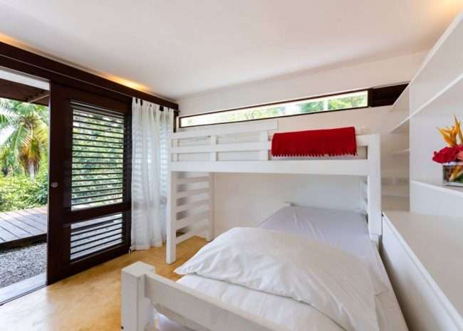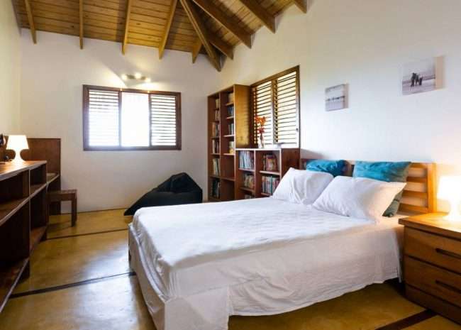 The Las Terrenas Home has 5 bedrooms, 3 bathrooms, one independent toilet, and an outdoor shower. The master room has a King size bed and a private terrace with a beautiful view of the valley and the sea. The kid's room accommodates 4 people and has a large bookcase.