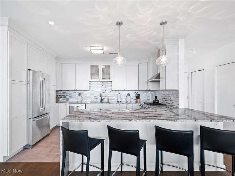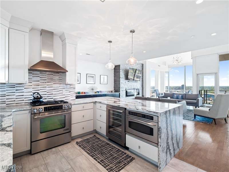 A remarkable penthouse in the coveted Pinnacle Condominiums, this is a masterpiece crafted for the most discerning buyer. Taken down to the studs, the entire home was impeccably renovated throughout and professionally designed (the only item that remained were the hardwood floors which were refinished). Boasting exquisite finishes across two levels, this light-filled residence features breathtaking views, soaring ceilings, floor-to-ceiling windows, fireplace (which didn't exist pre-renovation), two bedrooms, two and a half baths, and a balcony showcasing the loveliest sights in the City. The luxurious kitchen is a dream with its beautiful quartz countertops, white cabinetry, brilliant backsplash, gas range, and stainless Bosch, GE Profile, and JennAir appliances. Through its frosted glass doors, you'll enter the primary suite which was designed for ultimate rest and relaxation and offers premium views, plenty of closet space, and a sophisticated bath with double sinks and tiled walk-in shower. An elegant living room, spacious laundry room, glamorous half bath, and peaceful dining room - just perfect for entertaining - complete the first floor. Your private balcony provides THE VIEW of the lake, river, bridges, city, and sunset. Upstairs, via the impressive staircase, you'll find a guest bedroom and the perfect loft space to unwind. Attractive en suite bath has double sinks, tub, and walk-in shower. Two PRIME garage parking spaces come with this home. The sought-after Pinnacle building offers secure access, on-site concierge & security, state-of-the-art gym, dog run, and outdoor space with chairs, grills and a firepit. Dream homes are rare, and this iconic condominium represents the premium tier of renowned luxury.