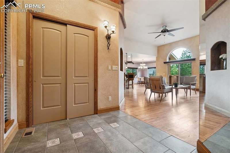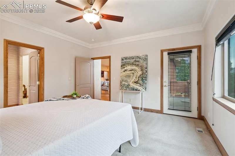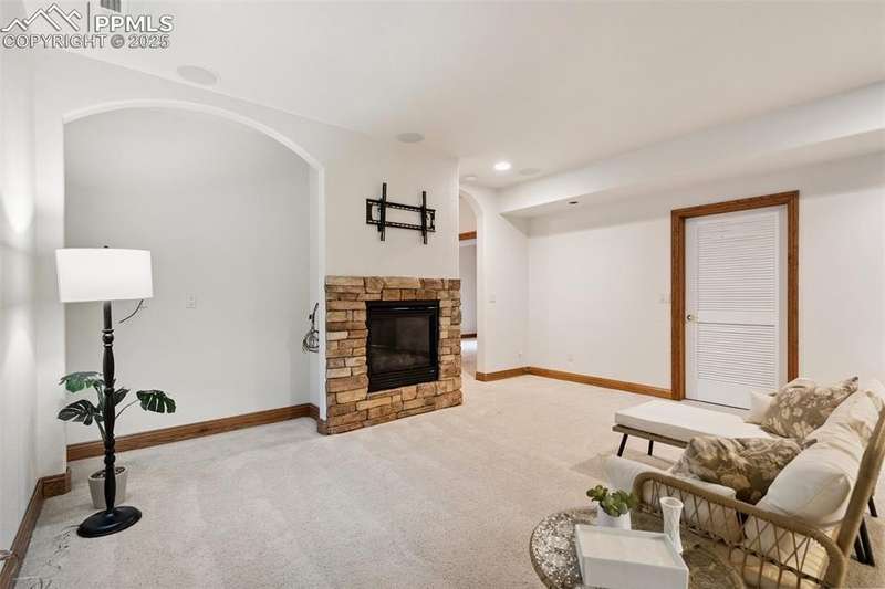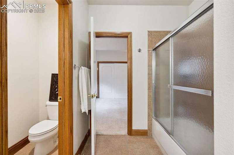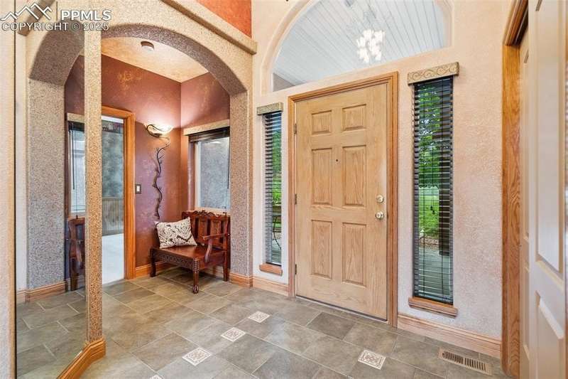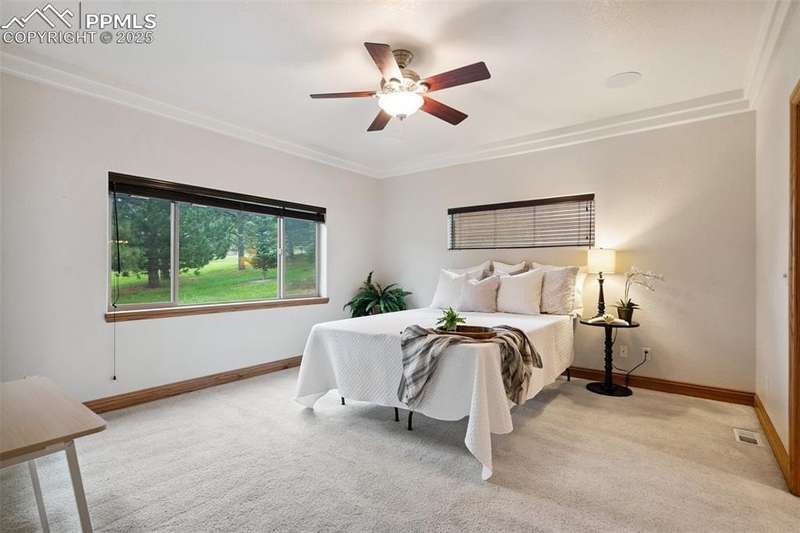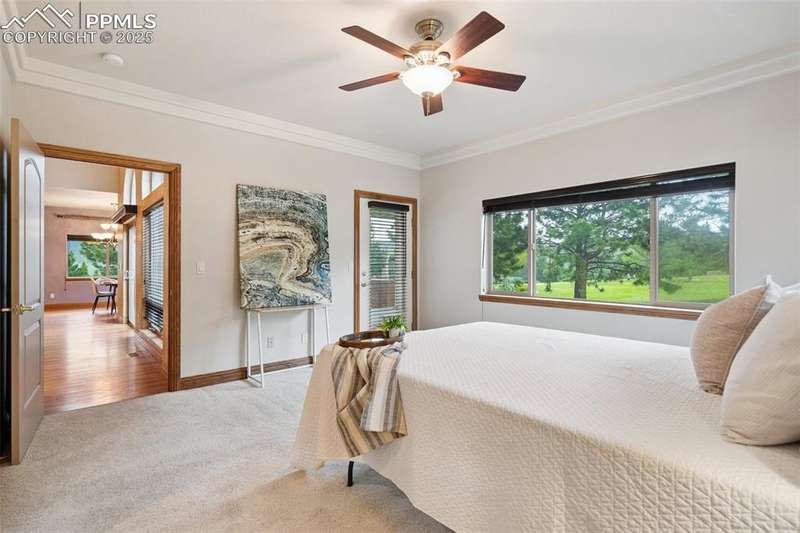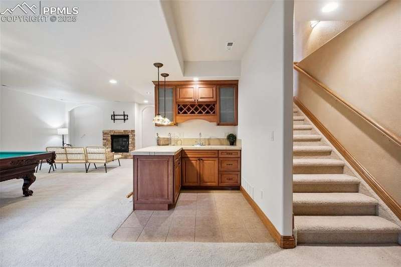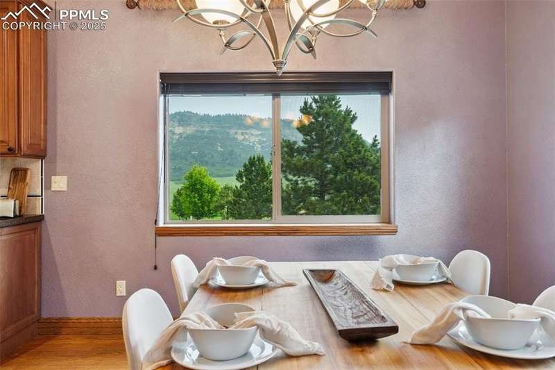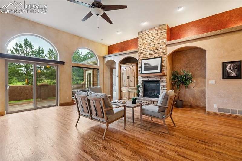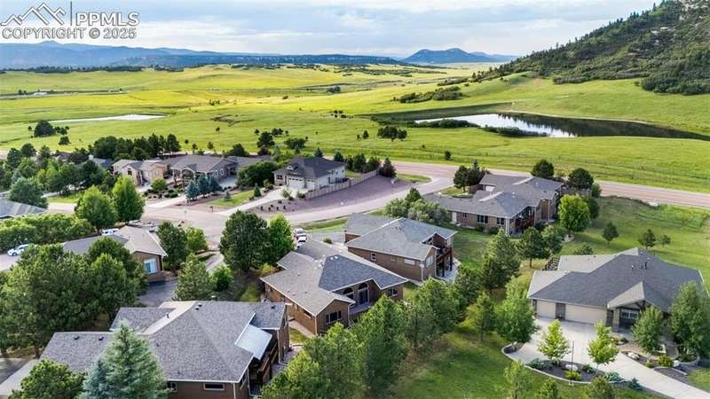 Nestled in the trees of the coveted High Pines neighborhood in Monument, this beautifully maintained patio home offers true main level living, a thoughtful floor plan, and the comfort of low maintenance living. With snow removal, lawn care, trash service handled by the HOA, this is the ultimate lock-and-leave lifestyle you have been waiting for. From the moment you walk in, you are welcomed by soaring ceilings, hardwood flooring, large picture windows, and a peaceful setting with views of Bald Mountain. There are zero steps from the front and garage doors, making entry into this home seamless and accessible. The great room, anchored by a cozy gas fireplace, flows into the gourmet kitchen featuring solid surface countertops, natural wood cabinetry, and a spacious island that is perfect for gathering. A walk-out from the living room through a sliding glass door leads to your private composite deck, ideal for morning coffee or an evening glass of wine among the trees. This ranch style home offers two bedrooms on the main level, including a spacious primary suite with a spa-like five piece bath, jetted tub, and walk-in closet. The primary suite also features a private door leading directly to the patio, perfect for quiet mornings or relaxing evenings outside. Head downstairs to discover a generous family room with a second gas fireplace, a wet bar, and two additional bedrooms, each with walk-in closets and one with a shared en suite bath. There is even extra storage and flex space for hobbies, guests, or gym equipment. Located just minutes from I-25, commuting to Denver or Colorado Springs is a breeze. Thoughtfully updated and lovingly cared for by its owners, this home is ready for you. This is Monument living at its best: in the trees, mountain views, and room for everyone.