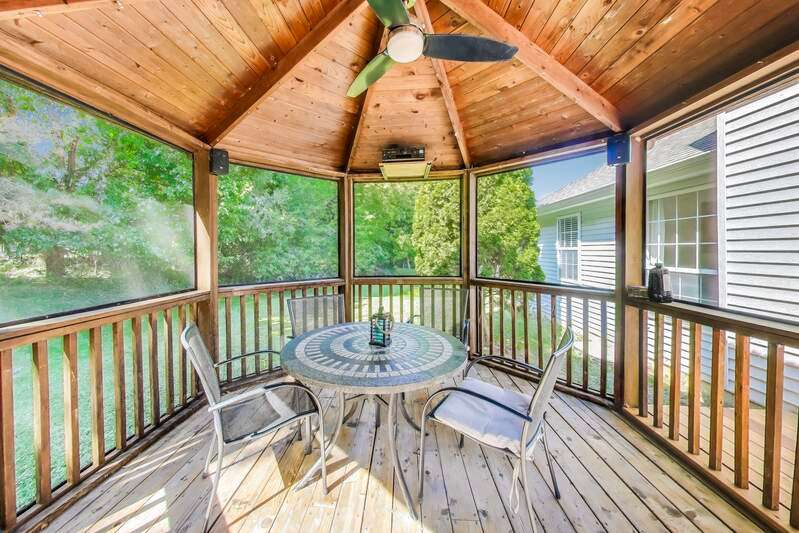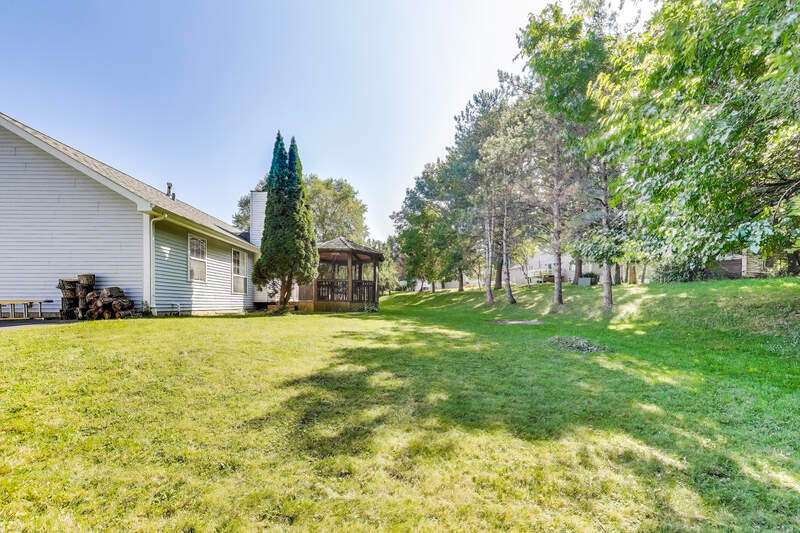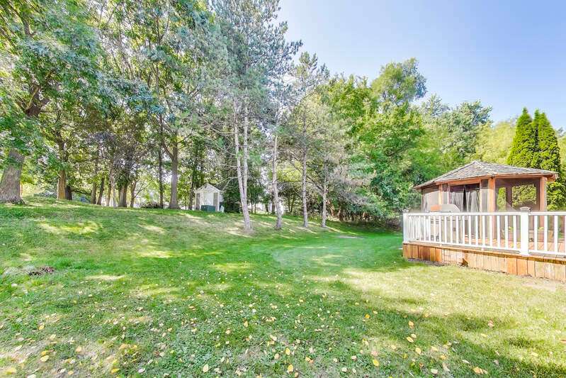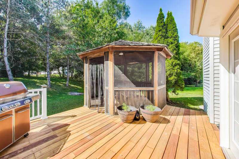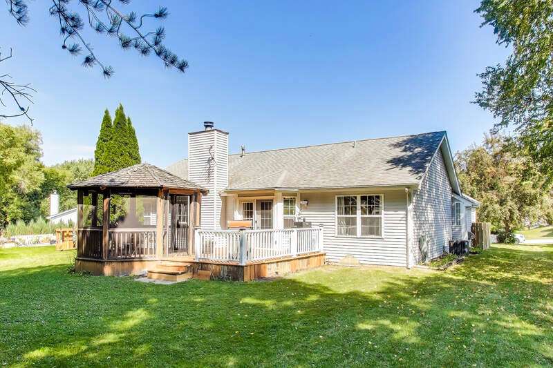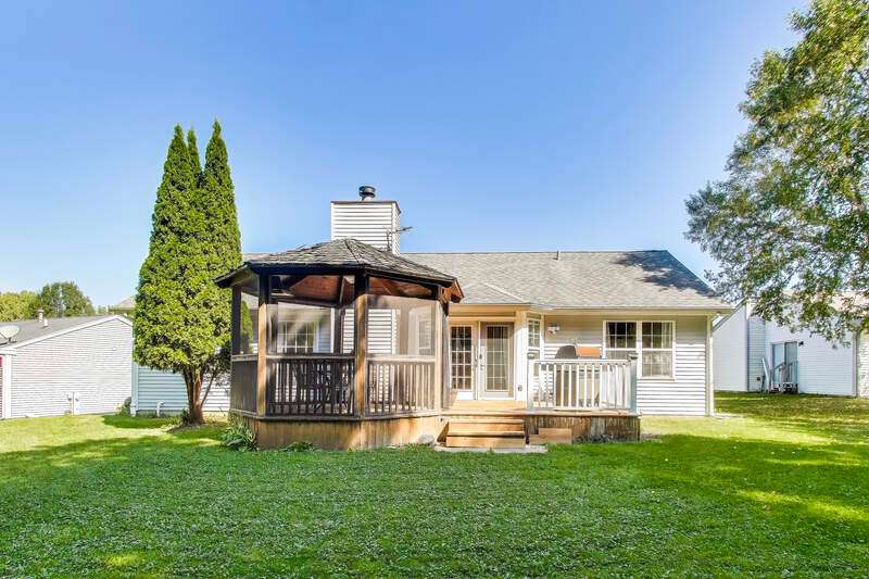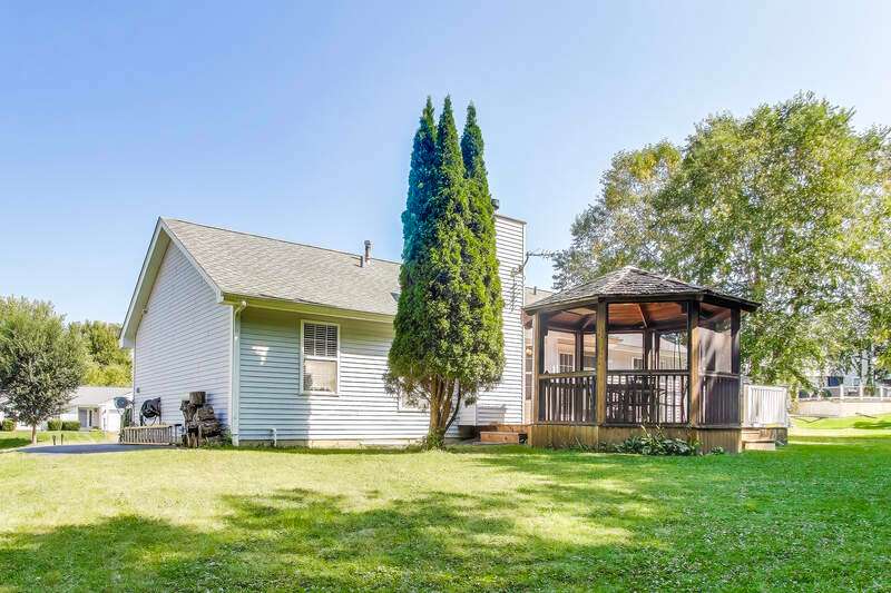 Welcome to this beautiful and ready to move in ranch. This spacious 3-bedroom, 2-bath home offers the perfect blend of comfort and style. Enjoy an open and airy feel throughout with cathedral ceilings and vaulted living room with gas fireplace. Kitchen features rich cherry cabinetry, large breakfast bar and extra cabinet storage - ideal for everyday living and entertaining. Beautiful wood and travertine flooring add warmth and elegance throughout. The primary suite includes walkin closet and a large bath with a deep soaker tub, while two additional bedrooms and a full hall bath complete the main floor. The finished basement provides abundant living space, perfect for a recreation room, home office, or guest area. Step outside to a private deck overlooking the adjacent conservation area and enjoy peaceful views from the screened gazebo. 2-car garage with side drive apron. This home is move-in ready - don't miss it!