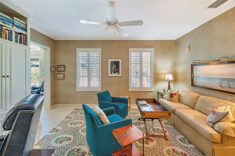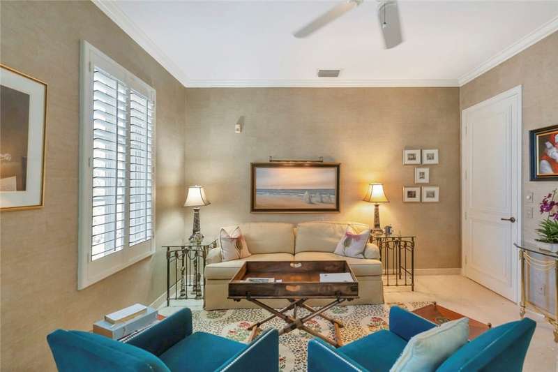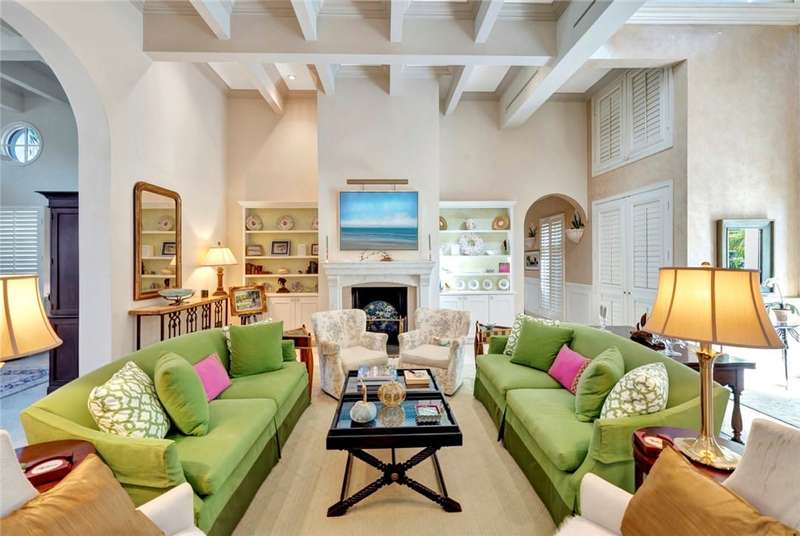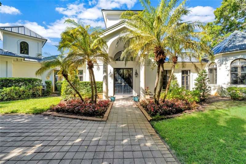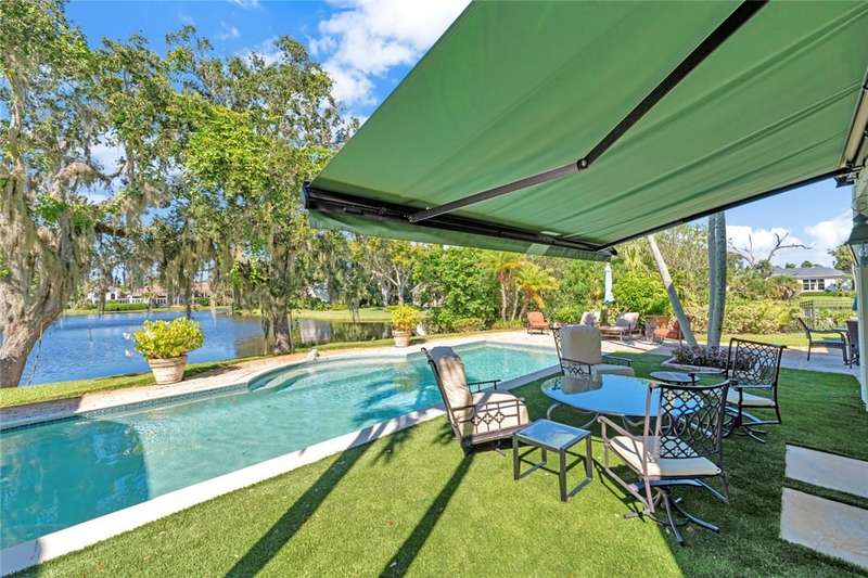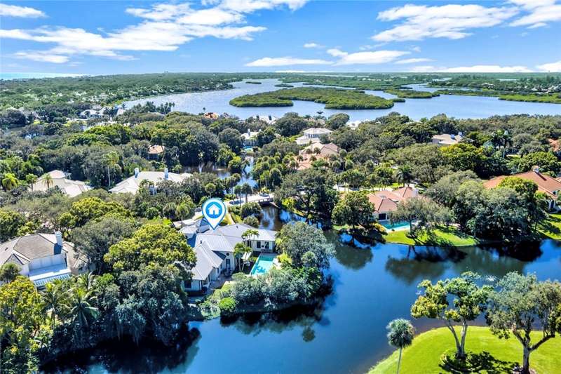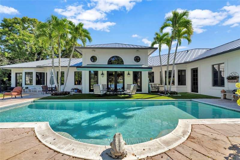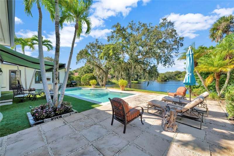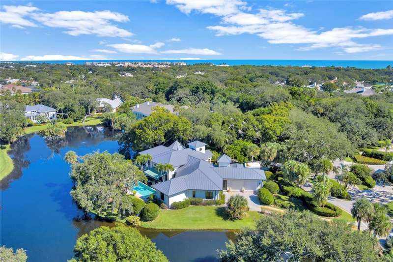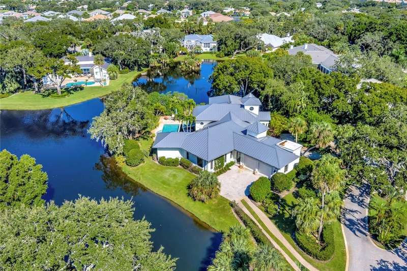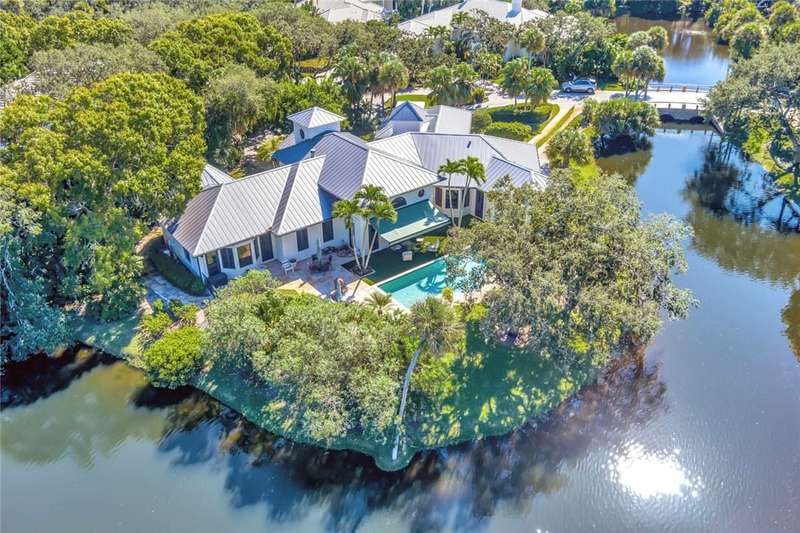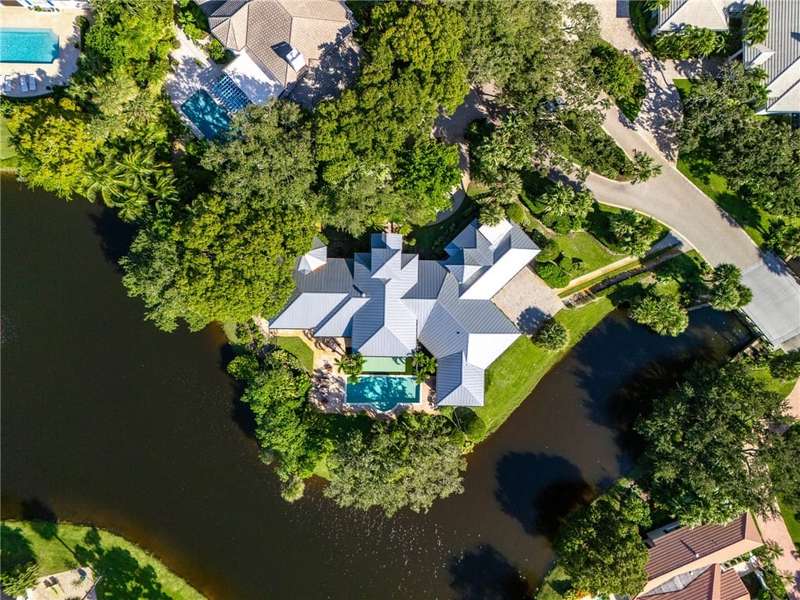 Stunning lake views on 3 sides & beautifully landscaped, this elegant home sits on over half an acre. Features include a living room w/gas fireplace, formal dining room & a bright family room overlooking the pool & lake. The spacious kitchen includes a breakfast nook & the 4th bedroom includes a built in desk making it an ideal office. Enjoy a private pool & lovely backyard. Updates include a 2024 roof & 2 2024 A/C units. Amenities such as a gated community, tennis & pickleball. Prime location close to beach access, Jungle Trail & central beach dining & shopping. Sizes approx./subj. to error.