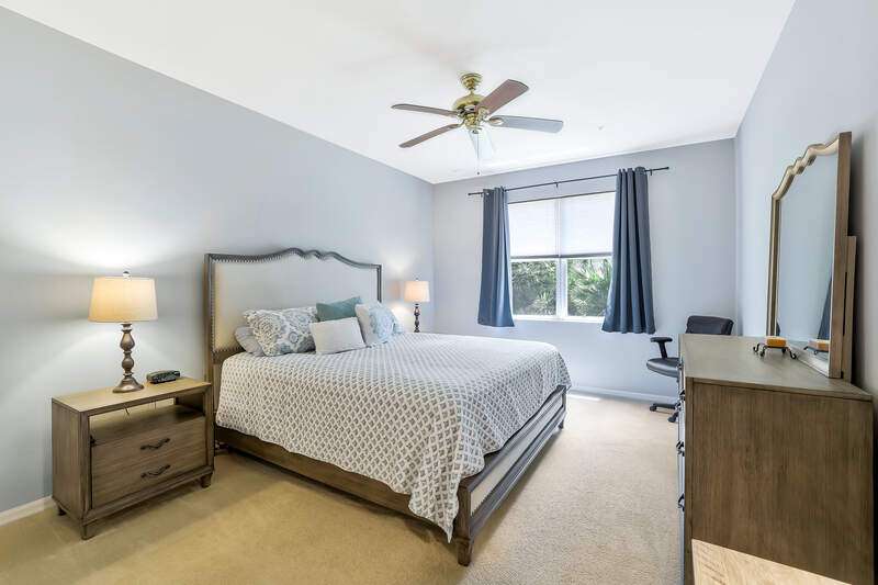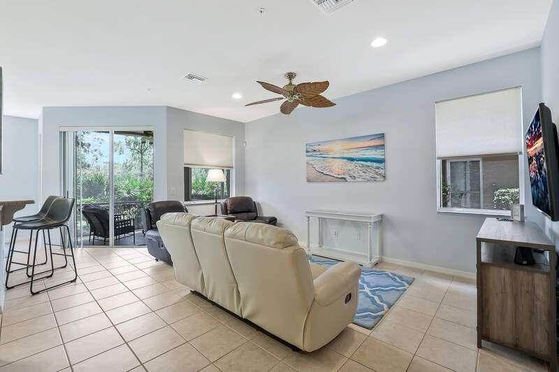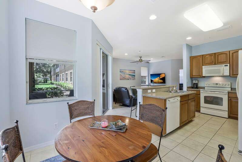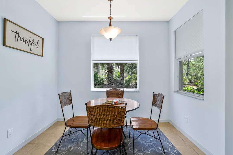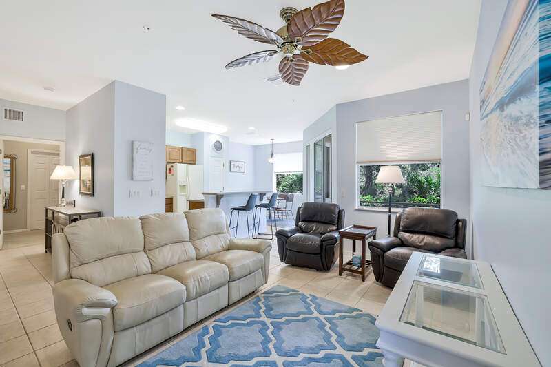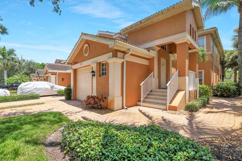 This first-floor, end unit partially furnished condo is everything you could want in Florida living plus a wonderful new PRICE IMPROVEMENT. Featuring 3 bedrooms and 2 baths, this light-filled home offers an open-concept layout ideal for both relaxing and entertaining. The spacious kitchen includes an eat-in area, island with seating, solid surface countertops, and warm maple raised-panel cabinetry. The bright living area opens to a screened patio overlooking an east-facing preserve for quiet morning views. The generous primary suite includes dual vanities, a soaking tub, walk-in shower, and large walk-in closet. One bedroom is tucked away for extra privacy from the main living area. Additionally, this property features a convenient one-car garage. Located in Marbella at Spanish Wells, residents enjoy two community pools with kitchen and grilling areas, plus optional access to Spanish Wells Golf & Country Club with 27 holes of golf, tennis, pickleball, fitness, and dining. HOA covers everything but electric. Just minutes to beaches, dining, and shopping.