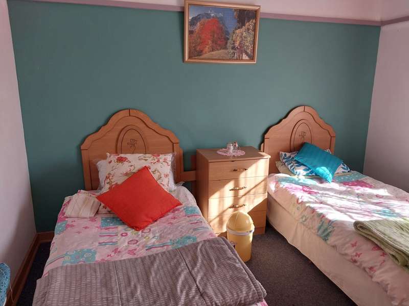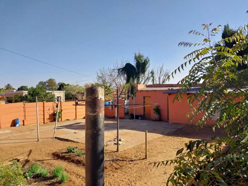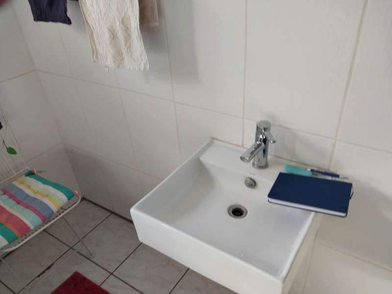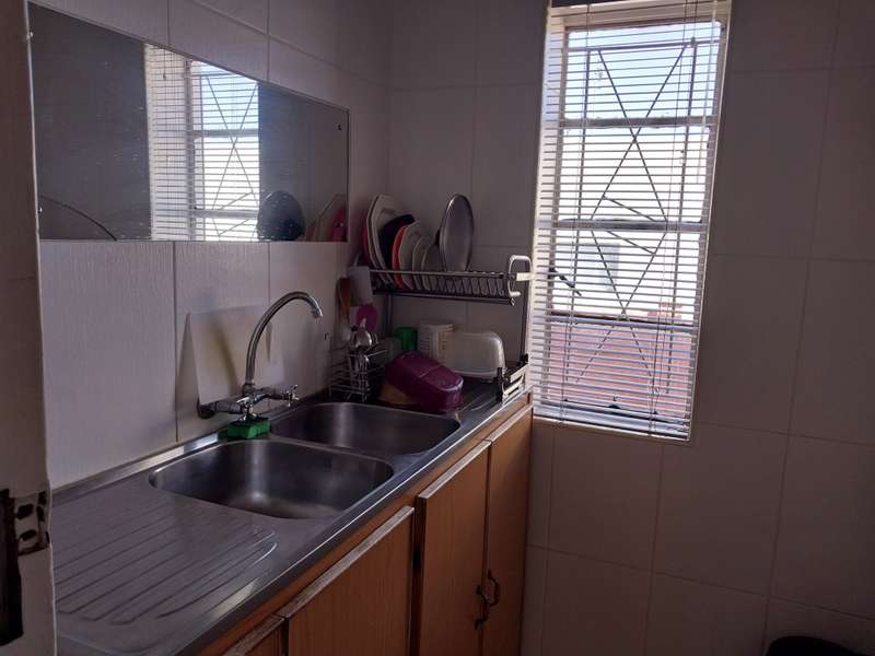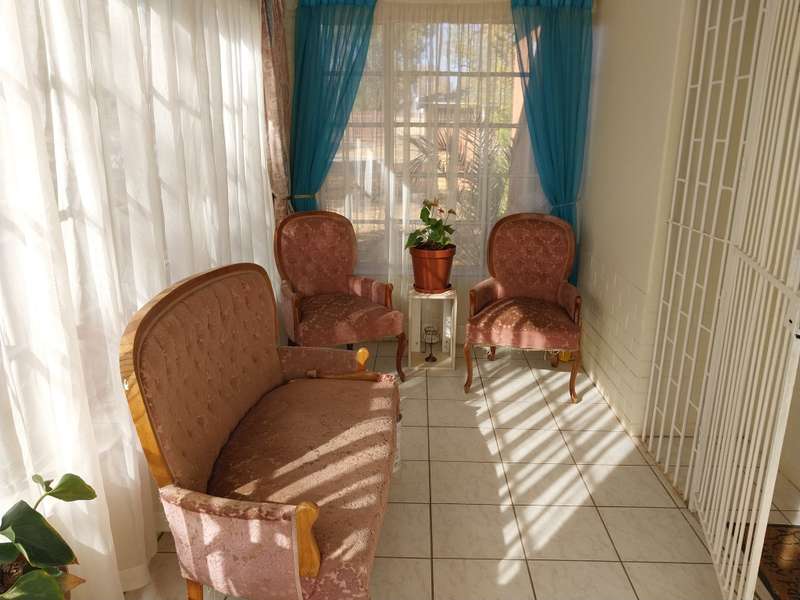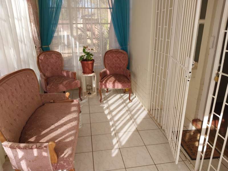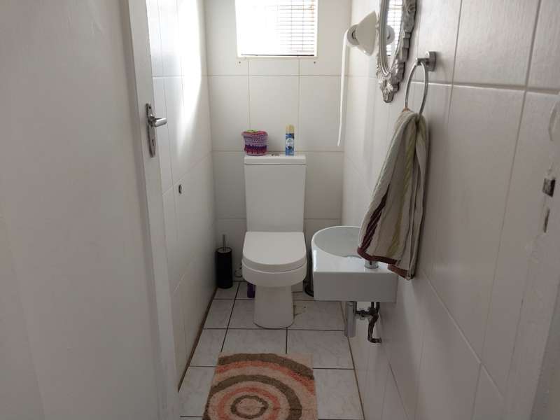 3 Bedroom house with cupboards (2 with wooden floors and 1 with carpet) 1.5 bathrooms bath , basin ,toilet with hand shower separate toilet with basin Lounge dining room entrance hall kitchen cupboards with stove Laundry Stoep Double garage outside rooms 2 plus toilet close porch at the back Property is walled on all sides. Call to view