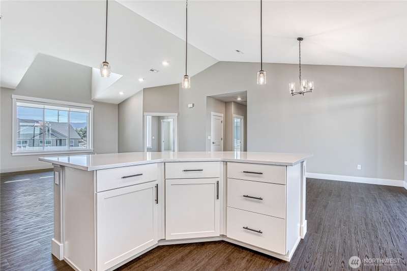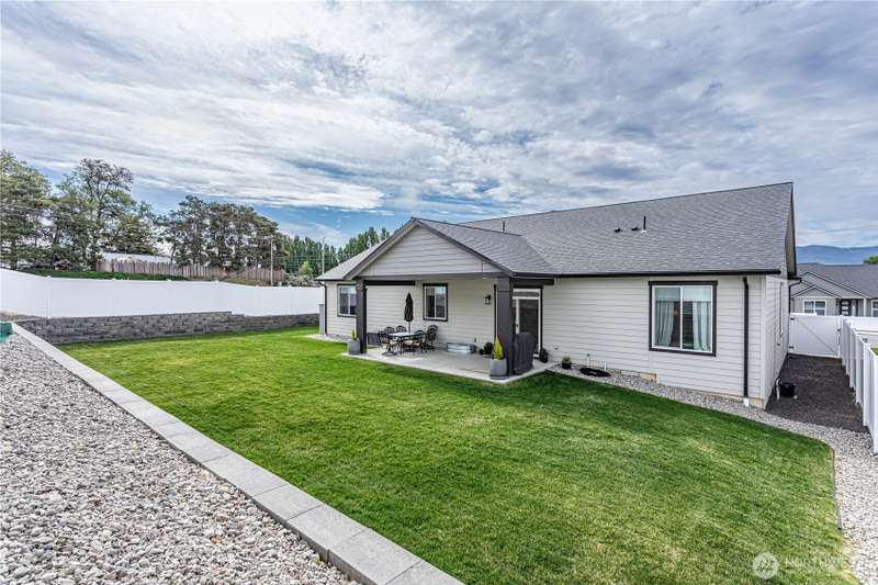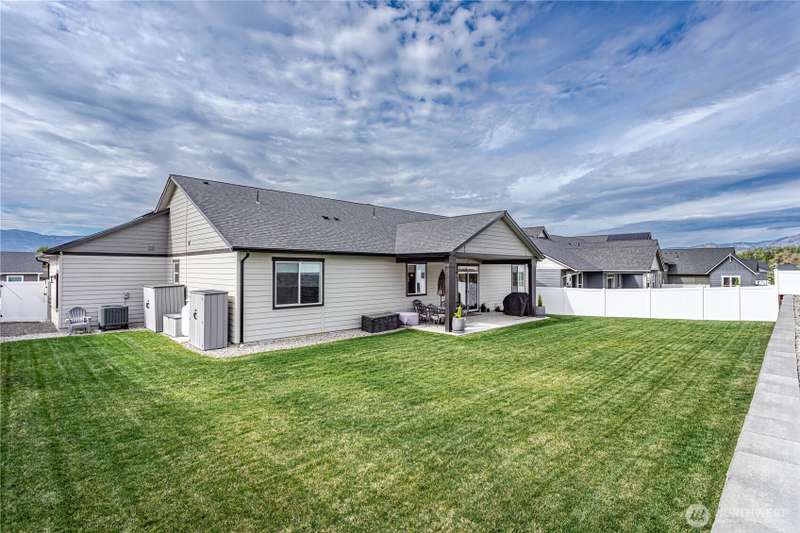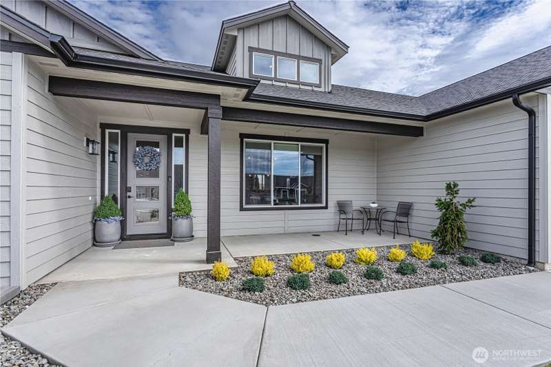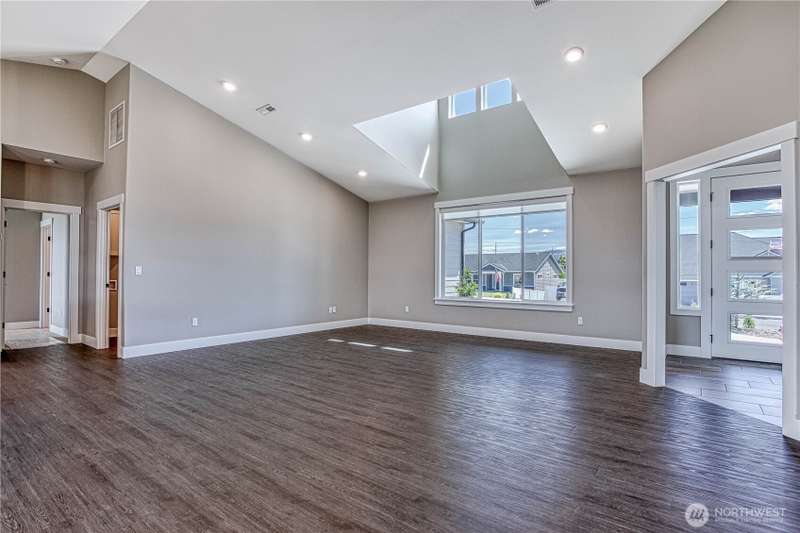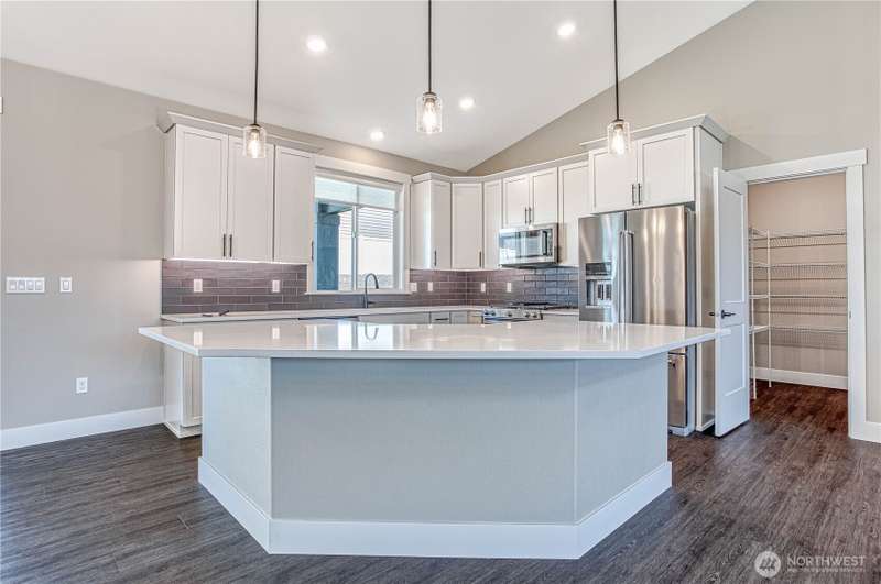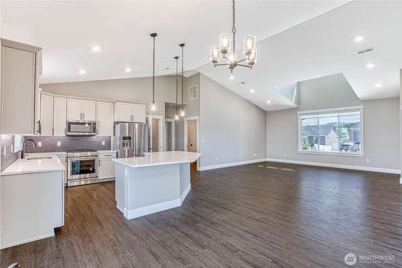 Beautifully designed 4 bedroom, 2 bath home with 2,093 sqft of open living space. A large dormer and vaulted 9 ft ceilings create an airy feel throughout the great room, dining, and kitchen. Kitchen features a gas range, oversized island with seating, walk-in pantry, and under-cabinet lighting. The primary suite offers a 5-piece bath w a custom-tiled shower and large walk-in closet. Upgrades throughout including Moen fixtures, LVP and ceramic tile flooring, and a laundry room with storage. Enjoy the covered patio plumbed with gas BBQ hookup, oversized 3-car garage, and owned energy-saving solar panels.