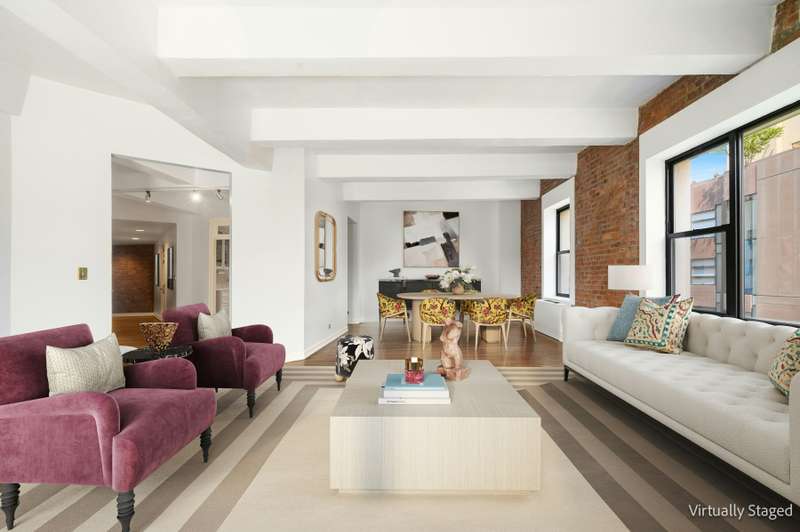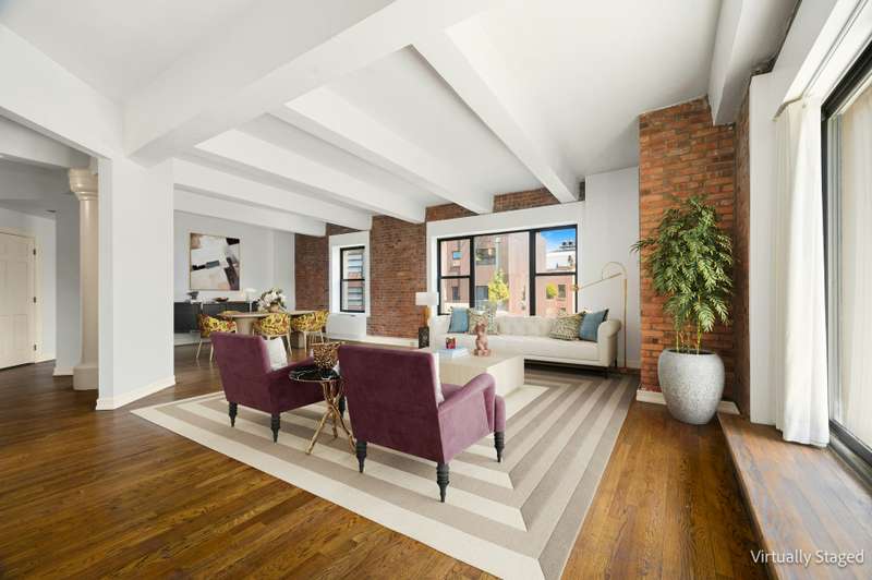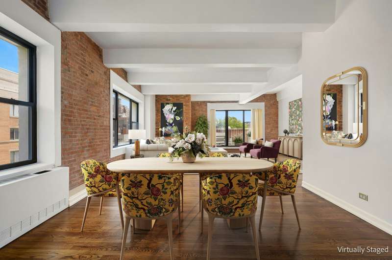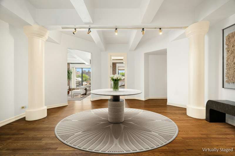 This expansive and flexible loft in a prime West Village location offers space, sunlight, and skyline views. Perfectly suited for a grand primary suite, a large home office or second bedroom, and a potential third bedroom area. Enter through a distinctive octagonal receiving foyer, featuring classic cast iron columns and convenient access to all main rooms. The loft enjoys bright eastern light with open sunrise views across the West Village and toward the midtown skyline. The recently renovated galley kitchen is both elegant and functional, with ample marble counter space and plentiful cabinetry. Two spirited, colorful bathrooms feature coordinated wallpaper and matching sinks for a bold, designer touch.