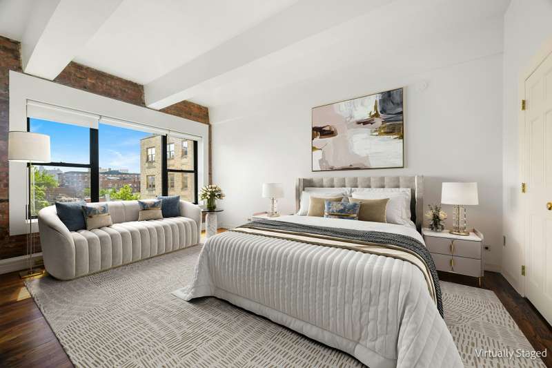 The oversized great room (22ft x 32ft) boasts 10ft high beamed ceilings and both eastern and northern exposures. The large primary suite (12ft x 18ft) includes two spacious closets and en suite bath. A secondary bedroom or home office offers two full walls of built-in bookshelves, ideal for remote work or a personal library. The energizing morning light/sunrise in both bedrooms gives a great start to the day. Additional highlights include a private balcony (20ft x 6.5ft) off the living room, a large laundry and storage room, central AC in each room and beautiful hardwood oak floors throughout.