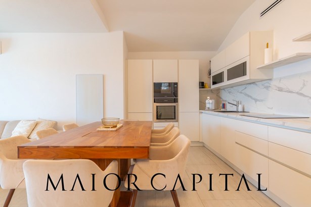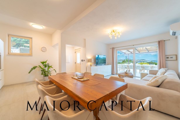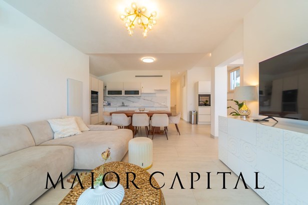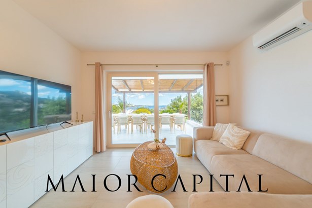 The sea-view living area is the vibrant heart of the home, featuring an open-plan kitchen and direct access to a large panoramic terrace with heated infinity pool, BBQ area, covered dining space, and panoramic solarium.