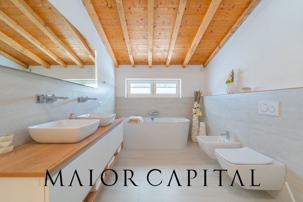 A refined central corridor enhances the sense of quiet and seclusion between rooms, while the master bathroom, with exposed beams, freestanding bathtub, walk-in shower and natural finishes, is a serene wellness retreat.