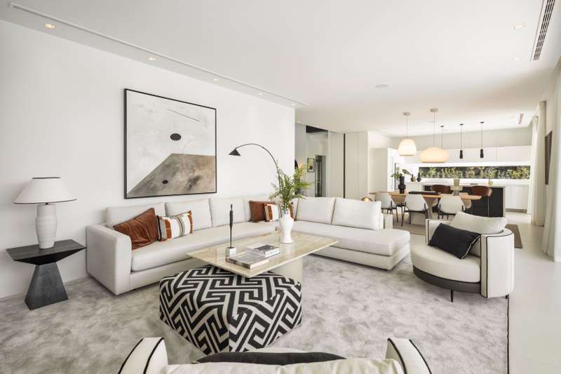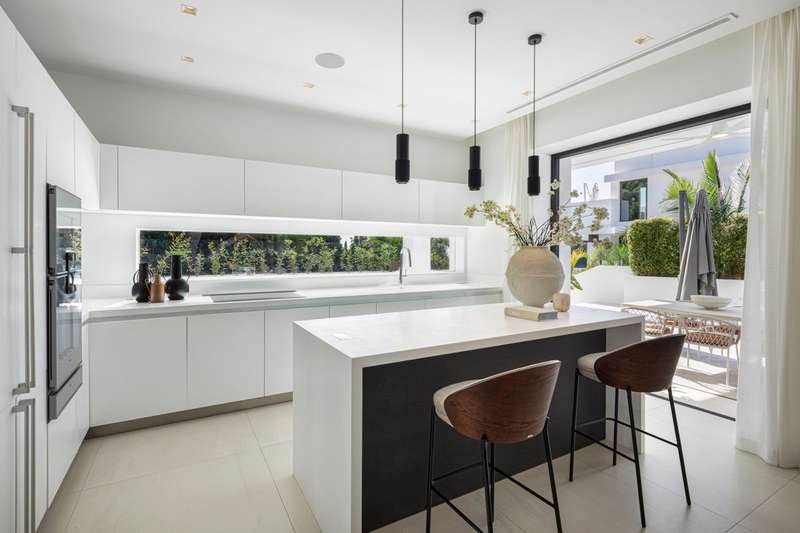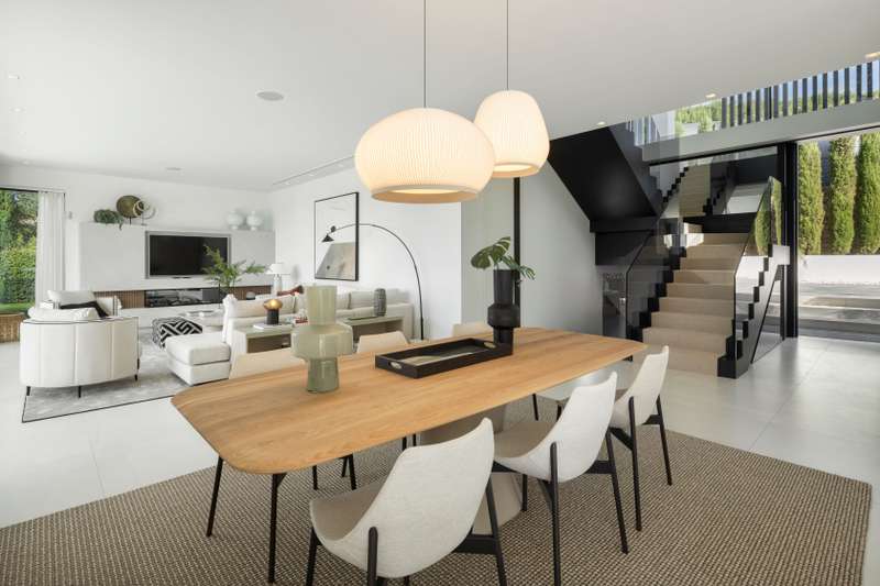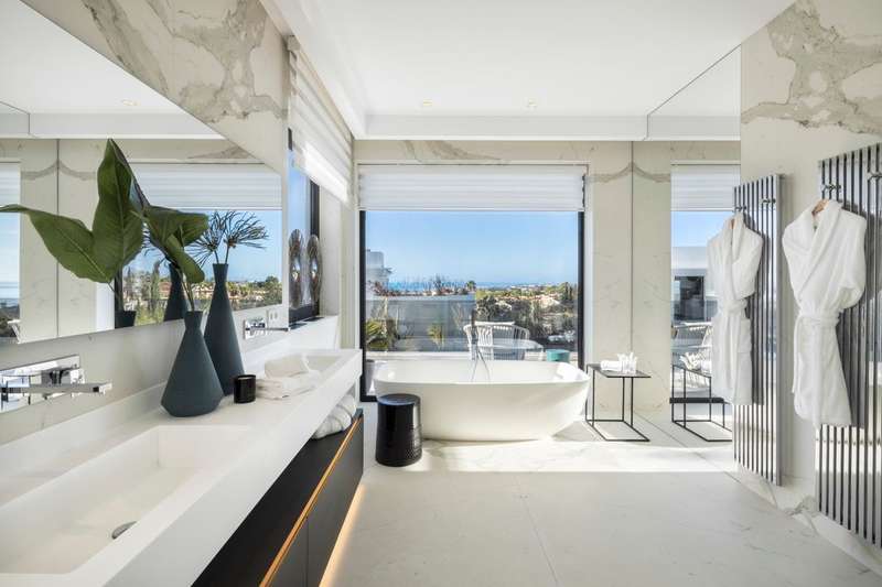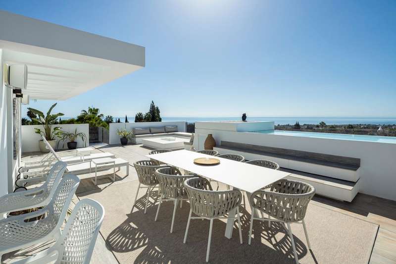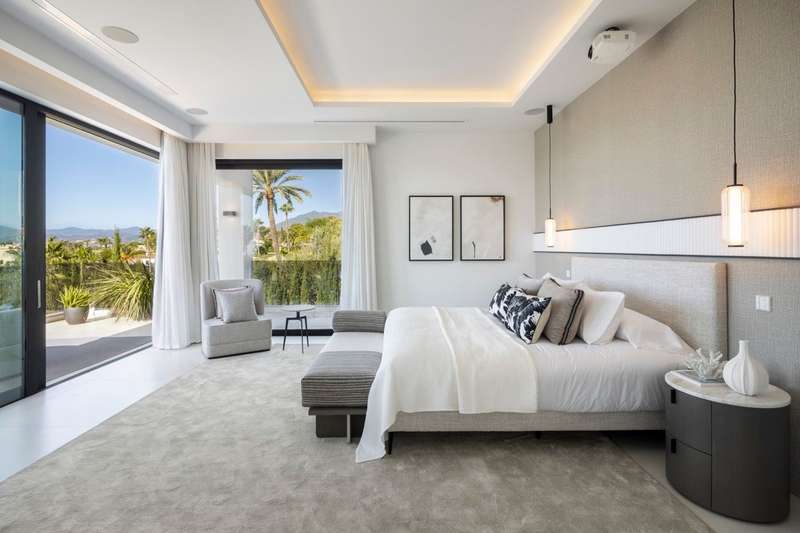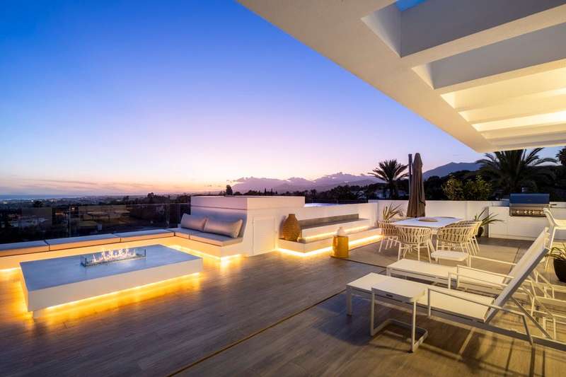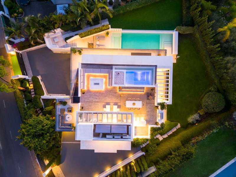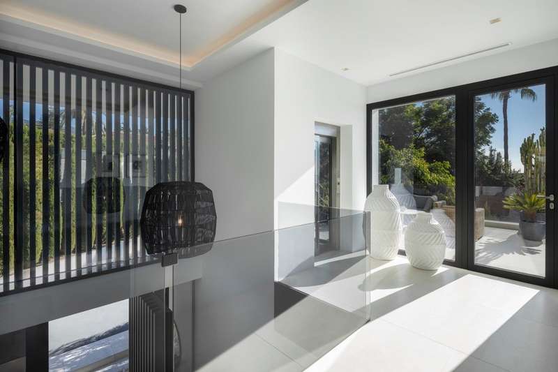 Stunning modern luxury villa in Nagueles, one of the top areas of Marbella Golden Mile, offering easy access to Marbella centre, 10 minutes drive from Puerto Banus. The property is built to highest specifications with great attention to detail and using top quality materials and installations. The villa is distributed over 3 levels including basement, plus a spacious solarium roof terrace. Basement level includes private garage with turntable mechanism, great entertainment area with TV/cinema room, wine cellar, lounge; nice size staff / guest bedroom with en-suite bathroom and also a laundry room, guest WC and technical room. Entrance level comprises of entrance hall, guest WC, 1 bedroom suite, spacious lounge with dining area and open plan kitchen, large terrace leading to the private pool. Master bedroom is located on the first floor and includes a large en-suite bathroom and dressing room. First floor also includes an additional bedroom suite. Top terrace of 98 m2 offers p
