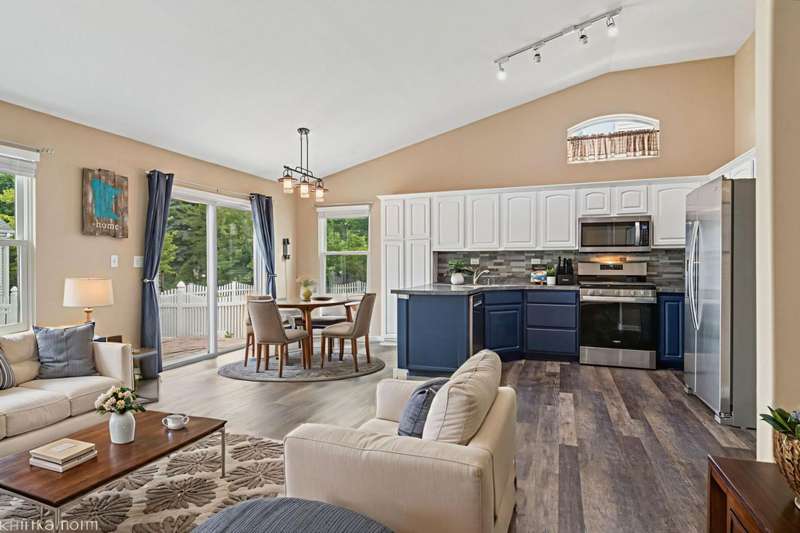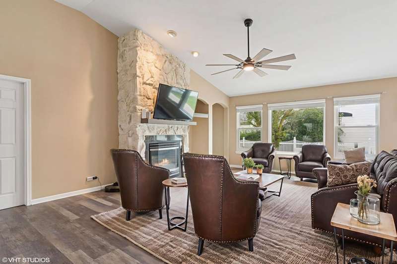 Stunning ranch home nestled in desirable Orchard Valley of Aurora. 3 bed, 2 full bath home offers an open floor plan, soaring vaulted ceilings, luxury vinyl plank flooring, and neutral decor throughout. Sunfilled kitchen features white and navy cabinetry, tumbled stone backsplash and all stainless steel appliances. Sliding door off dining room leads to the oversized stone paver patio and private backyard. PVC maintenance free fence and irrigation system complete this space. Fantastic family room/Great room anchored with floor to ceiling stone fireplace and wall of windows overlooking the backyard. Sleek primary suite with striking accent wall, custom walk-in closet and updated private bath; dual vanity, soaking tub, tile surround walk-in shower, updated lighting and water closet. 2nd bedroom offers custom closet and situated next to the other updated full bath. Bath features tub/shower with tumbled Subway tile surround, farmhouse vanity, Quartz countertop and updated fixtures. 3rd bedroom/den/office with double doors provides versatility for any buyer. Conveniently located first floor laundry room making this true ranch living...newer washer/dryer and utility tub. Both front closet and closet off the garage have been customized with beautiful shiplap, wood bench and hooks. Unfinished partial basement with a crawl yields tons of storage space or the opportunity to customize for one's specific needs. Mechanical updates: A/C (2024) and furnace (2023). The community is situated next to the Orchard Valley Golf Course and is super easy access to I-88. Welcome Home!