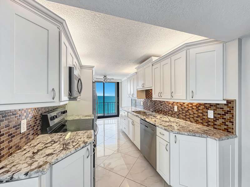 It's all about the views - enjoy the crystal blue ocean from every room in this front corner unit. The 2BR / 2BA split BR plan features a neutral color palette & polished ceramic tile throughout. Updated kitchen w/ granite counters, stylish backsplash & stainless appliances. Small nook off kitchen opens on to the balcony & overlooks the Atlantic - perfect location for morning coffee or cocktails. Large laundry room w/ washer dryer inside unit. Impact sliders throughout. Cote D'Azur has fob access to front gate & each tower. On-site manager M-F. Pool, grills & large outdoor social area between the two towers. Gym, community room, library & tennis and pickleball courts. 15 minutes to world class shopping, dining.