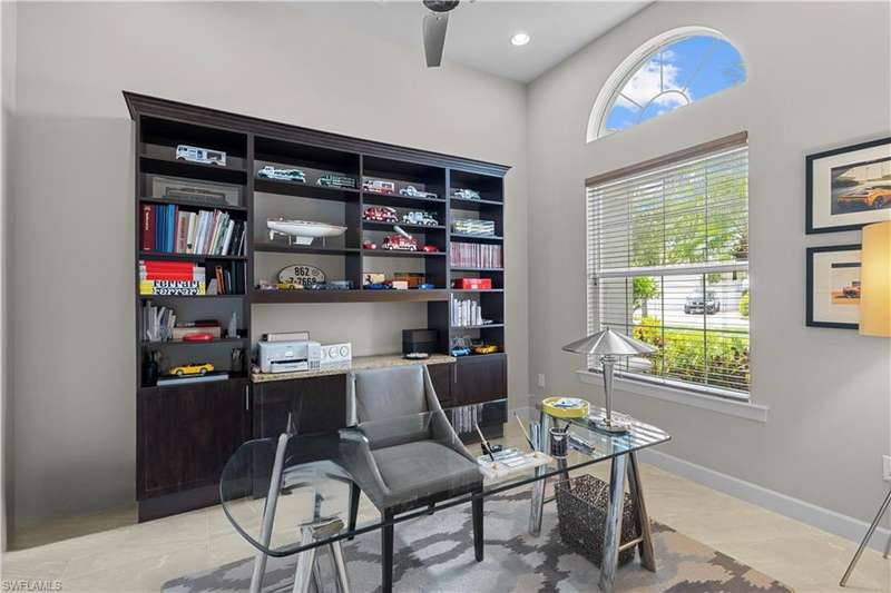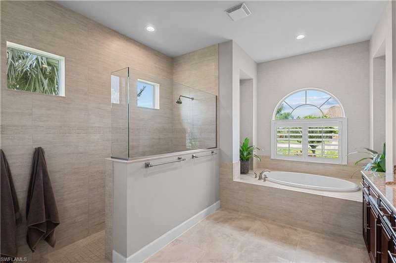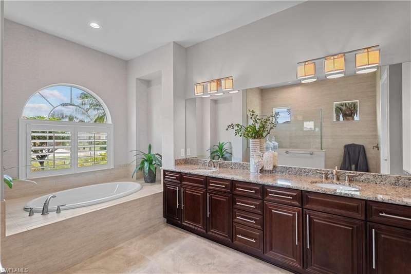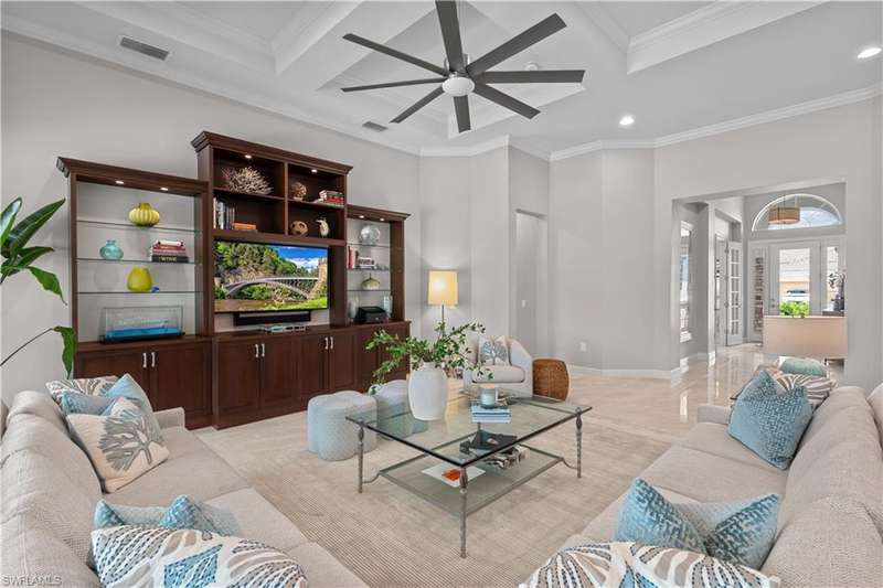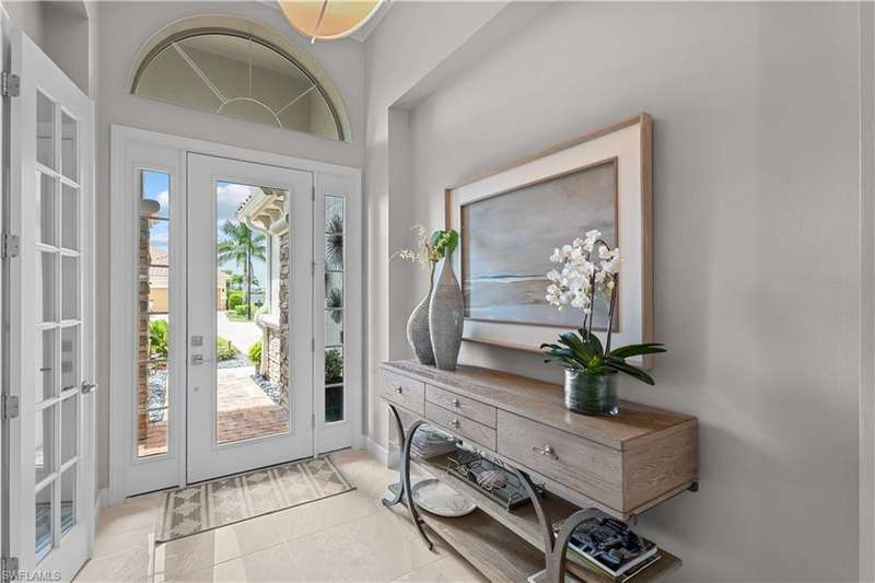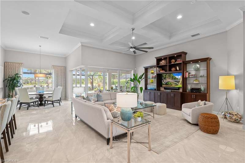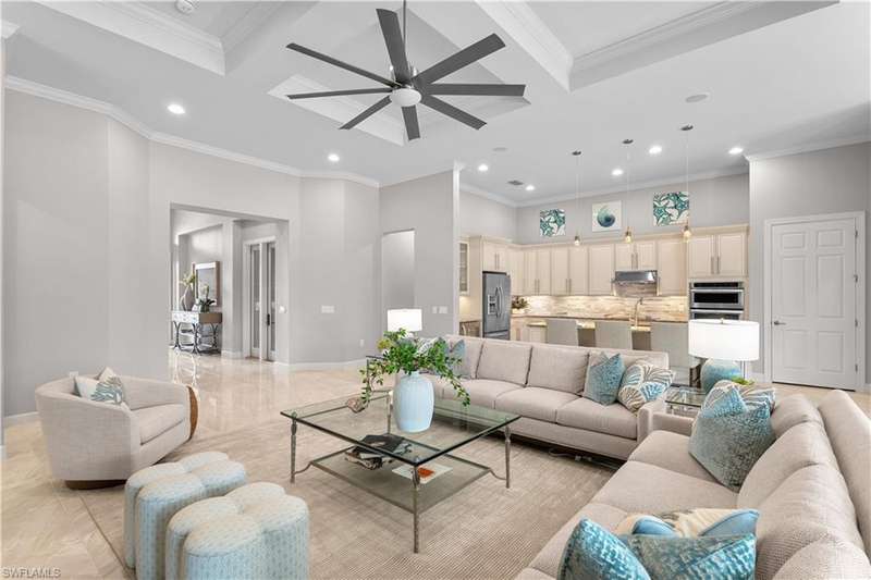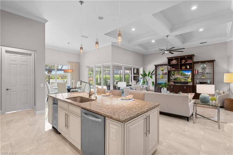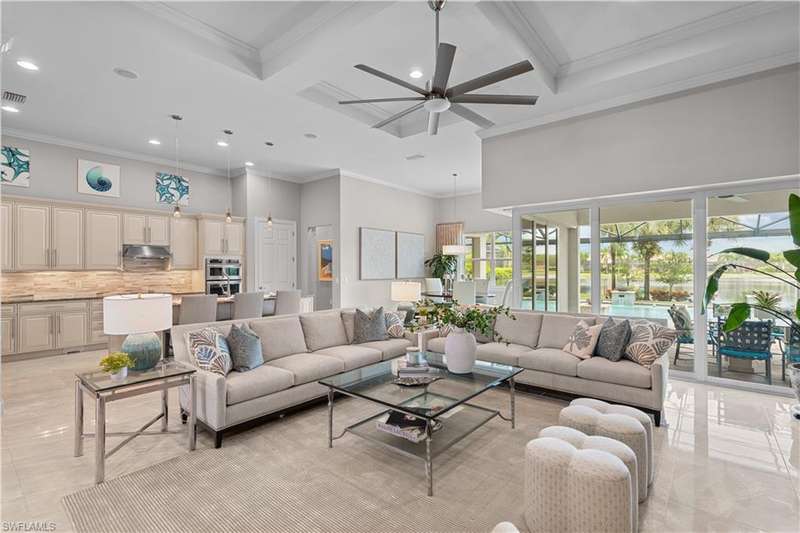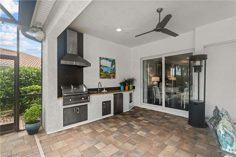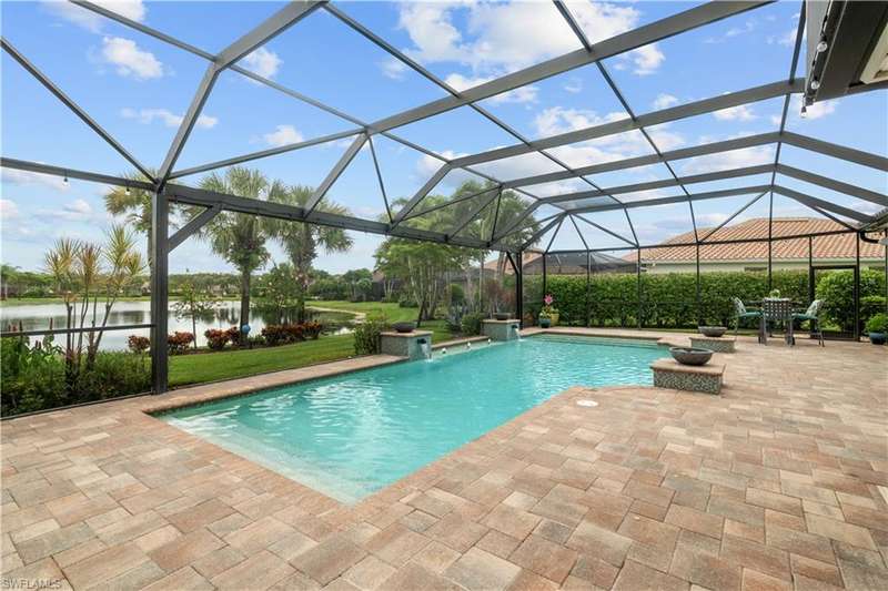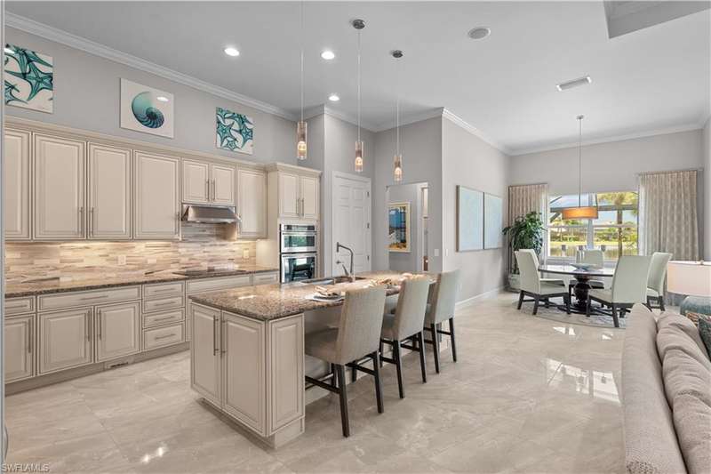 Welcome to this stunning, light-filled and ever so popular "Windsor" floorplan home, featuring 4 bedrooms plus den, 3 full baths, and a spacious 3-car garage. Nestled on an oversized, pie shaped lot with an extra long driveway, this home offers a wide-open Great Room layout that s perfect for entertaining and everyday living. As you step inside, you ll be greeted by a bright and airy atmosphere, highlighted by zero-corner pocketing sliding glass doors to the lanai that seamlessly connect the indoor and outdoor living spaces. The sliding doors lead to the expansive lanai, where you'll find an outdoor kitchen and an oversized electric and solar heated salt water pool with picture window screen cage overlooking the lake your personal oasis. The chef s kitchen is a dream, complete with raised panel cabinetry, KitchenAid appliances including wall oven, convection microwave, and beverage cooler. The large eat-in kitchen area offers the perfect spot to gather and enjoy meals with family and