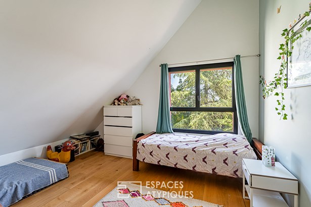 The tone is set from the moment you enter: generous volumes, raw materials, and industrial touches blend seamlessly with the original features. The living area is divided into several spaces: a beautiful kitchen opening onto a living room or dining room, which extends into a TV lounge equipped with an integrated home theater system and a double-sided glass-fronted wood-burning stove. The entire space is enhanced by a cathedral ceiling of over 5 meters and an impressive glass roof, designed by a skilled ironworker, facing the garden. Natural light floods in generously thanks to a dual aspect and architectural lighting designed by a lighting designer. A functional entrance with custom-made storage, a laundry room, and a guest toilet complete this level designed for a fluid and comfortable family life.