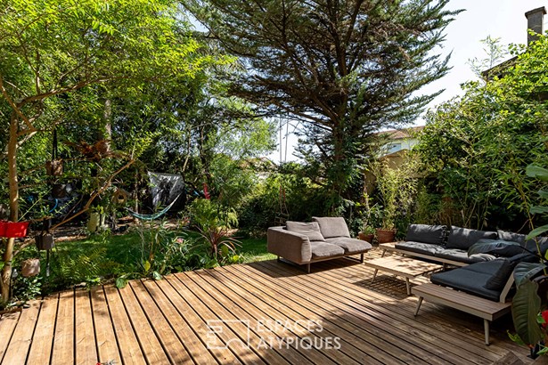 Outdoors, three planted terraces extend the living spaces. The main terrace, facing south, is accessible from the gate and creates a vacation home feel. The carefully landscaped 150 m2 garden features two other wooden terraces, all private. A true haven of nature in a sought-after urban setting.