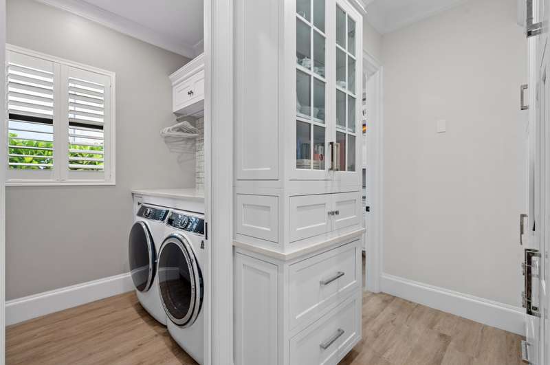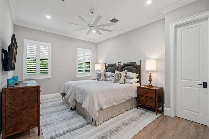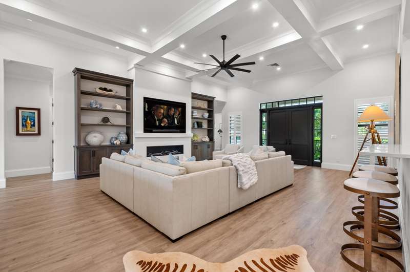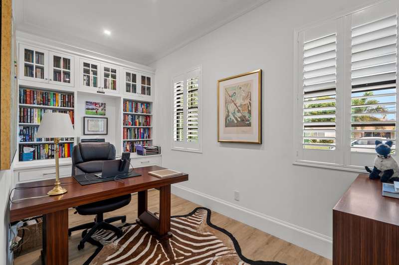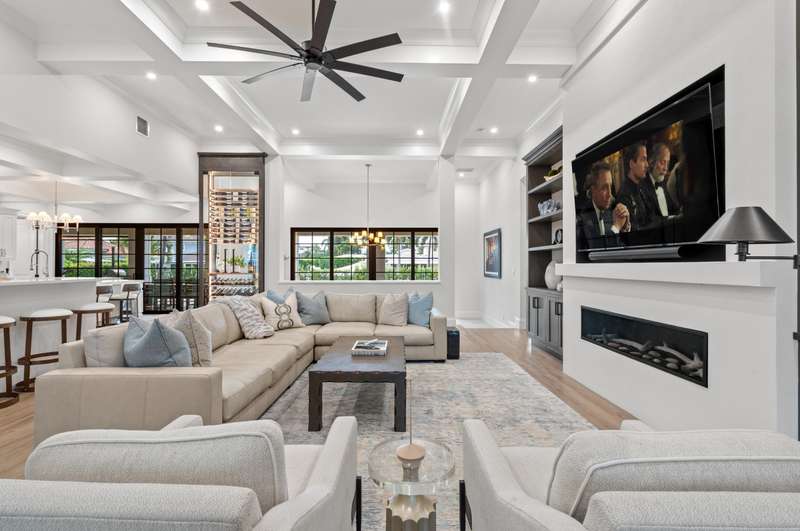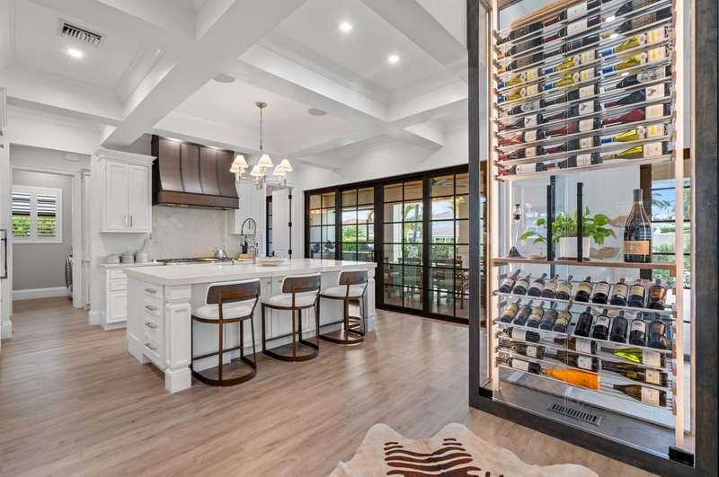 Chic 2022-built estate in desirable Tropic Isle, Delray Beach, offers 90 feet on a canal with a dock off the Intracoastal. Interior details include a chic living room with a linear gas fireplace and full bar, a stunning glass-encased wine display, gourmet cook-island kitchen with Thermador appliances, a luxurious pool-view primary suite, two offices and a poolside loggia and summer kitchen.