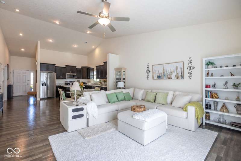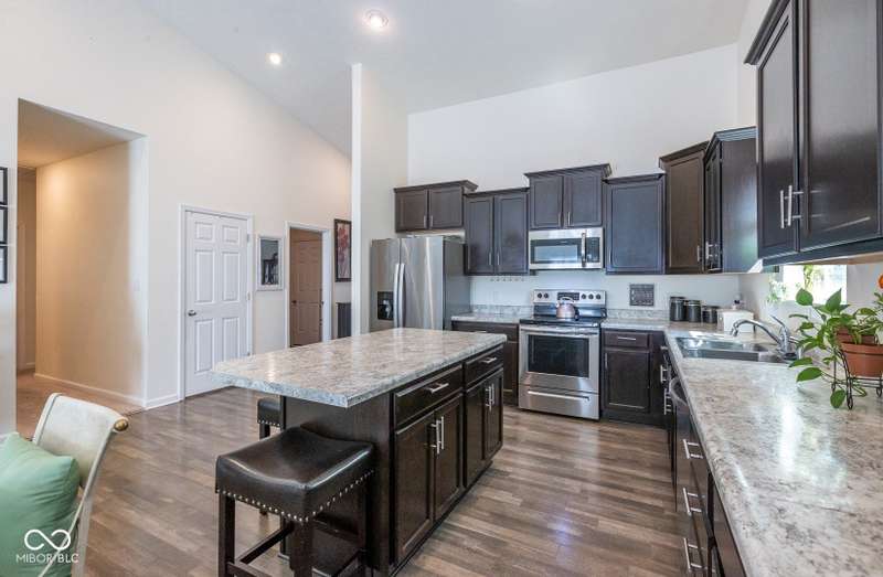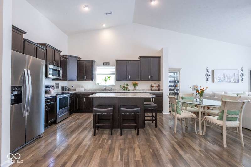 Welcome to 6607 Laurelwood Drive in Pendleton's sought-after Maple Trails community! Built in 2020, this stylish ranch home combines modern comfort with thoughtful design. Inside, the open-concept layout creates an inviting flow from the kitchen into the vaulted great room-perfect for everyday living and entertaining. The kitchen features a galley island with breakfast bar seating, stainless steel appliances, abundant cabinetry, and a convenient pantry. The primary suite is a true retreat with a tray ceiling and the upgraded deluxe garden bath includes dual sinks, a soaking tub, a separate shower, and a 2-foot extension that provides added space. From the ensuite, you'll find access to a generous walk-in closet. Two additional bedrooms and a full bath offer plenty of room for family or guests. Enjoy morning coffee on the covered front porch or host gatherings on the back patio. Durable vinyl flooring runs through the foyer, kitchen, dining area, and great room, while the bedrooms are comfortably carpeted. A washer and dryer are included for added convenience. Maple Trails offers jogging and walking paths along with common area maintenance and snow removal, and the location provides quick access to I-69 and US-36. Come see all this home has to offer!