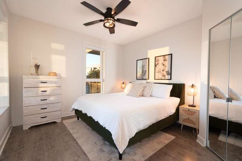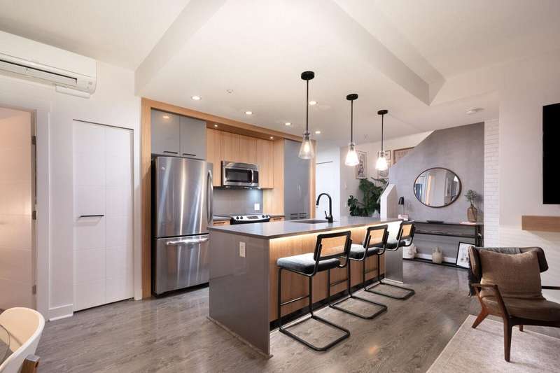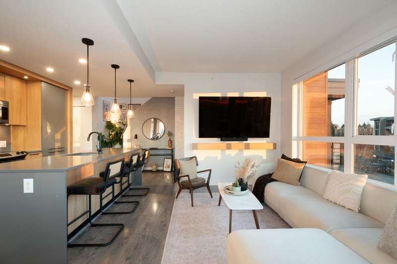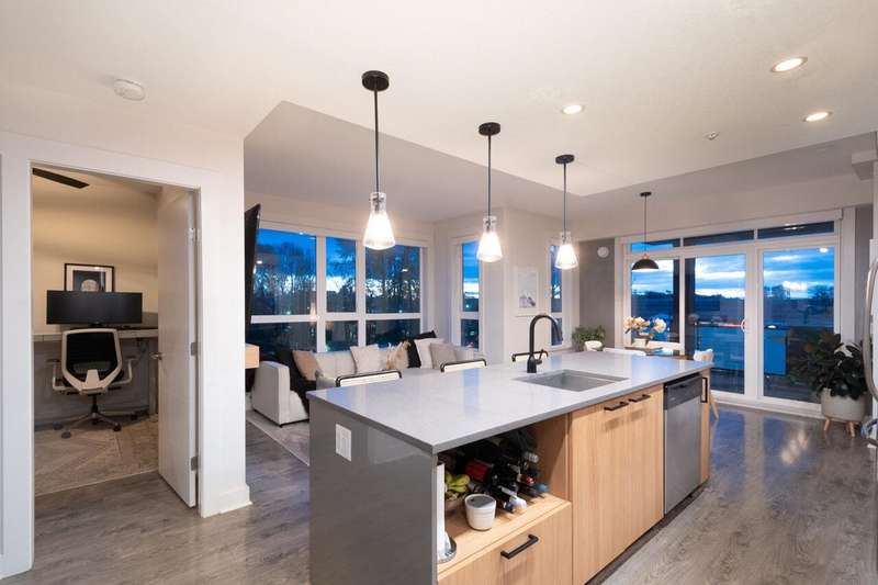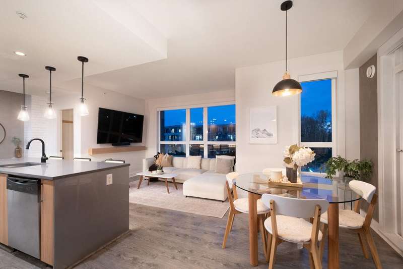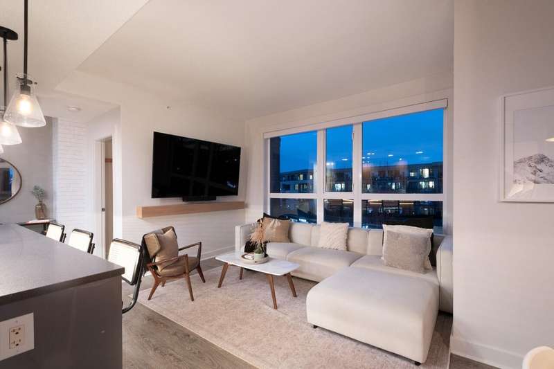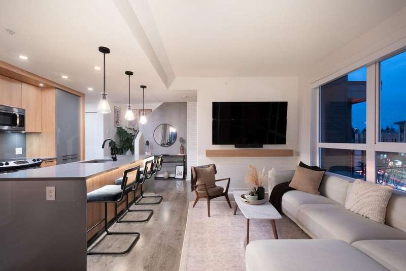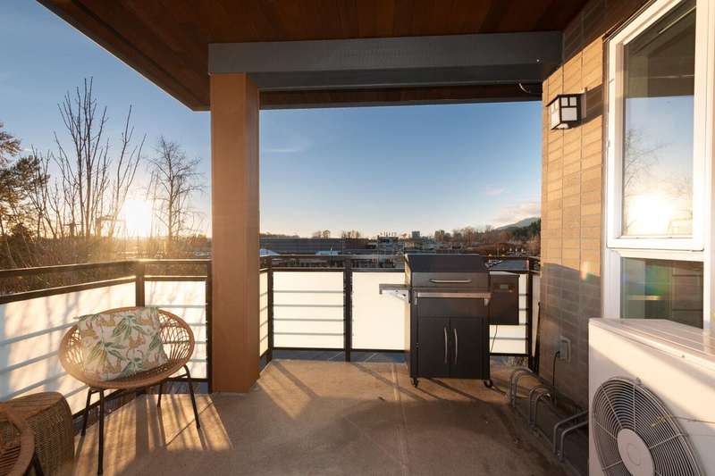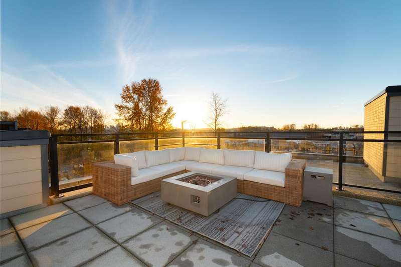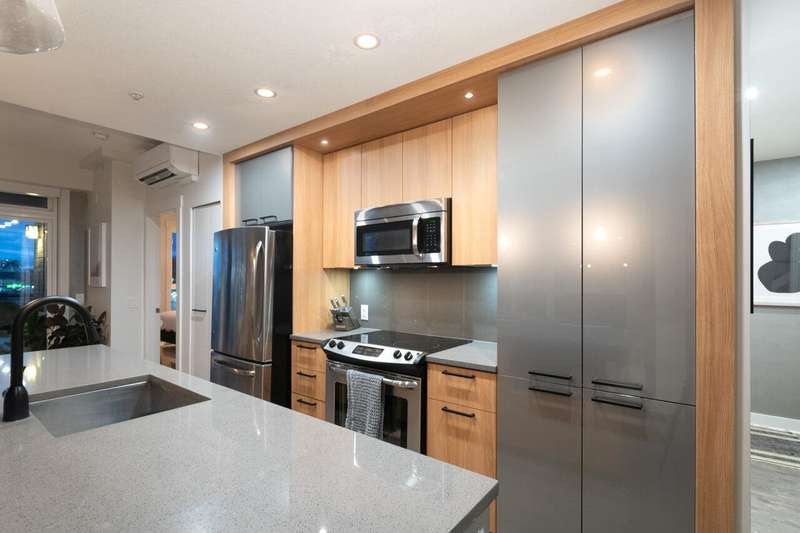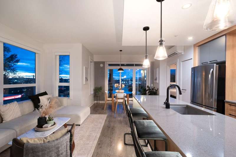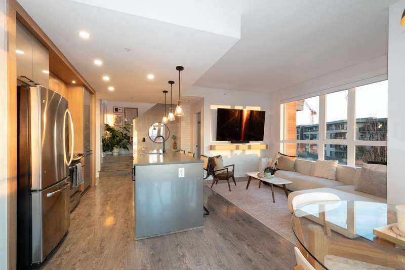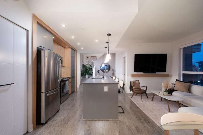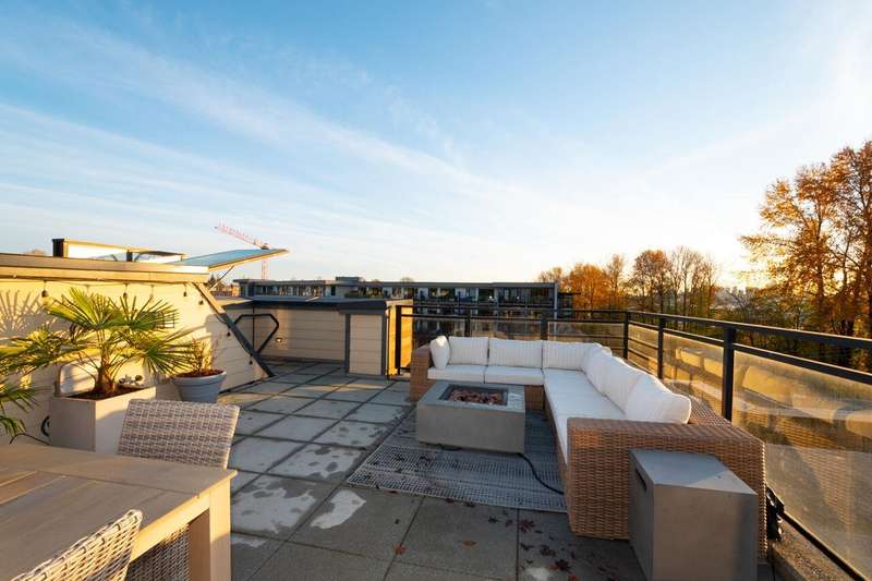 This is penthouse living at Remix! This 948sf top floor, SW facing corner unit offers stunning views from inside, as well as incredible views from the rooftop deck. Enjoy the primary bedroom with an ensuite, as well as a second bedroom and full bathroom. The unit boasts in suite laundry, heated floors, and recent upgrades including A/C and new blinds, as well as one underground parking stall and one storage unit. On the private rooftop deck you will find a hot tub and the perfect place for summer entertaining, or simply just taking in the views. This home is just steps away from transit, shopping, groceries, and nature - everything you need is right at your doorstep! The Remix is pet and rental friendly. You don't want to miss this one! OPEN SAT NOV 29 & SUN NOV 30 2-4PM