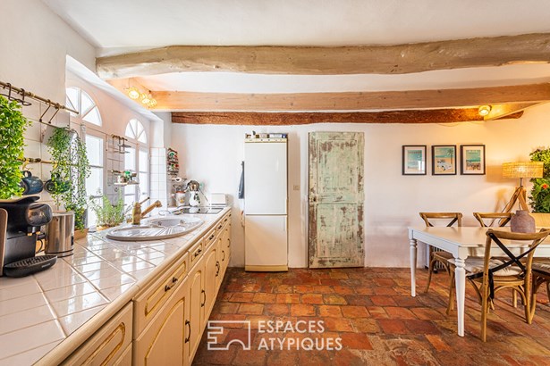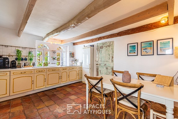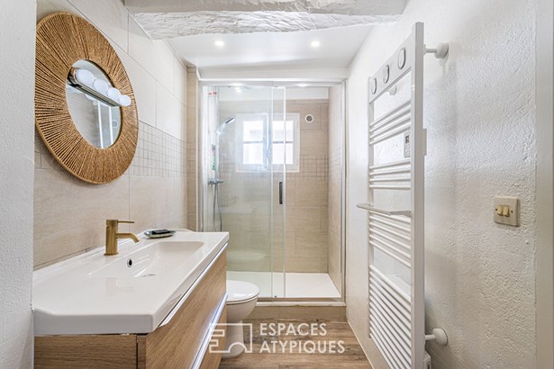 A small, almost secret staircase leads to the entrance and the living area with its Provencal kitchen: terracotta floors worn by time, exposed beams, and soft light filtering through arched windows overlooking the neighbouring olive oil mill. A shower room completes this level.
