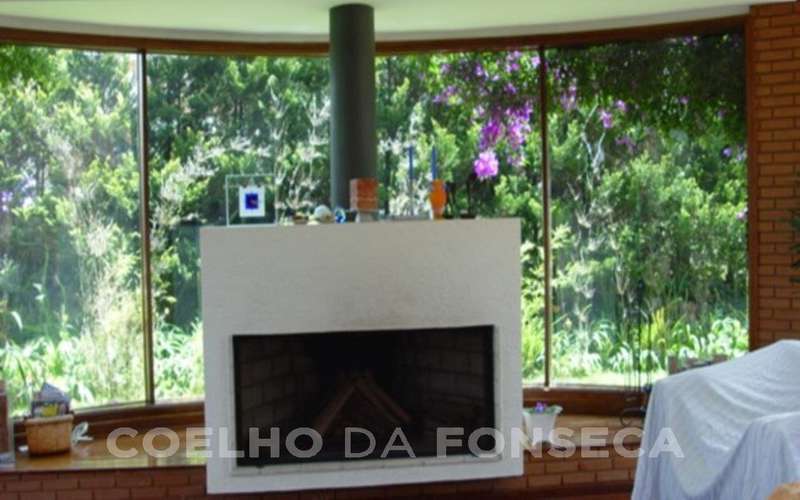 Living e sala de lazer com lareira, 5 suítes, sistema de aquecimento à gás, dormitórios com piso em carpete. Casa para caseiro com aquecimento elétrico.