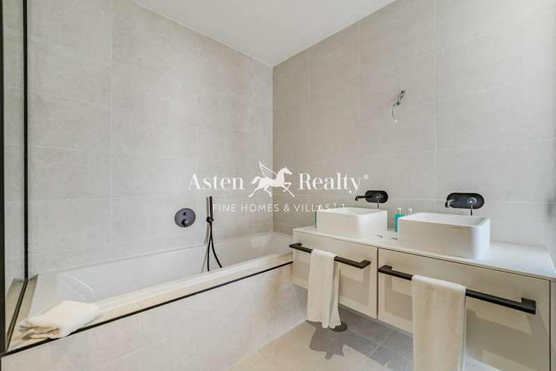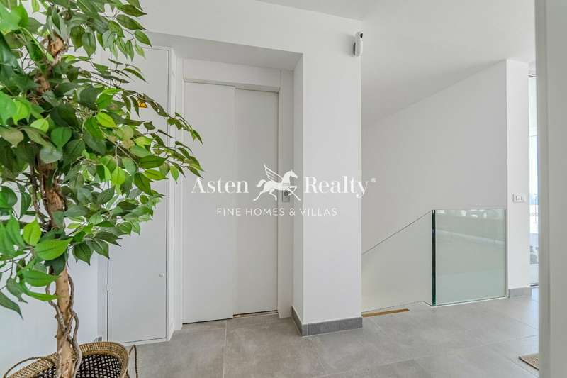 On the upper floor, accessible by elevator, are the living room and open-plan kitchen, fully equipped with Bosch appliances and Krion countertops. There is a guest toilet.