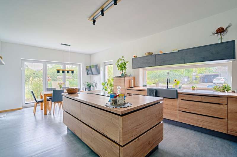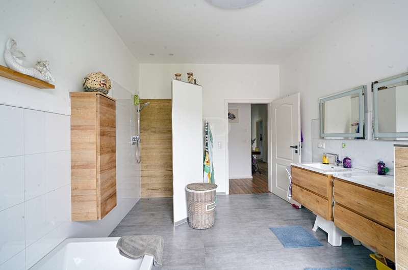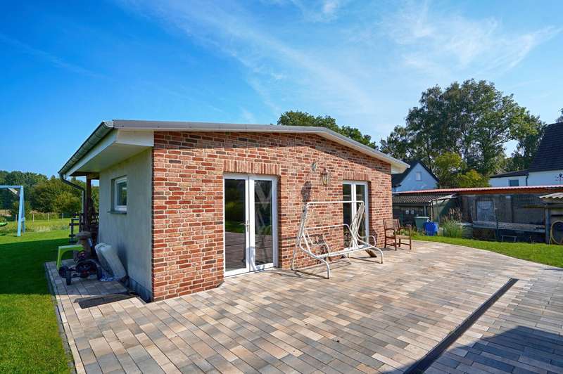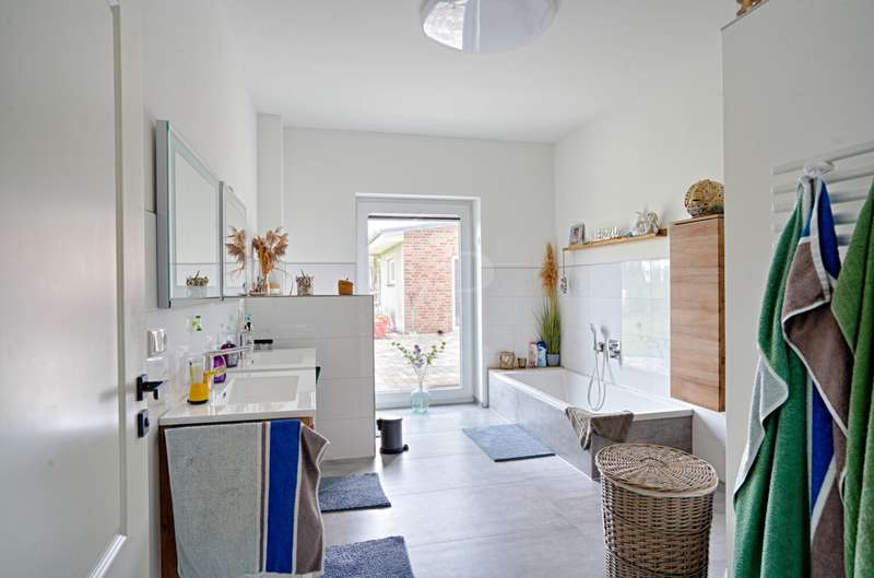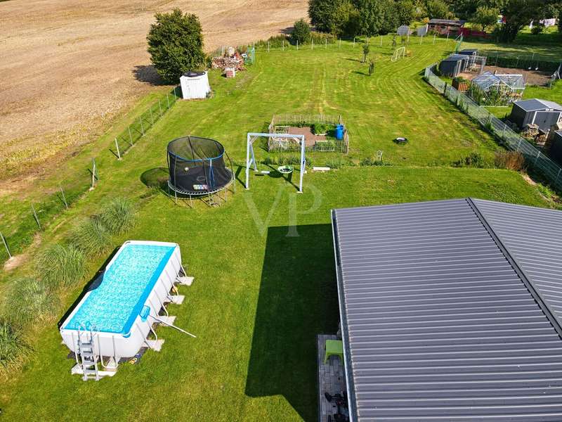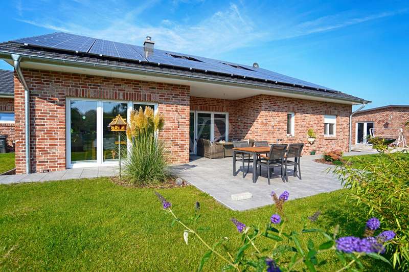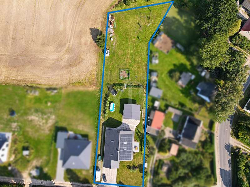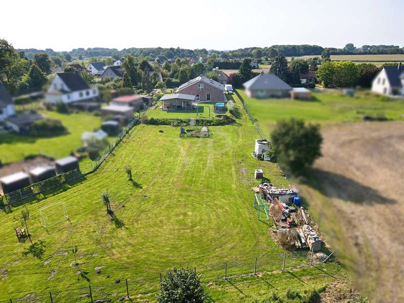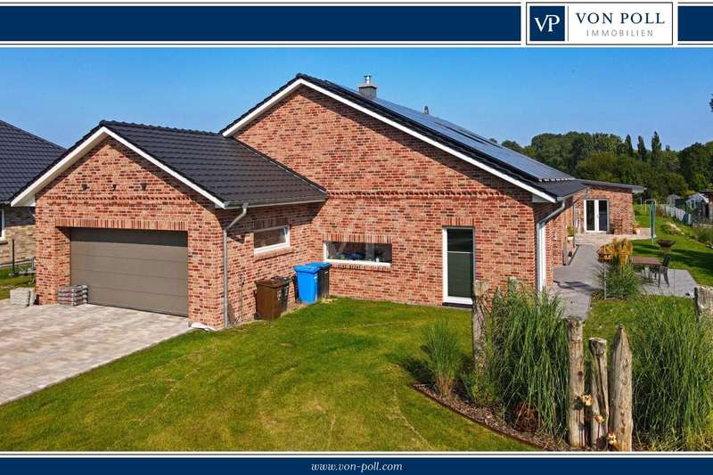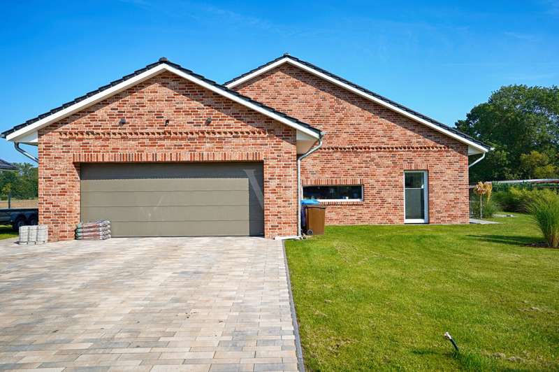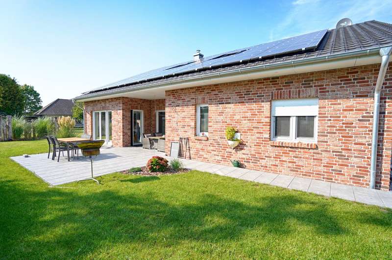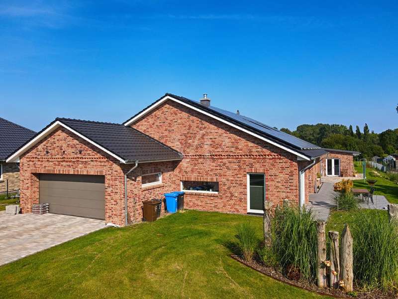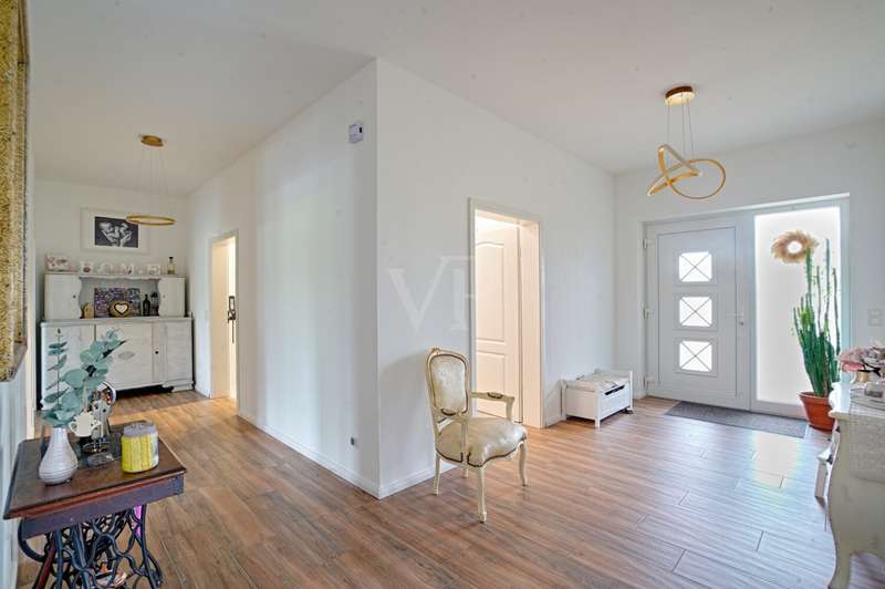 This attractive detached house from 2022 offers comfortable living at a high level on a living space of approx. 162 m². The house presents itself as new and is ready to move into. With a total of four well-designed rooms, including three spacious bedrooms and two modern bathrooms, the property is ideal for couples or families who value high-quality furnishings, spaciousness and contemporary living comfort. The detached house is situated on a plot of approx. 3,236 m², which opens up a wide range of possible uses. The plot area invites you to experience nature directly, implement your own garden projects or create outdoor leisure activities. The quiet yet easily accessible location allows for relaxed living with quick access to all important everyday facilities. The bright living area impresses with its generous room design. Large windows provide optimal light and create a pleasant living atmosphere. The modern kitchen blends harmoniously into the spatial concept of the entire house and offers sufficient space for a dining area, as well as high-quality appliances for ambitious amateur chefs. The high-quality floor coverings and the clear lines of the room concept underline the upscale quality of the home's furnishings. The master bedroom impresses with ample space for a large bed, a spacious dressing area and a well thought-out floor plan. The two other bedrooms are ideal as children's rooms, guest rooms or studies and offer individual design options. Two timelessly tiled bathrooms are each equipped with a floor-level shower and, in some cases, a bathtub. High-quality fittings and stylish sanitary ceramics round off the bathroom concept. The property has an energy-efficient heating system, which impresses with comfortable underfloor heating that provides pleasant warmth in all living spaces. The additionally installed solar system supports the heat and hot water supply and helps to reduce the running costs. In addition to the living space, there is a utility room and storage facilities. The prestigious exterior and clear architecture give the house a contemporary appearance. The driveway to the double garage offers additional parking space for several vehicles. The spacious terrace is the perfect place to relax and enjoy the sunny season, while the extensive plot offers plenty of space to retreat and develop. This detached house combines modern living culture, a generous room layout and high-quality fittings. Take the opportunity to see this attractive property for yourself and arrange a viewing appointment. We look forward to hearing from you.