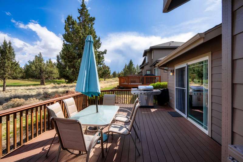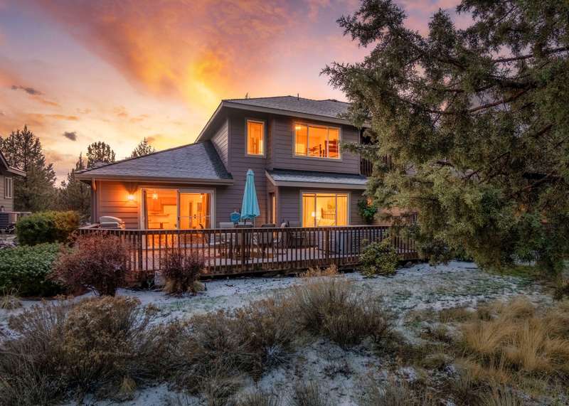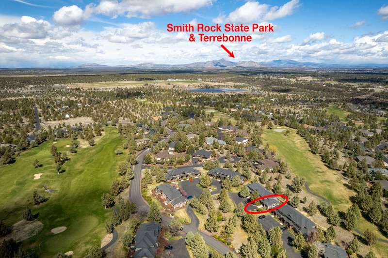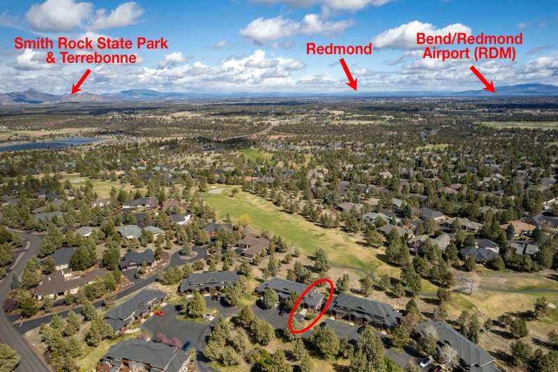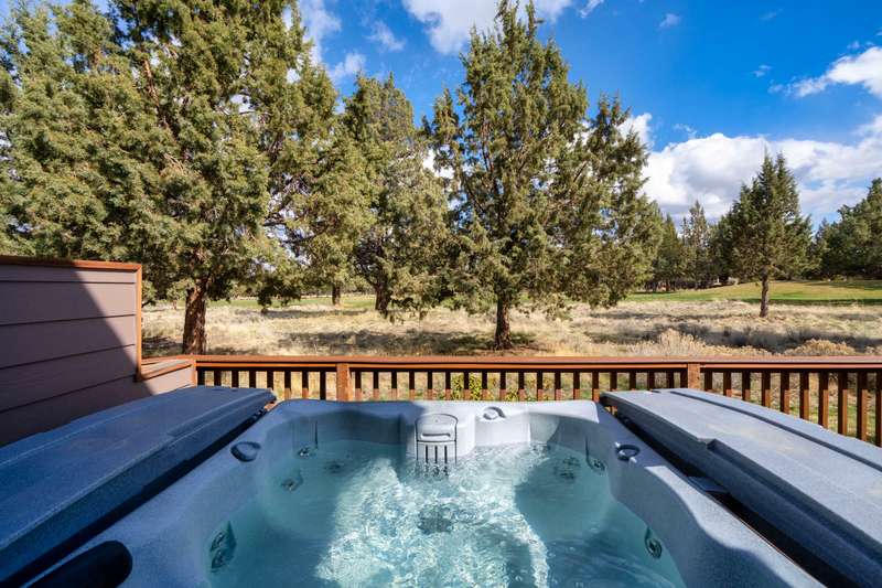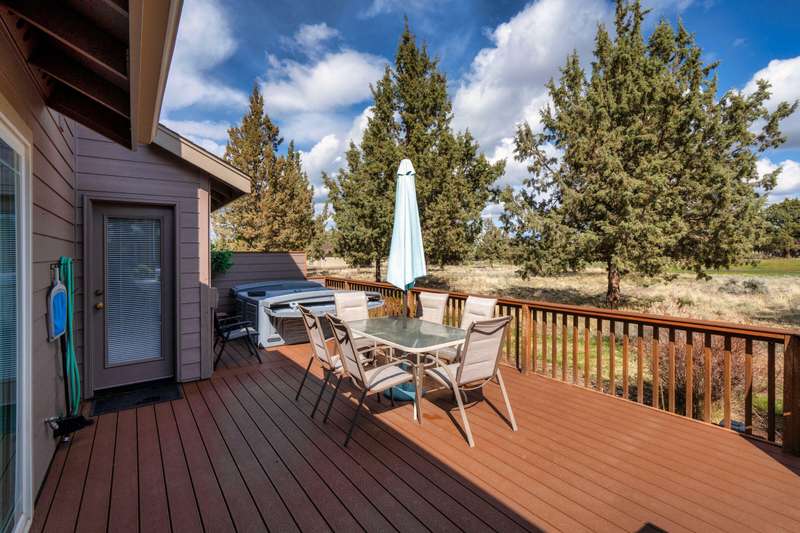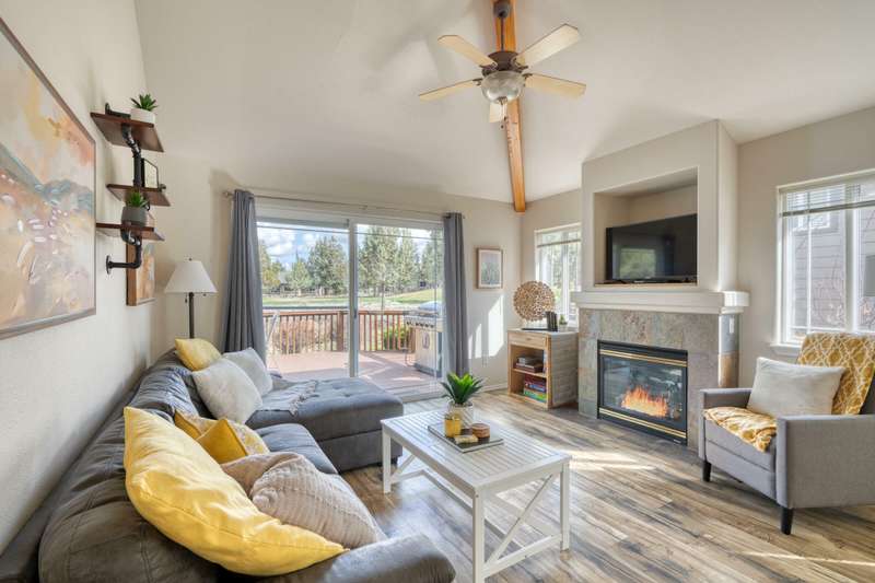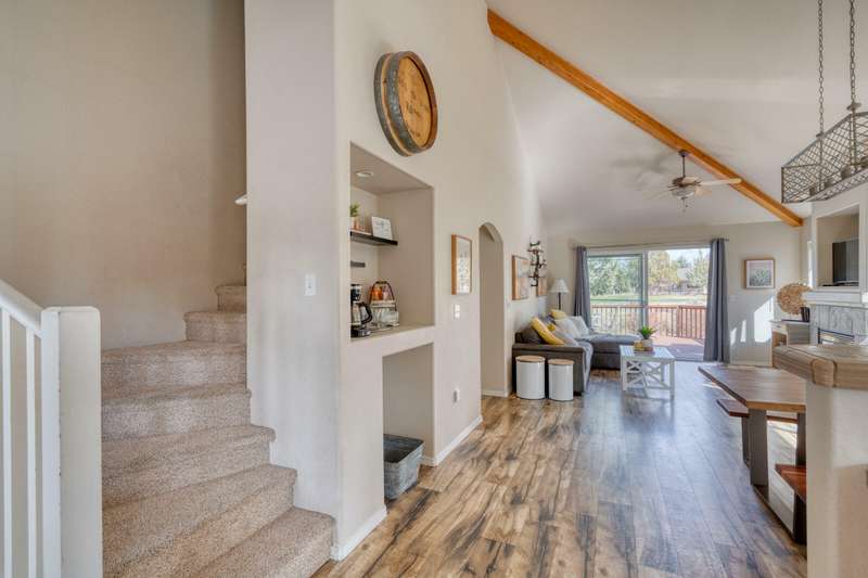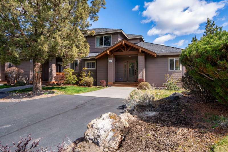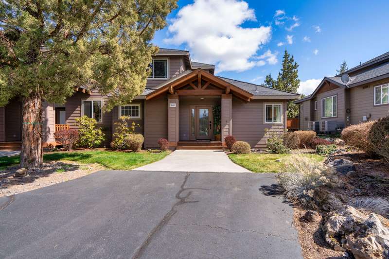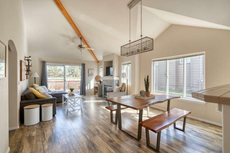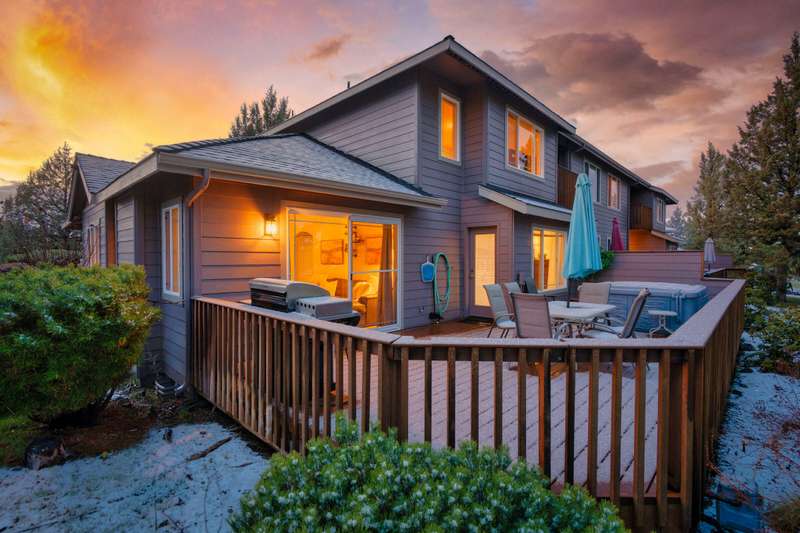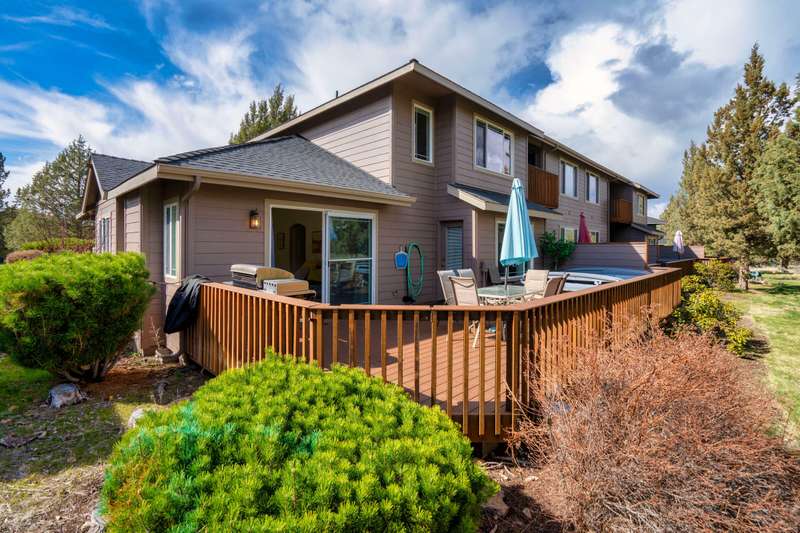 Discover the essence of Eagle Crest in this inviting corner unit townhome. Offered fully furnished to readily achieve your second home or investment property pursuits! Enjoy morning coffee by the fireplace, looking out at the 2nd fairway. Unwind in the hot tub after a day of swinging the clubs or rackets. The comfortable and attractive floorplan has an open living space, vaulted ceilings and the Primary suite downstairs with a walk-in closet, soaking tub and direct access to the Trex deck. Upstairs you will find two spacious bedrooms, a full bathroom and great storage. Features include durable LVP flooring, a new dishwasher, upgraded heat pump, new garbage disposal, and the BBQ is stubbed to propane- ready for summer grilling! Located off the road in a quiet setting, with two designated parking spots for convenience! A sizable exterior closet can accommodate bikes and other toys. Just minutes from the club house, dining, sports center and spa, this home has it all!