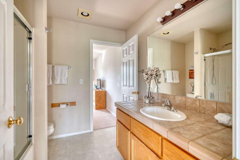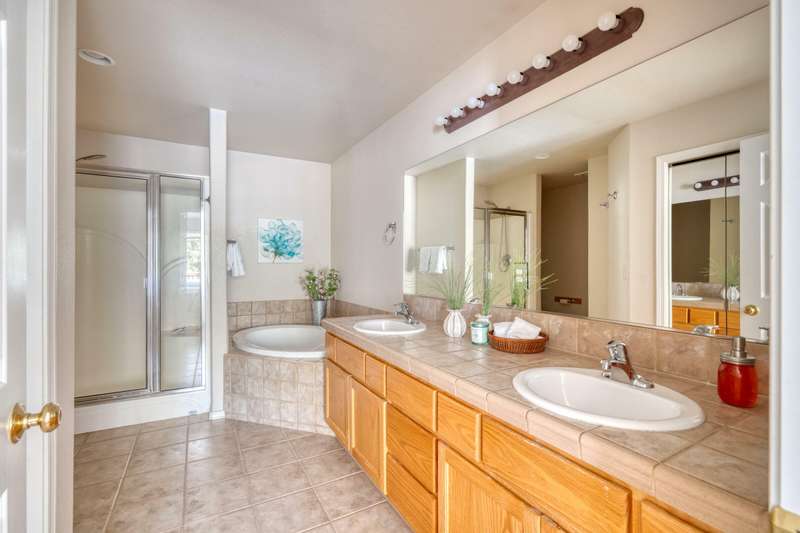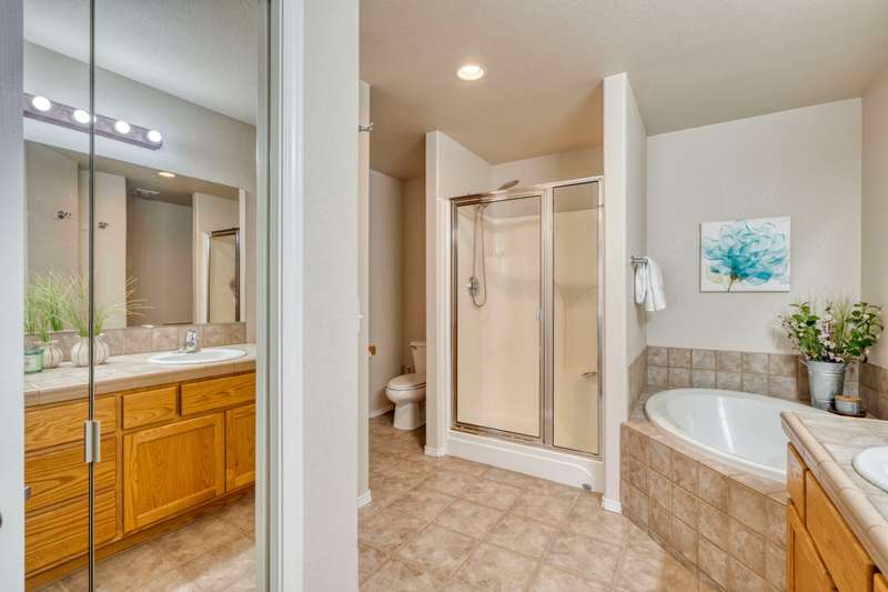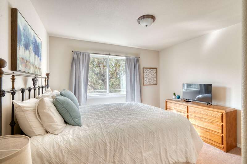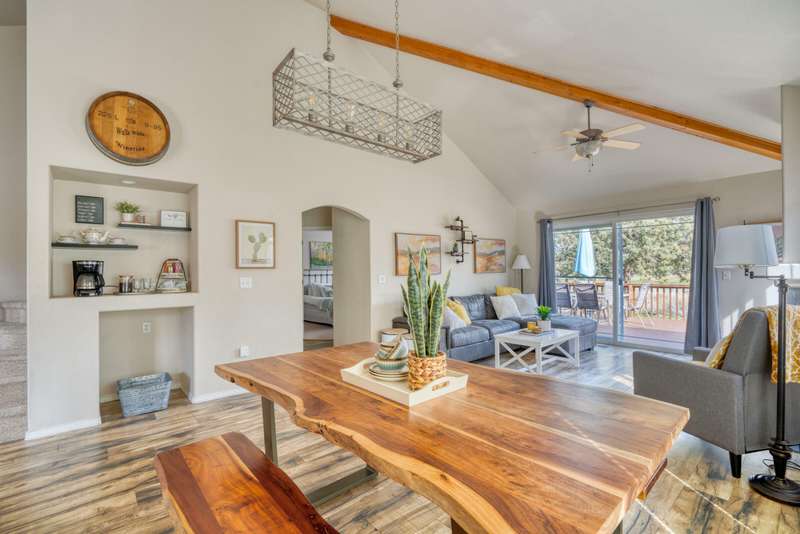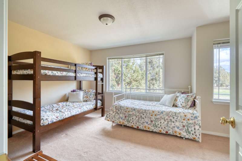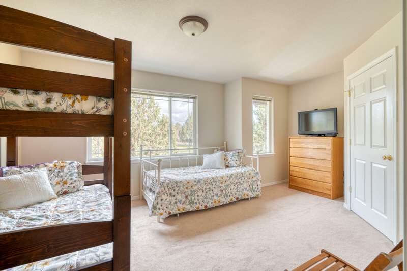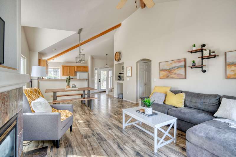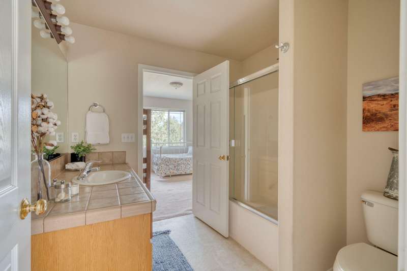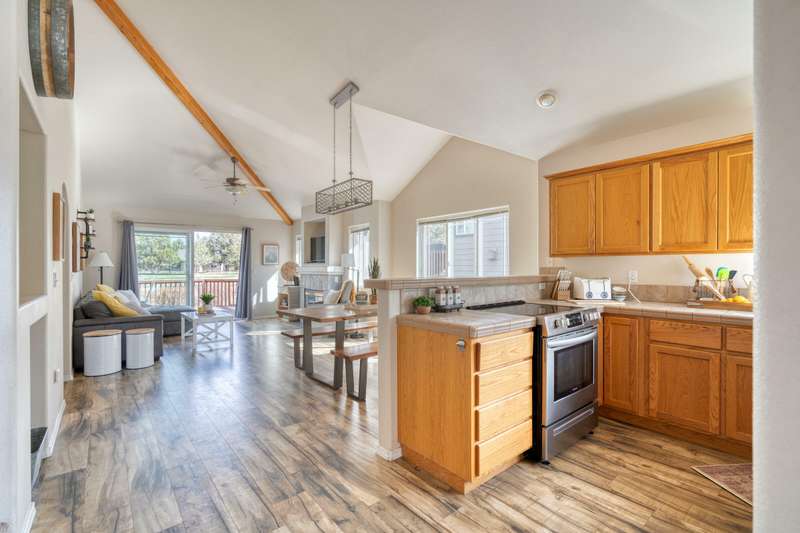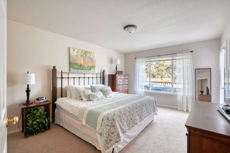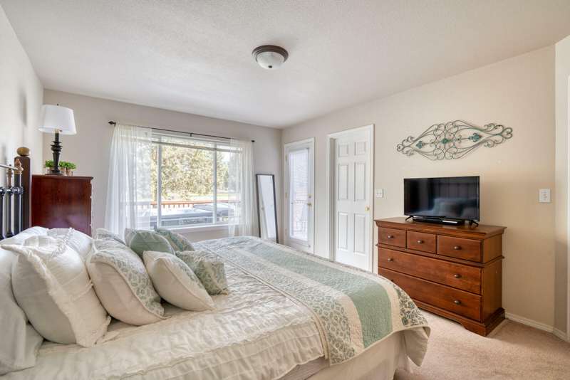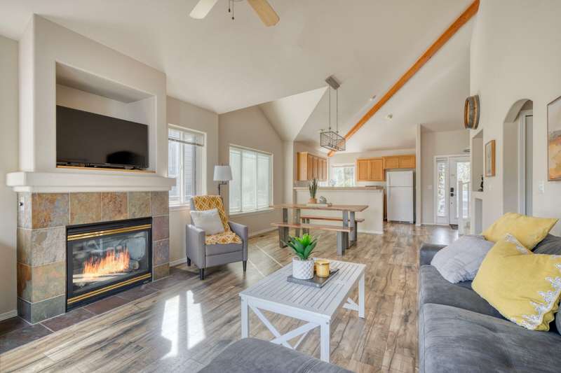 Discover the essence of Eagle Crest in this inviting corner unit townhome. Offered fully furnished to readily achieve your second home or investment property pursuits! Enjoy morning coffee by the fireplace, looking out at the 2nd fairway. Unwind in the hot tub after a day of swinging the clubs or rackets. The comfortable and attractive floorplan has an open living space, vaulted ceilings and the Primary suite downstairs with a walk-in closet, soaking tub and direct access to the Trex deck. Upstairs you will find two spacious bedrooms, a full bathroom and great storage. Features include durable LVP flooring, a new dishwasher, upgraded heat pump, new garbage disposal, and the BBQ is stubbed to propane- ready for summer grilling! Located off the road in a quiet setting, with two designated parking spots for convenience! A sizable exterior closet can accommodate bikes and other toys. Just minutes from the club house, dining, sports center and spa, this home has it all!