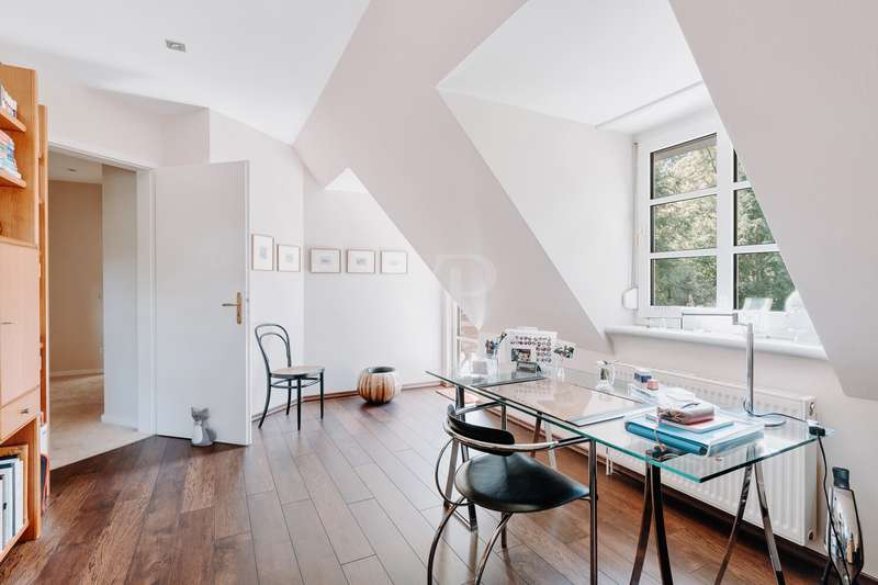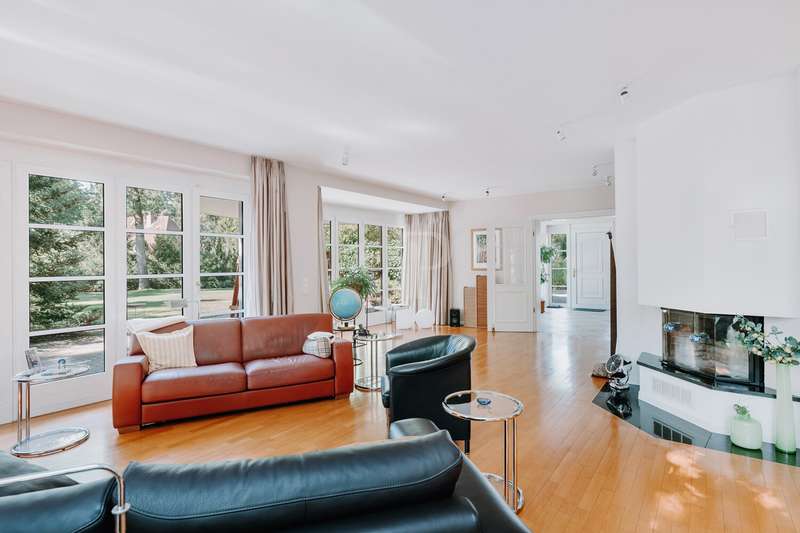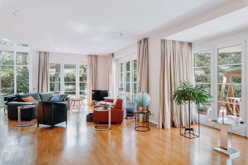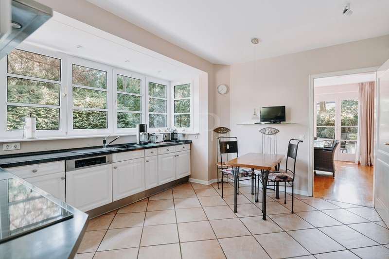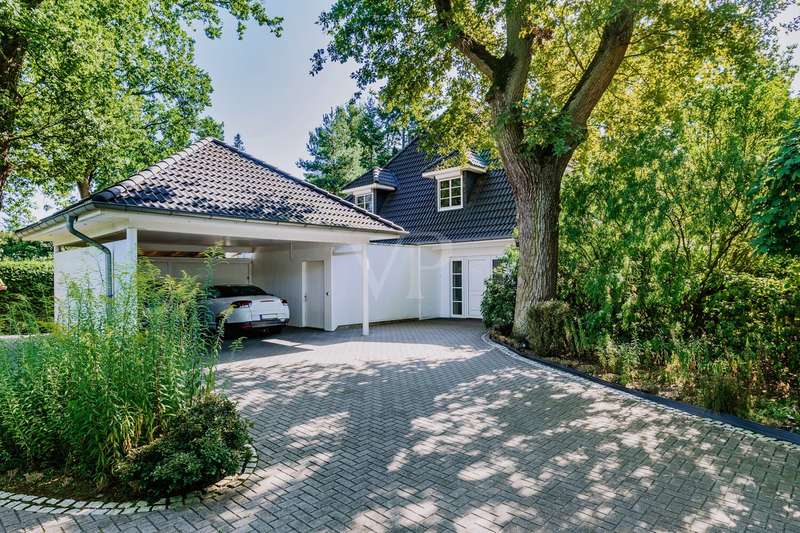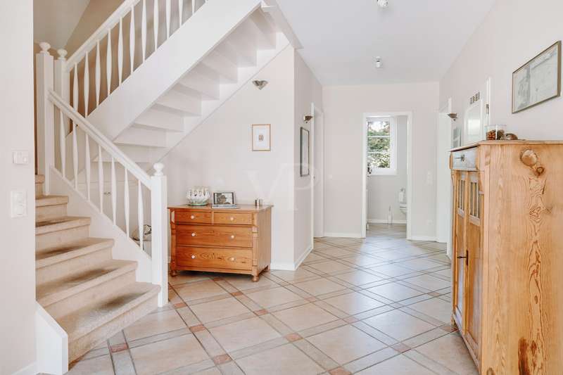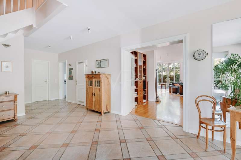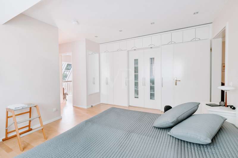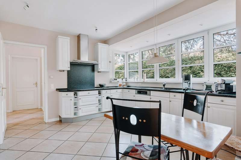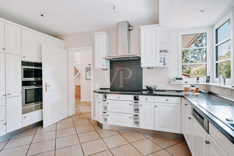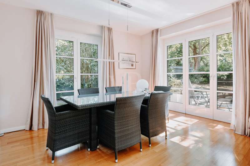 This extremely well-kept villa offers you an upscale living ambience in a quiet location on approx. 246 m² of living space. The property has been continuously modernized with great attention to detail. It has been in excellent condition ever since. The owners have continuously cared for the house and maintained its value so that there is no renovation backlog. The villa boasts a well thought-out room layout with a total of six bright and well-proportioned rooms. On the first floor, the spacious living and dining area welcomes you with floor-to-ceiling windows that create a light-flooded atmosphere and open up a wonderful view of the garden. Directly adjacent is the high-quality fitted kitchen with Miele appliances, which offers plenty of space for culinary activities. This area is complemented by a practical pantry with power points and plenty of storage space. A separate utility room with custom-made built-in cupboards offers additional convenience and organization. From here, there is direct access to the workshop and the covered bicycle storage area. From here, you have direct access to the carport and convenient access to the garden via a door at the rear. The master bedroom is located on the upper floor with direct access to the elegant master bathroom. This was completely renovated in 2013 and offers a spacious shower, a large double washbasin and a modern towel dryer - every detail has been thought of here. There are also two further generously proportioned rooms and a flexible room that is ideal for use as an office, children's room or dressing room. The floor is completed by a practical shower room, which offers additional comfort. From two rooms on the upper floor, you have direct access to the sunny south-facing balcony. This offers a wonderful view of the garden with its beautiful old trees and is ideal for both relaxing and working from home. Versatility and tranquillity are ideally combined here. Another practical feature is the separate shower room on this floor, which is also ideal for guests or children. All technical installations, including the heating system, have been regularly serviced and are up to date. A modern central heating system ensures a pleasant climate in all living areas. The outside area of this villa is particularly noteworthy: The lovingly landscaped garden is a true oasis of peace. With a great deal of care and gardening attention, a retreat has been created that offers both relaxation and space for play and leisure. The sunny terrace offers ideal conditions for relaxing hours outdoors. Three outdoor parking spaces and two further parking spaces in the carport right next to the house complete the attractive overall offer. This villa is ideal for families or couples looking for a very well-maintained home with low maintenance requirements. Arrange a viewing appointment and be inspired by this special property.