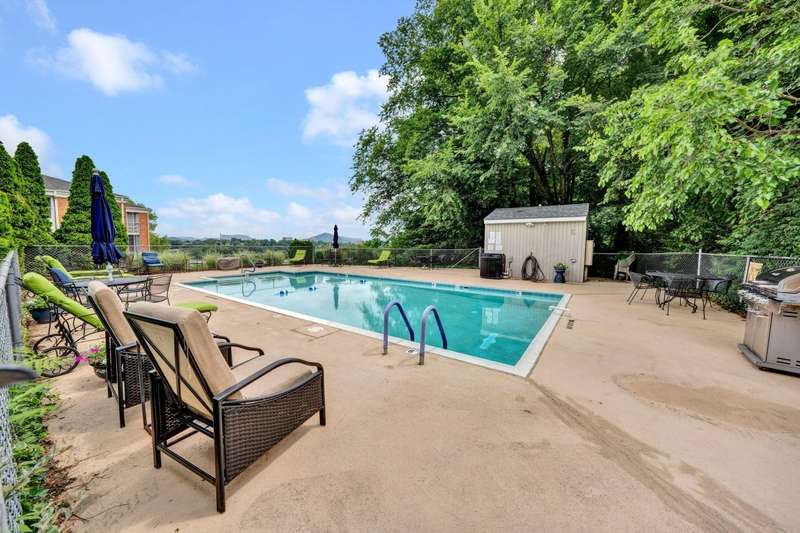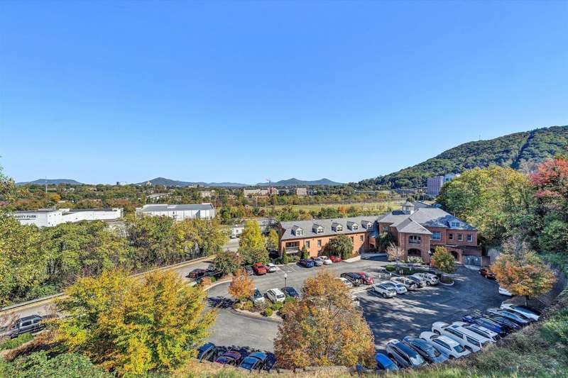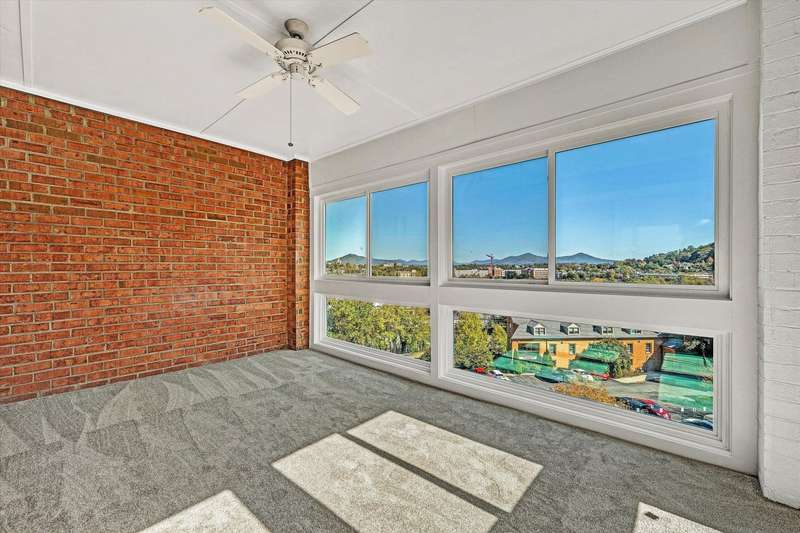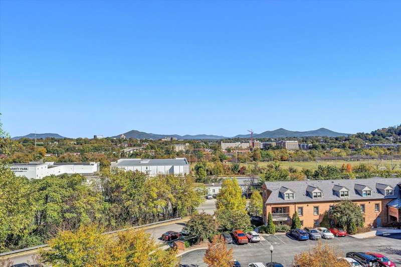 Perched on the top floor corner of a sought-after South Roanoke complex Sotheby Square, this 2-bedroom, 2-bath condo offers unbeatable panoramic views of Carilion Hospital, Mill Mountain, downtown Roanoke, and a bird's-eye view of the River's Edge sports complex and community pool. The spacious open-concept layout features a large family room, dining room, and kitchen that flow seamlessly into a bright sunroom. The primary suite boasts a walk-in closet, luxurious en-suite bath with a walk-in shower and jacuzzi tub. Enjoy the comfort of brand-new carpet throughout and all-new windows (2025). With elevator access, designated garage parking, and a prime location, this unit combines convenience, style, and scenery.