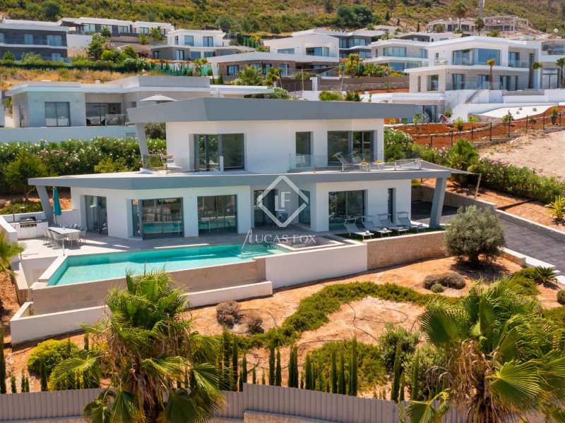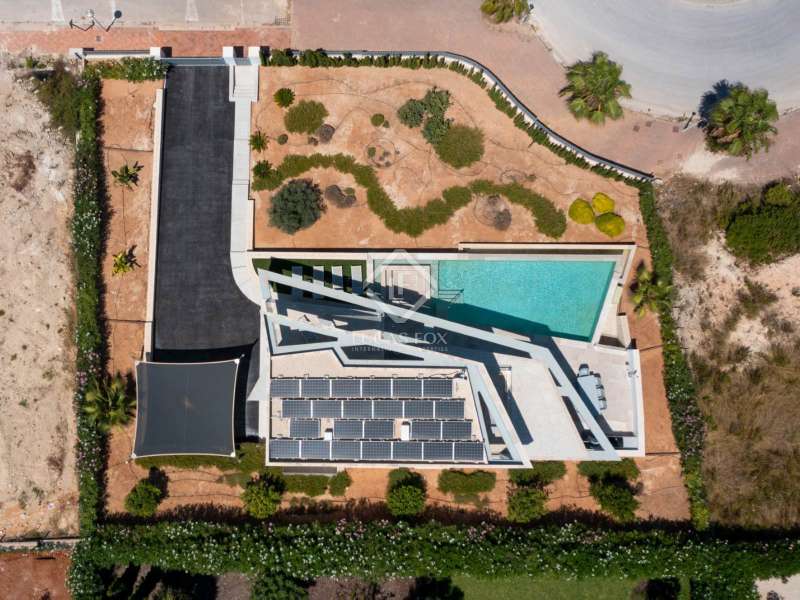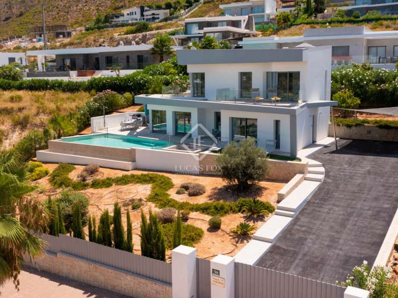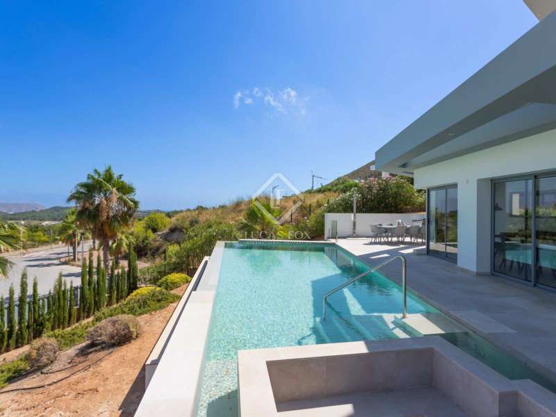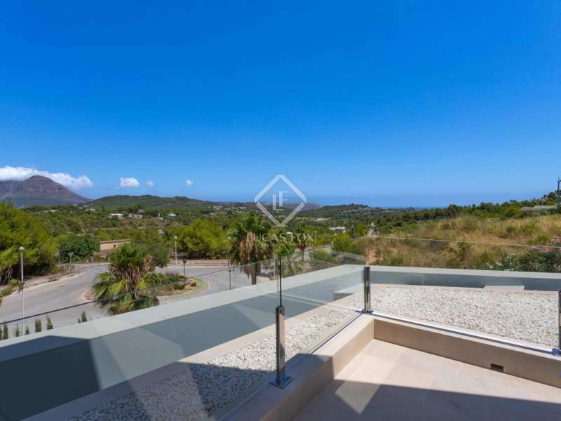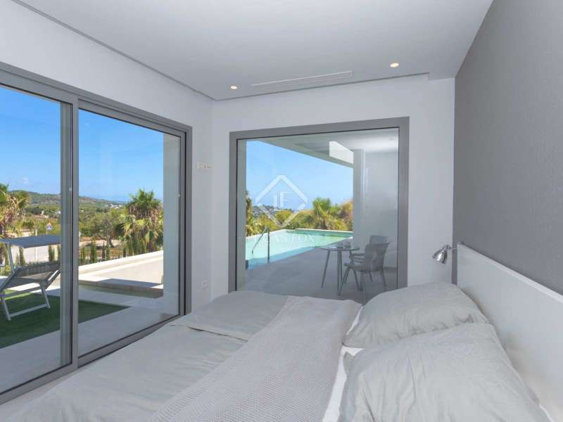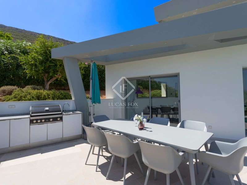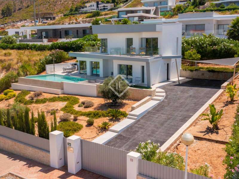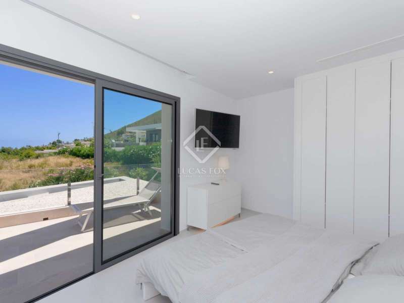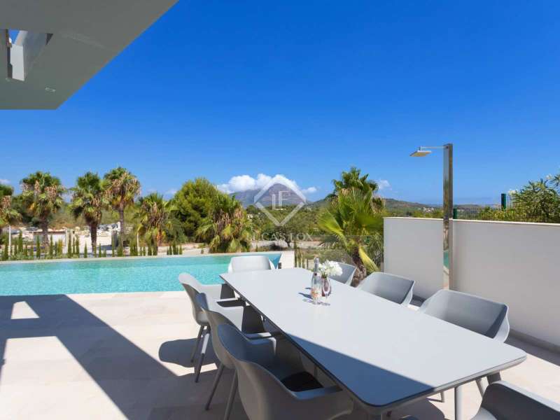 With views of the sea and montgó mountain, this fabulous property allows you to live in an exclusive area of great value with only first-class avant-garde villas. Spread over 2 floors, it has on the ground floor a living-dining room with large bay windows opening onto the outside and letting in natural light, a fully equipped American kitchen with Bosch appliances, an independent connected laundry room, and a courtesy toilet with sound system that will surprise you. On this floor there are also two large bedrooms each with access to terraces, fitted wardrobes as well as a bathroom with Porcelanosa shower and a storage room for your comfort. Outside there is a fantastic heated infinity pool with turquoise waters, sublimated by a wonderful chill-out built inside the pool, the perfect place to relax and admire the view. Surrounded by Mediterranean plants and mature trees, you will appreciate the beautiful marble terraces and the pretty summer kitchen equipped with a gas barbecue and sink, perfect for enjoying Spanish life. On the first floor are 2 large master bedrooms, each with its own bathroom, fitted wardrobes and private terraces opening onto the views of the Montgo and the Mediterranean Sea. The Villa has a carport for 2 cars, it is equipped with the latest technologies, such as the home automation system that controls the temperature of the pool and outdoor lighting. It also has solar panels, alarm system, wifi, electric indoor blinds, Panasonic aerothermy, an airzone system for underfloor heating and air conditioning, all independent in each room, automatic irrigation system in the garden, filtration system and automatic PH in the pool.