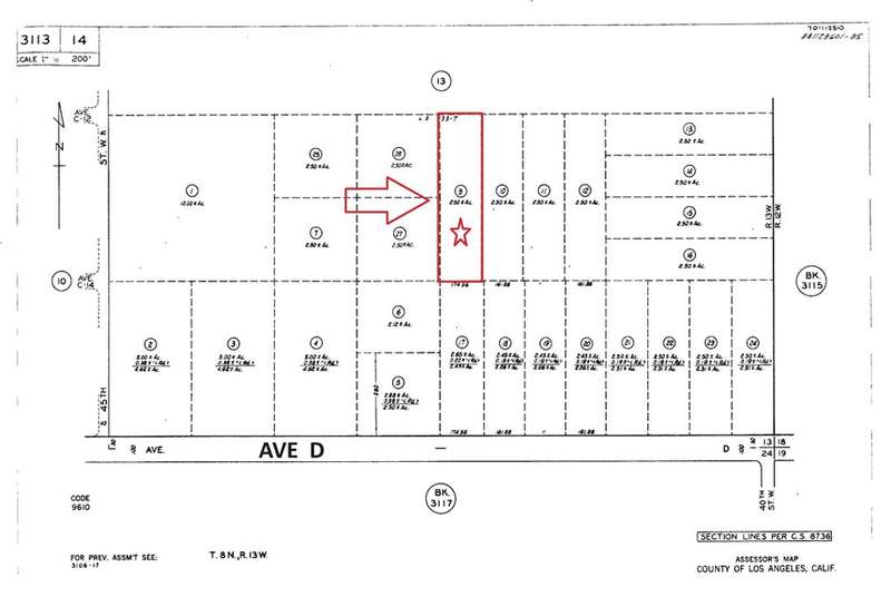 2.50 Acres of land, corner lot, it is a great investment opportunity in the developing Antelope Valley where land is still affordable. Zoned R-A, residential agricultural, cross streets are Ave C12 & 43rd St. West within the community of Caliche, existing ranch homes around the subject land. Located just 1 hour north of Los Angeles. Zoning: R-A , 2.5 Acres ; Size: 662' x 165'; APN: 3113-014-009 ; GPS: 34.778431, -118.206045