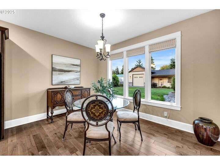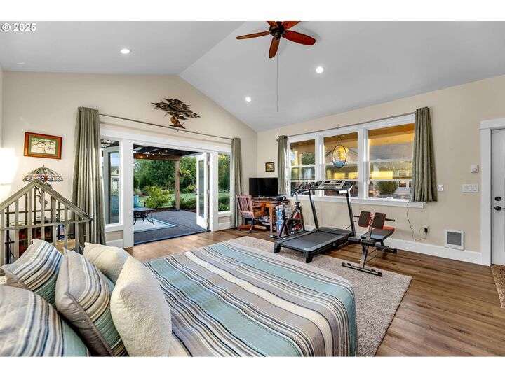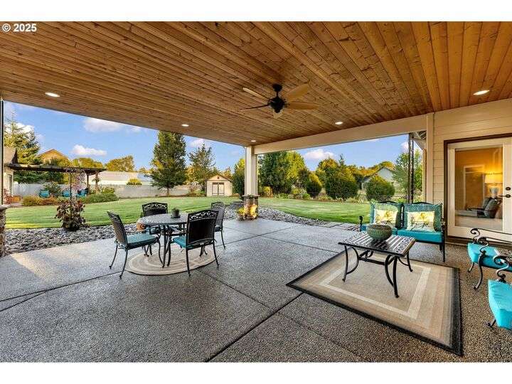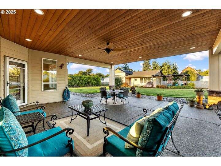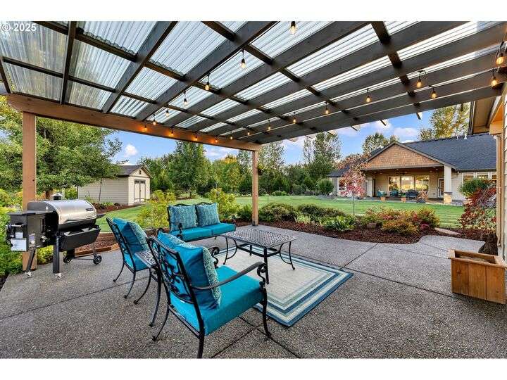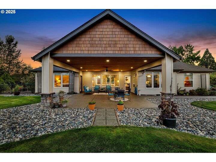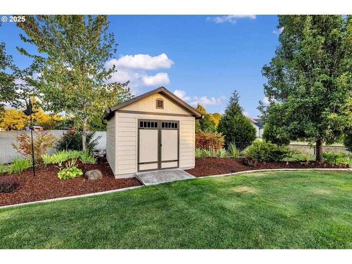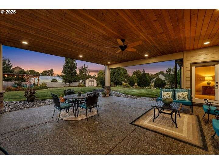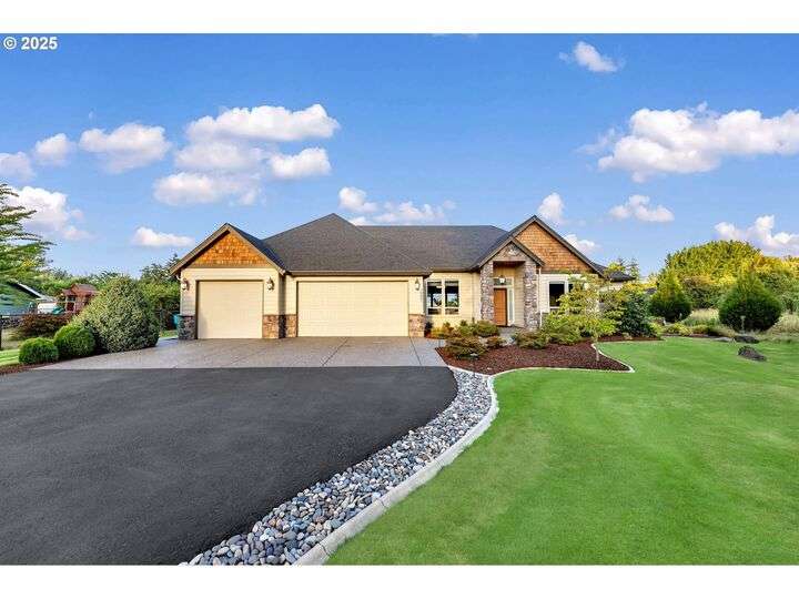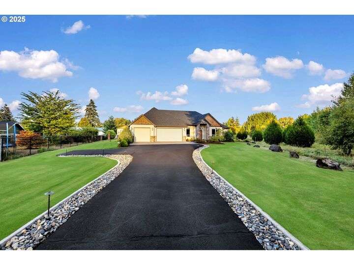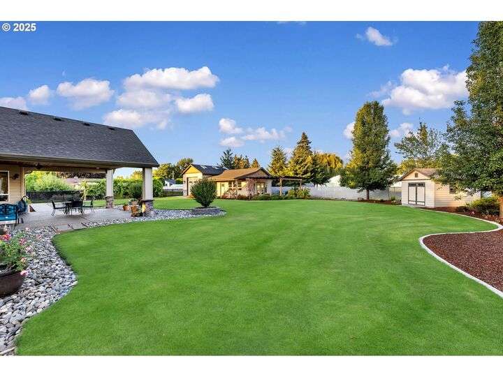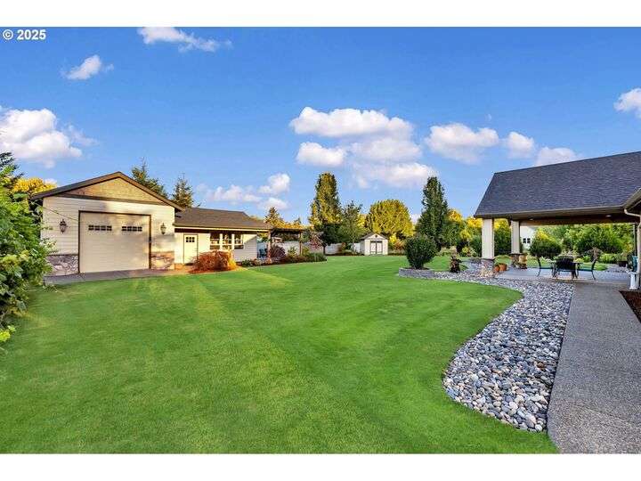 Gentleman's estate in Whispering Meadows. One acre level property w/ private entrance welcomes you to this impeccably maintained home. Inside you'll enjoy an open living plan w/ high ceilings & large windows. The great room is spacious w/ engineered hardwood featuring floor to ceiling stone fireplace w/ built in cabinetry & bookshelves. Formal dining w/ eng hrdwd & lighted coved ceiling. Chefs kitchen enjoys eng hardwood flooring, solid granite counters, 4 chair seating bar, stainless gas range w/ stainless hood, walk-in pantry & large nook with access to the expansive wood tongue & groove covered patio. Spacious Primary bedroom features coved lighted ceiling w/ access to covered patio. Primary bath w/ walk in tiled shower, jetted tub, double vanities, separate water closet & large walk in closet w/ window & built-ins. Two additional bedrooms w/ Jack & Jill bath.3 car garage w/ built-in cabinetry/ storage. Shop features 10' door w/ separate 220 amp electrical service, skylights & storage cabinets. Vaulted studio w/ French doors to huge pergola covered patio, full bath & planned space for kitchenette. Professionally landscaped grounds w/ lit pathways, trellis w/ grapevine & raised garden beds. Newly painted exterior w/ shake stain & freshly sealed driveway, patio's & walkways. Permitted 18x26 shop & 18x24 vaulted studio built in 2018. Open House Sat/6th 12:00-2:00