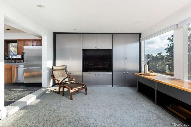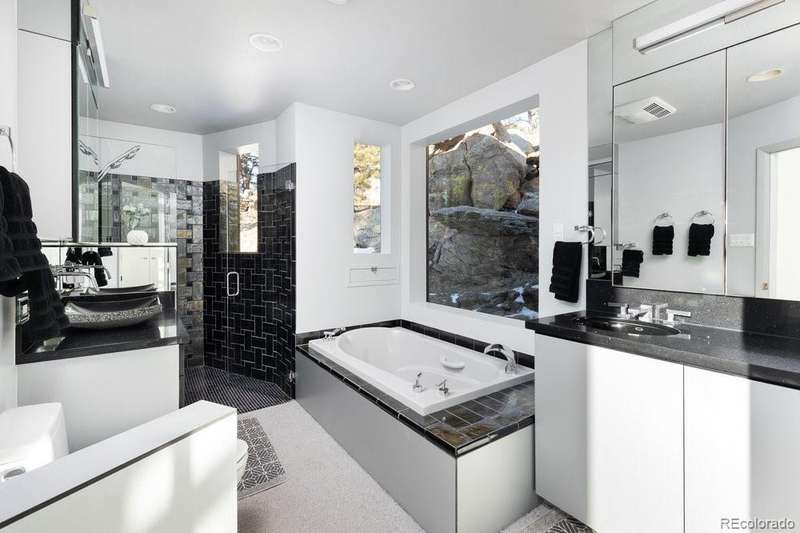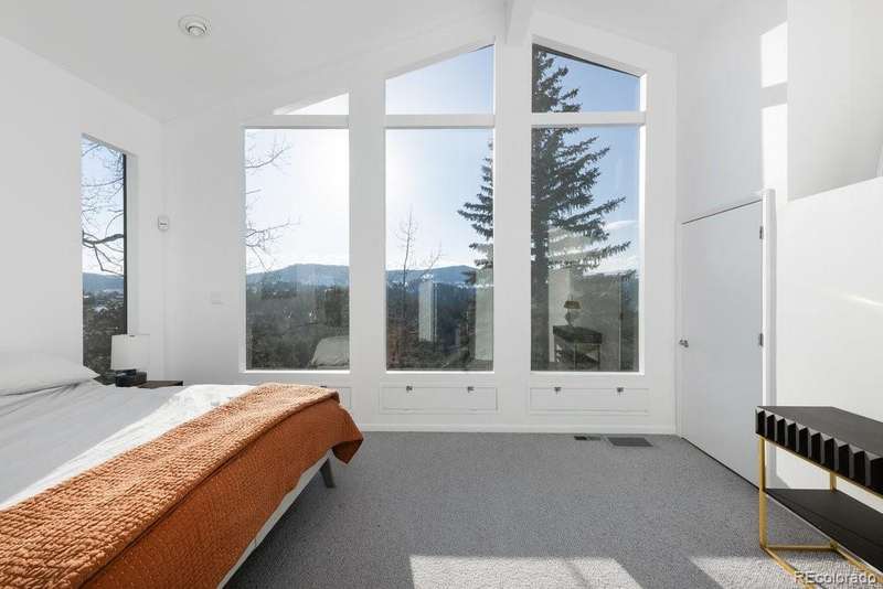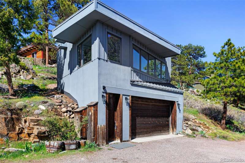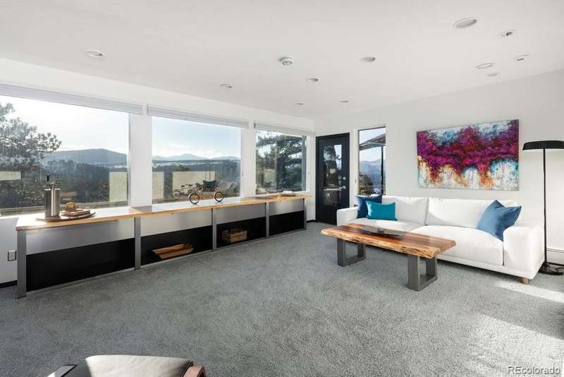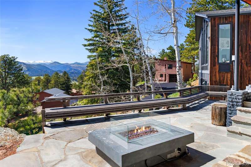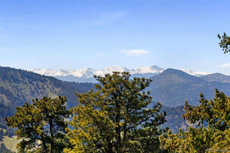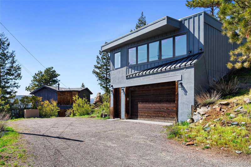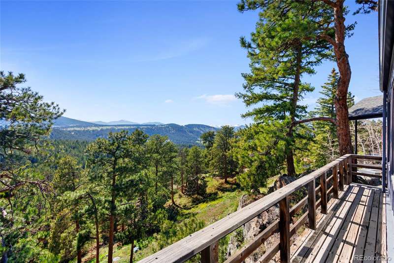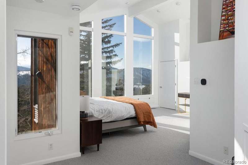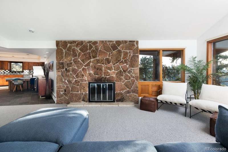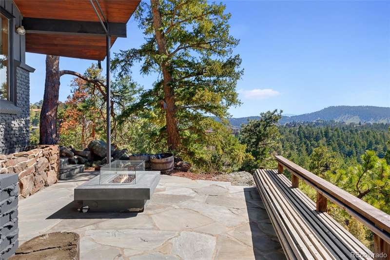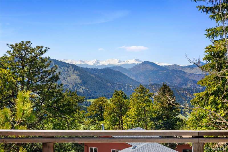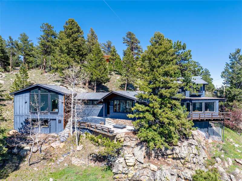 Set on an acre and a half on coveted Lookout Mountain, this stunning mid-century mountain retreat seamlessly blends architectural elegance with sweeping mountain views. Walls of windows flood the open living spaces with natural light, creating a seamless connection to the serene landscape with expansive views from nearly every room. The living room is anchored by a striking wood burning fireplace with floor to ceiling stone surround. The updated kitchen offers leathered granite countertops, stainless steel backsplash, original wood cabinetry and sleek appliances. The kitchen opens to the family room featuring a custom built-in entertainment center and storage, all opening up to panoramic views. Both living spaces provide access to the wraparound balcony and stone patio with fire pit. The luxurious primary retreat showcases soaring vaulted ceilings and majestic views that will have you wondering if you are waking up in a dream. Unwind in the large soaking tub, refresh in the tiled shower and enjoy dual vanities all with unique windows set against the privacy of rock outcroppings. Additional main level accommodations include a secondary bedroom, currently configured as a home office with built-in desk and shelving and a full bathroom. A curved staircase leads to the secondary suite with a spacious bedroom and five-piece bathroom with custom tile soaking tub and shower. Separate guest quarters feature a bedroom with built-ins and bathroom. A heated stone walkway leads to the oversized detached garage, complete with a newly installed electric car charger. Bonus room above the garage is perfect for a gym or workshop and offers a large storage room. Enjoy unparalleled peace and tranquility all with easy access to Golden, Denver, and ski resorts. With close proximity to Apex Park and scenic hiking trails, this extraordinary home offers the perfect blend of nature, luxury, and modern living. Don't miss the opportunity to make this breathtaking mountain retreat your own.