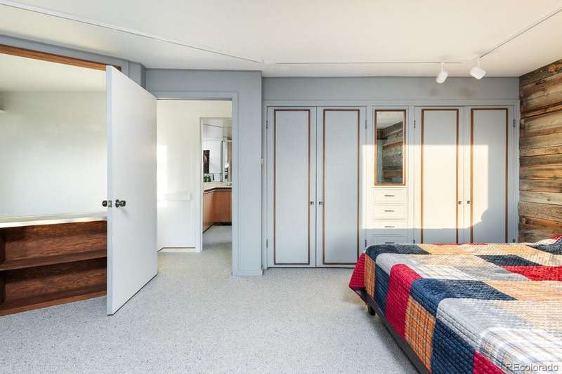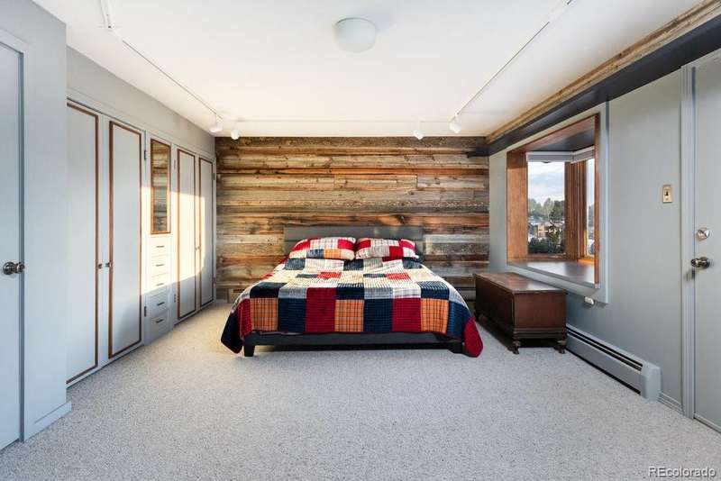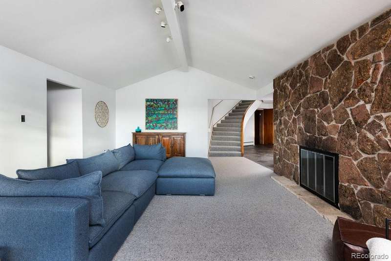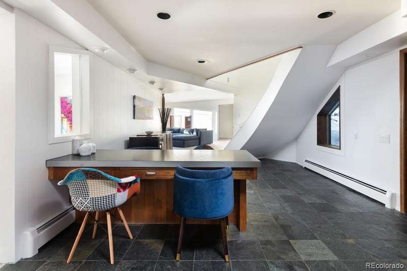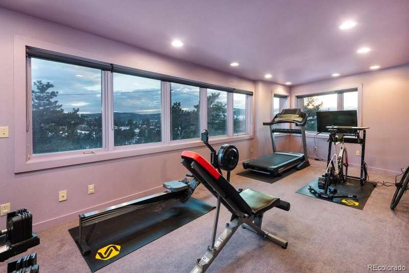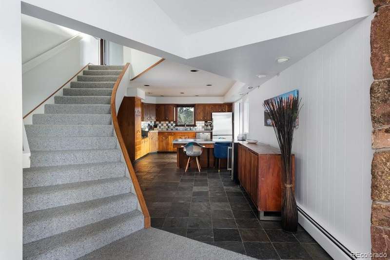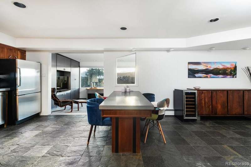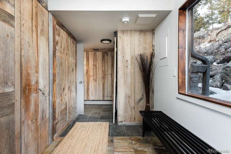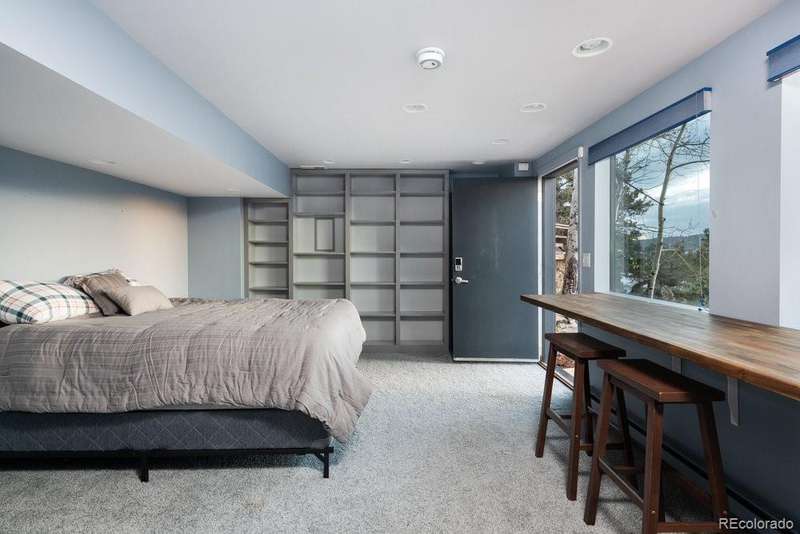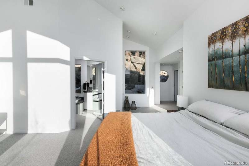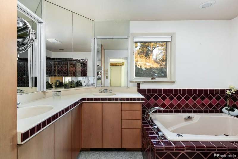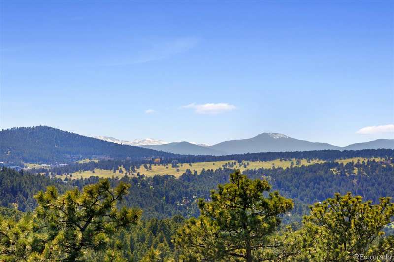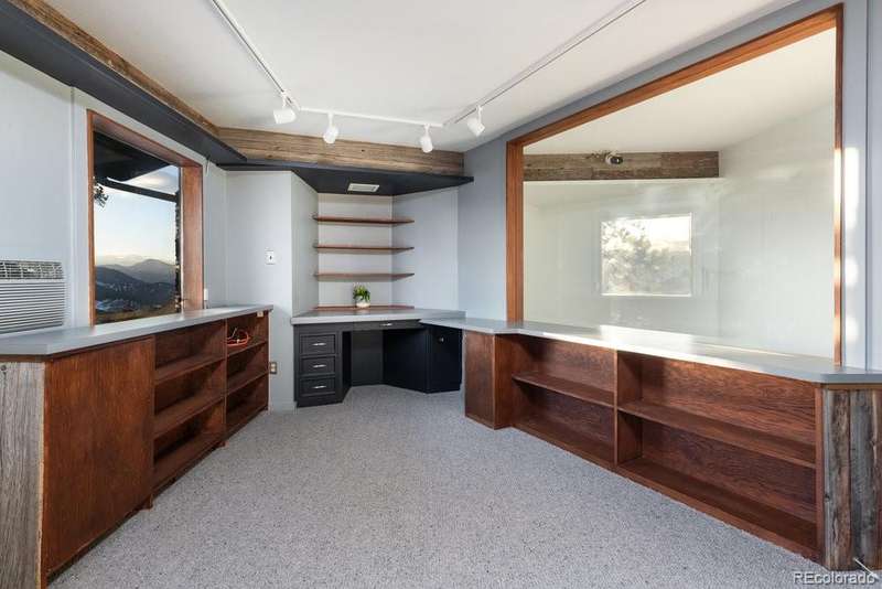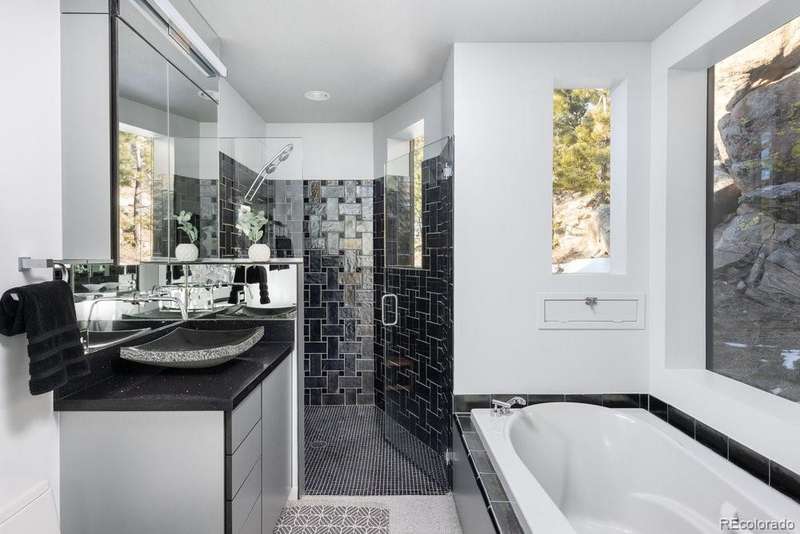 Set on an acre and a half on coveted Lookout Mountain, this stunning mid-century mountain retreat seamlessly blends architectural elegance with sweeping mountain views. Walls of windows flood the open living spaces with natural light, creating a seamless connection to the serene landscape with expansive views from nearly every room. The living room is anchored by a striking wood burning fireplace with floor to ceiling stone surround. The updated kitchen offers leathered granite countertops, stainless steel backsplash, original wood cabinetry and sleek appliances. The kitchen opens to the family room featuring a custom built-in entertainment center and storage, all opening up to panoramic views. Both living spaces provide access to the wraparound balcony and stone patio with fire pit. The luxurious primary retreat showcases soaring vaulted ceilings and majestic views that will have you wondering if you are waking up in a dream. Unwind in the large soaking tub, refresh in the tiled shower and enjoy dual vanities all with unique windows set against the privacy of rock outcroppings. Additional main level accommodations include a secondary bedroom, currently configured as a home office with built-in desk and shelving and a full bathroom. A curved staircase leads to the secondary suite with a spacious bedroom and five-piece bathroom with custom tile soaking tub and shower. Separate guest quarters feature a bedroom with built-ins and bathroom. A heated stone walkway leads to the oversized detached garage, complete with a newly installed electric car charger. Bonus room above the garage is perfect for a gym or workshop and offers a large storage room. Enjoy unparalleled peace and tranquility all with easy access to Golden, Denver, and ski resorts. With close proximity to Apex Park and scenic hiking trails, this extraordinary home offers the perfect blend of nature, luxury, and modern living. Don't miss the opportunity to make this breathtaking mountain retreat your own.