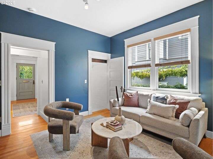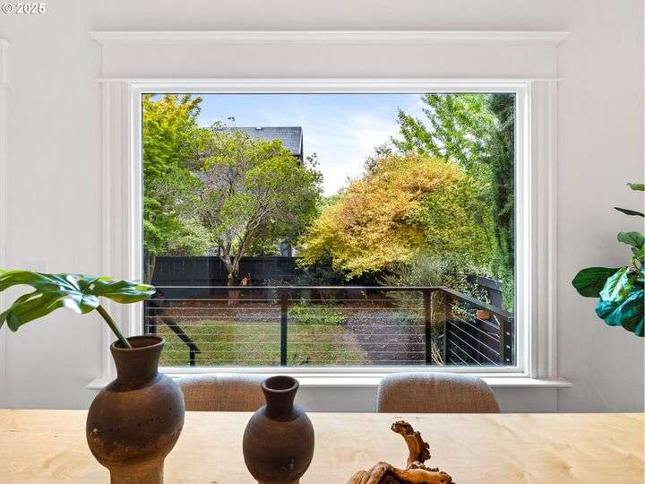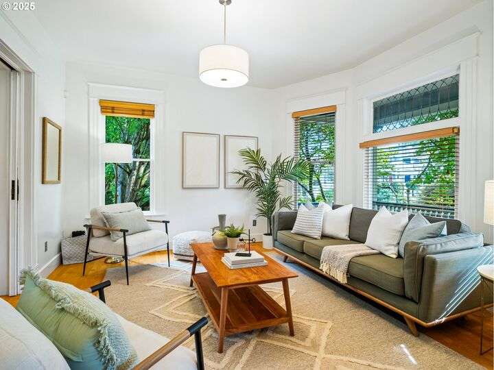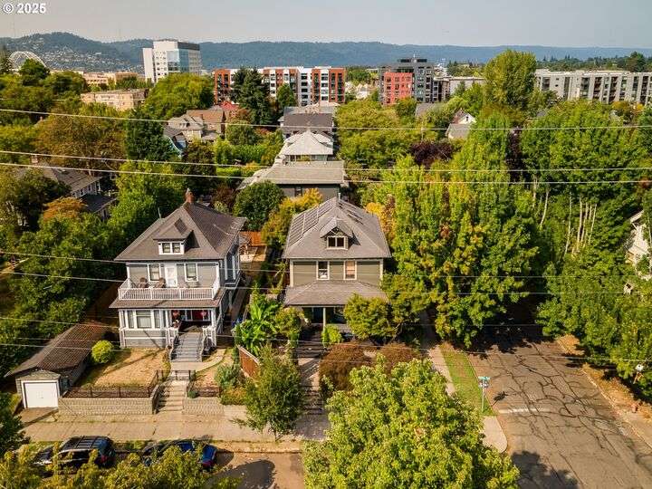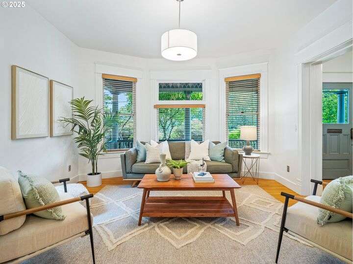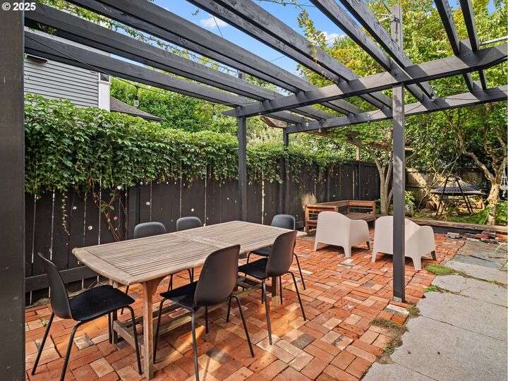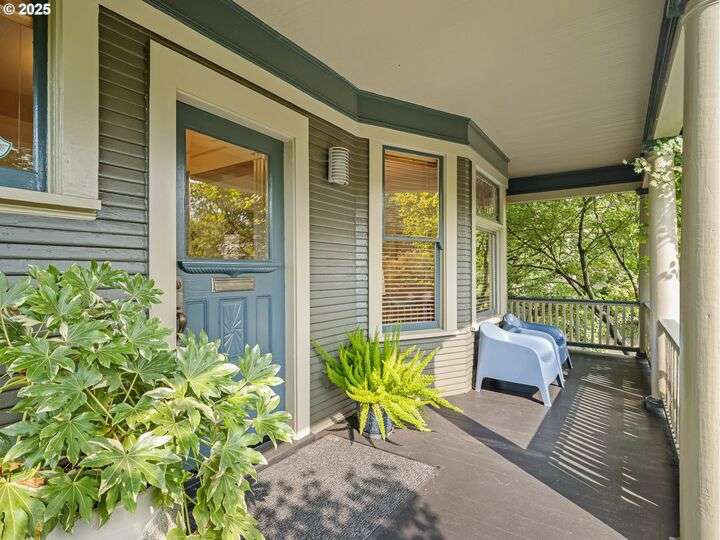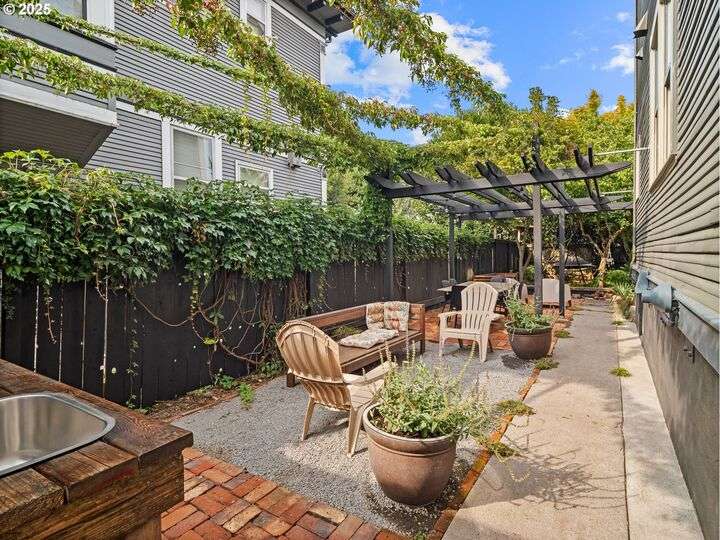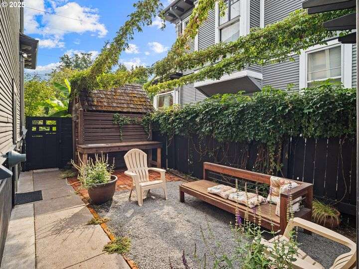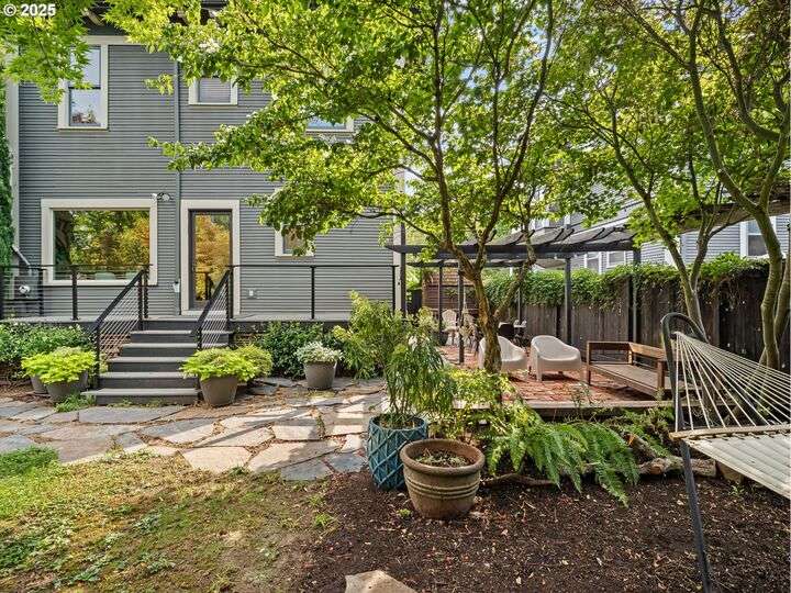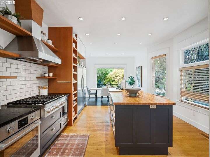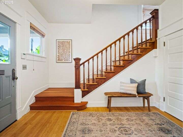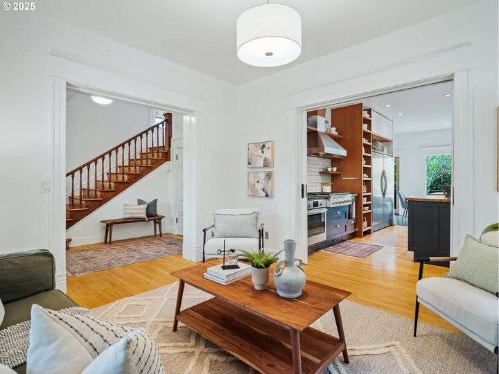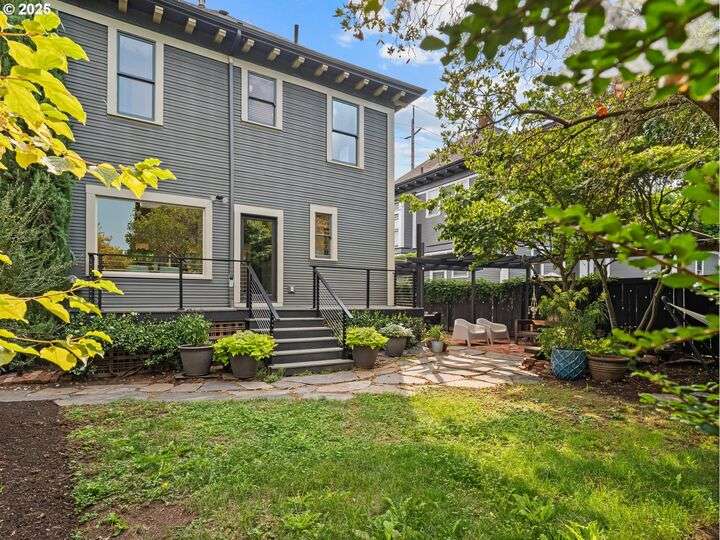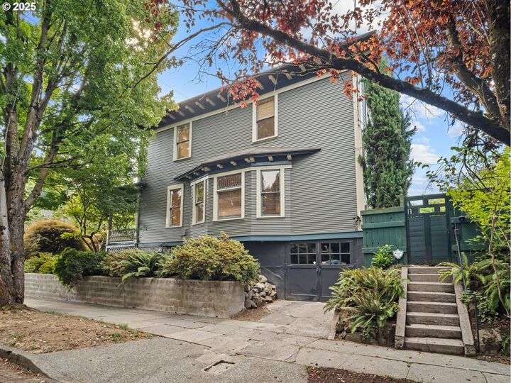 Step into timeless elegance with this grand 1904 Old Portland Foursquare, beautifully reimagined for modern living. Perched high on a landscaped corner lot along a tree-lined street, the home is filled with natural light and rare privacy, with a sun-drenched front porch perfect for morning coffee. Original architectural details—pocket doors, leaded glass windows, high ceilings, and a sweeping staircase—blend seamlessly with modern upgrades from a 2002 studs-out renovation, including new electrical, plumbing, and maple hardwood floors.The show-stopping gourmet kitchen boasts soapstone counters, a six-burner gas stove, oversized fridge/freezer, custom Manzanita island with seating for six and built-in wine rack, and a walk-in pantry. The adjoining dining area is anchored by a spectacular picture window overlooking the lush backyard. A formal living room and cozy library with gas fireplace and built-ins complete the gracious main level. Upstairs, the coveted floor plan includes three bedrooms on one level, laundry, and an expansive primary suite with spa-like bath featuring a double shower and soaking tub. The finished third floor offers flexible bonus space—perfect for a fourth bedroom, office, or wellness retreat. On the lower level you will find an income-producing unit with private entrance provides excellent flexibility for multi-generational living or rental income, with history up to $2,200/month. The fenced backyard features tranquil entertaining areas, lush landscaping, and a gardener’s shed/playhouse, while a tuck-under garage provides storage or hobby space. Energy-efficient updates include solar panels, central A/C, and a Level 2 EV charger.Unbeatable location: two blocks to New Seasons and the vibrant Williams corridor, a short stroll to Irving Park, and within Grant HS boundary. With a 92 Walk Score and perfect 100 Bike Score, this home is truly Portland living at its finest.