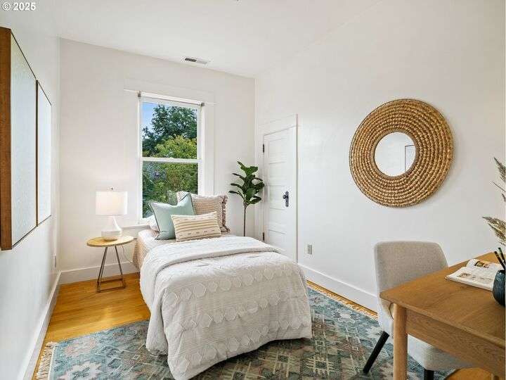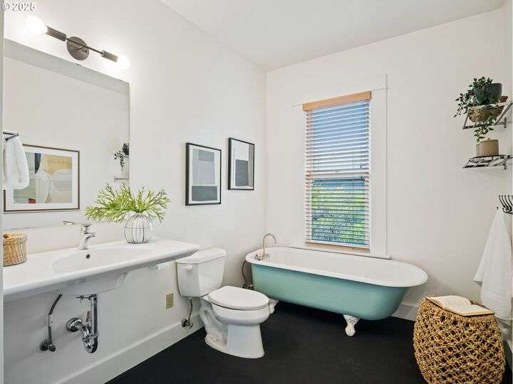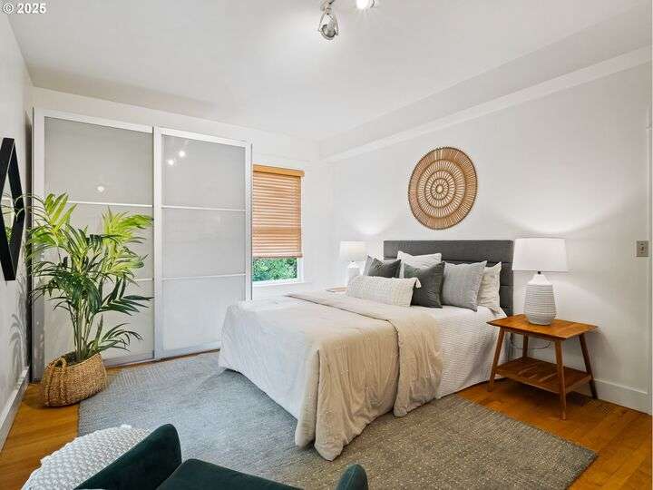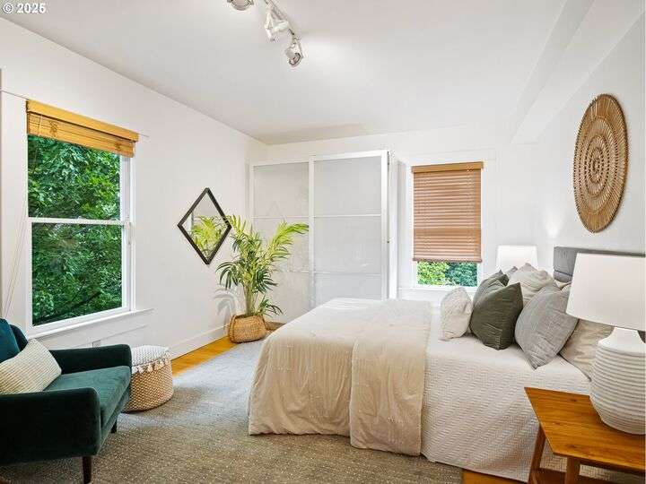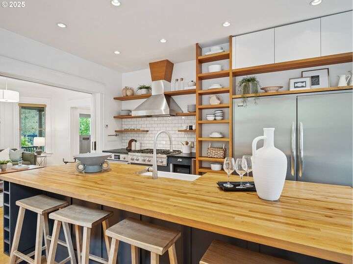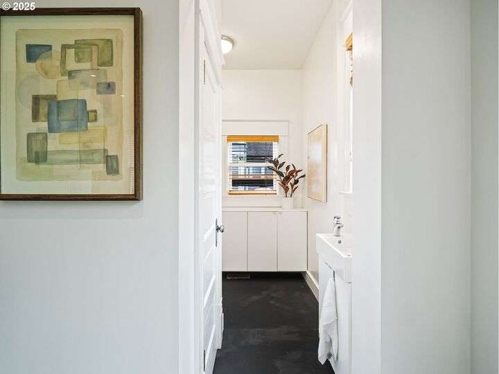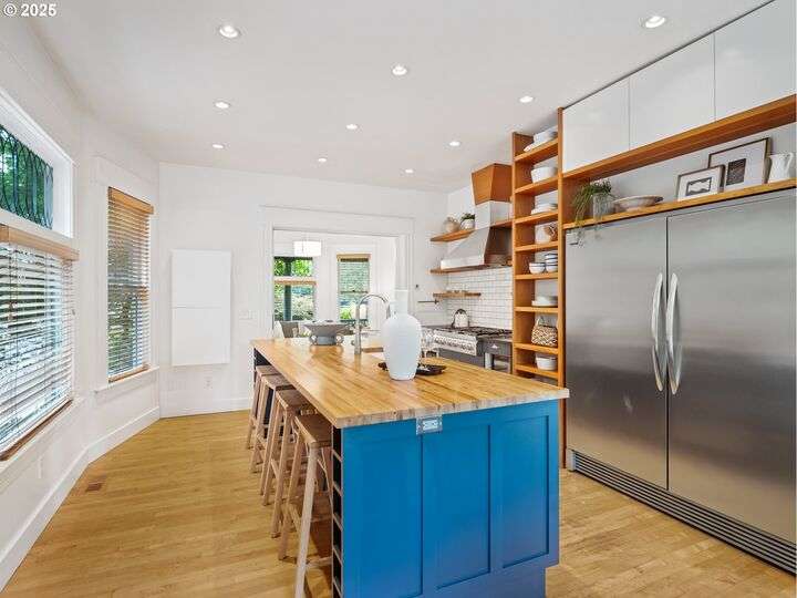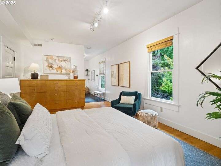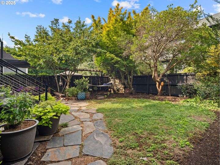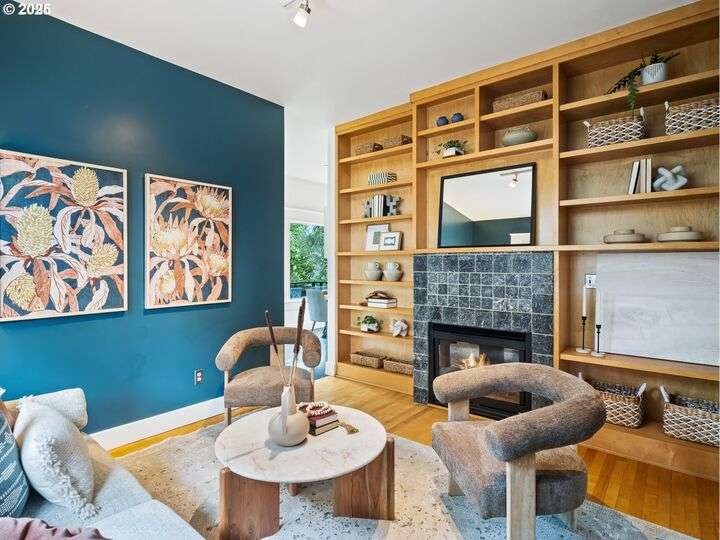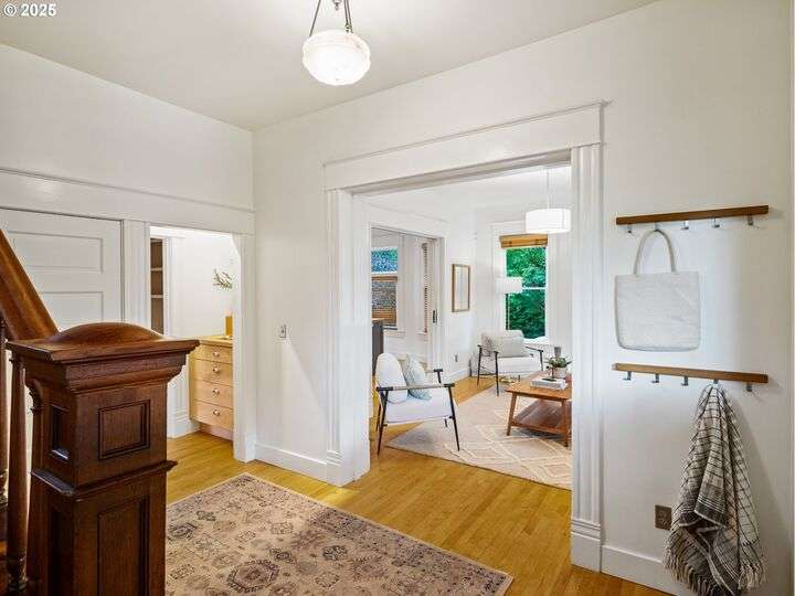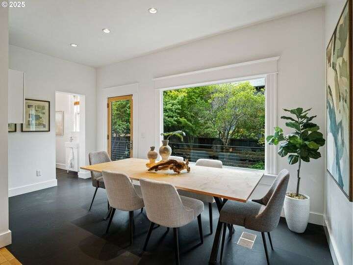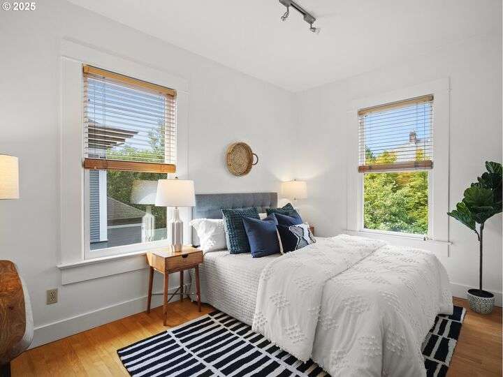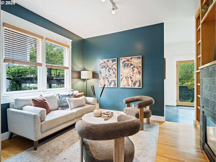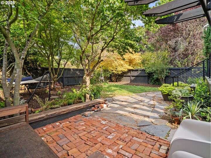 Step into timeless elegance with this grand 1904 Old Portland Foursquare, beautifully reimagined for modern living. Perched high on a landscaped corner lot along a tree-lined street, the home is filled with natural light and rare privacy, with a sun-drenched front porch perfect for morning coffee. Original architectural details—pocket doors, leaded glass windows, high ceilings, and a sweeping staircase—blend seamlessly with modern upgrades from a 2002 studs-out renovation, including new electrical, plumbing, and maple hardwood floors.The show-stopping gourmet kitchen boasts soapstone counters, a six-burner gas stove, oversized fridge/freezer, custom Manzanita island with seating for six and built-in wine rack, and a walk-in pantry. The adjoining dining area is anchored by a spectacular picture window overlooking the lush backyard. A formal living room and cozy library with gas fireplace and built-ins complete the gracious main level. Upstairs, the coveted floor plan includes three bedrooms on one level, laundry, and an expansive primary suite with spa-like bath featuring a double shower and soaking tub. The finished third floor offers flexible bonus space—perfect for a fourth bedroom, office, or wellness retreat. On the lower level you will find an income-producing unit with private entrance provides excellent flexibility for multi-generational living or rental income, with history up to $2,200/month. The fenced backyard features tranquil entertaining areas, lush landscaping, and a gardener’s shed/playhouse, while a tuck-under garage provides storage or hobby space. Energy-efficient updates include solar panels, central A/C, and a Level 2 EV charger.Unbeatable location: two blocks to New Seasons and the vibrant Williams corridor, a short stroll to Irving Park, and within Grant HS boundary. With a 92 Walk Score and perfect 100 Bike Score, this home is truly Portland living at its finest.