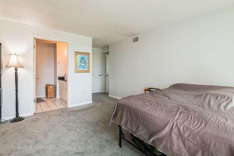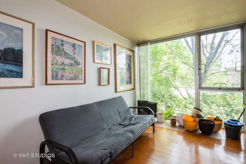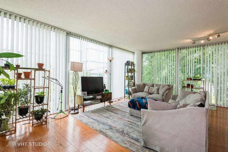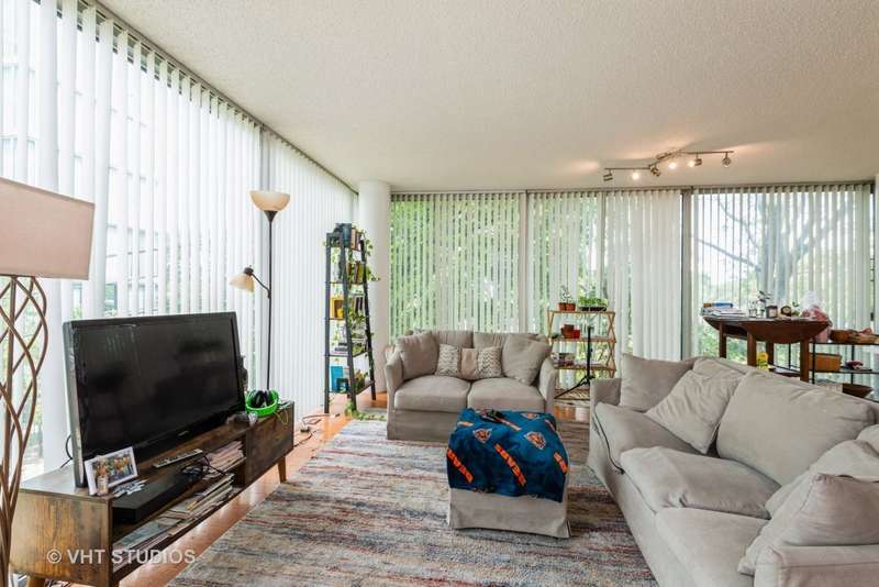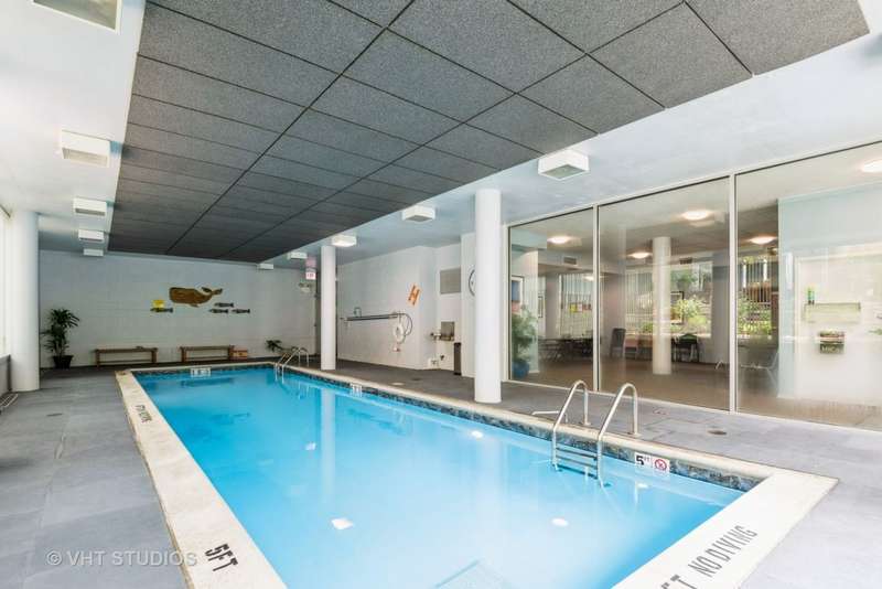 Bright and Airy Mies van der Rohe-Inspired Condo. This spacious 2-bedroom, 2-bath blends modernist style with everyday comfort. An open floor plan and floor-to-ceiling windows fill the space with natural light, while hardwood floors run throughout the main living areas. The eat-in kitchen is outfitted with stainless steel appliances and granite countertops. The large primary suite includes a walk-in closet and an en suite bath. You'll also find a side-by-side washer and dryer with extra storage above. Garage parking is included. The building offers guest parking in the courtyard, a fitness center, indoor pool, and a rooftop deck. Easy access to major expressways, Lake Shore Drive, and public transit.