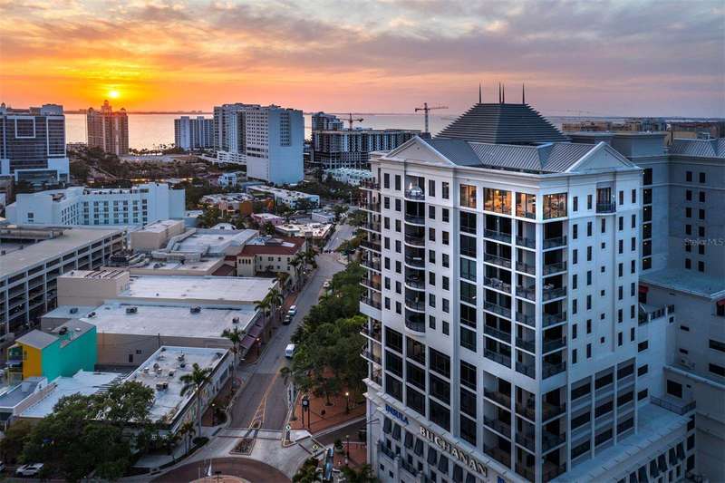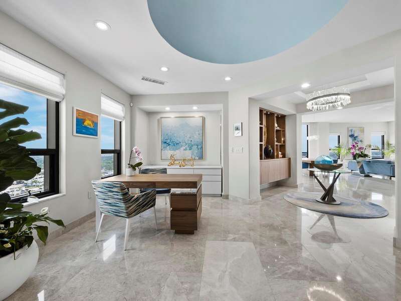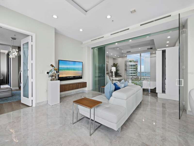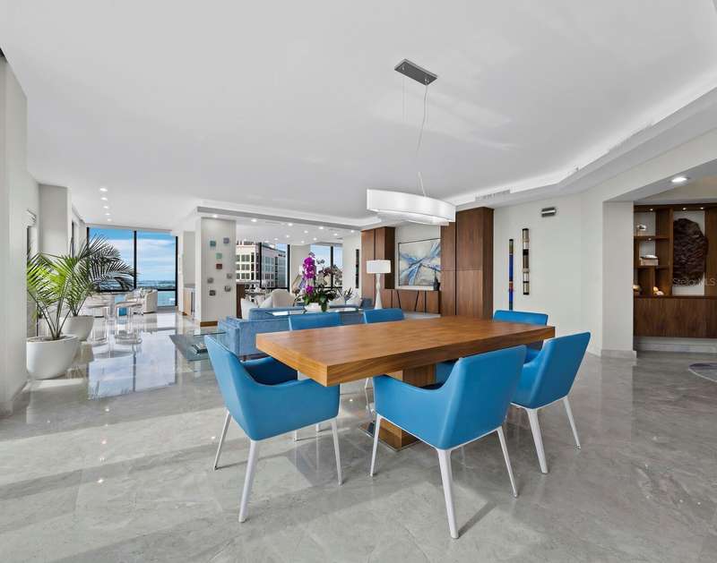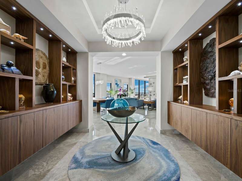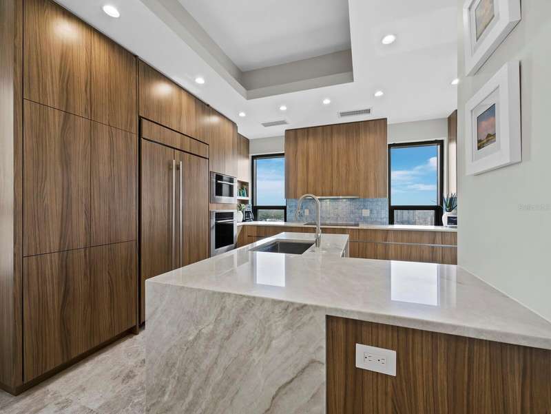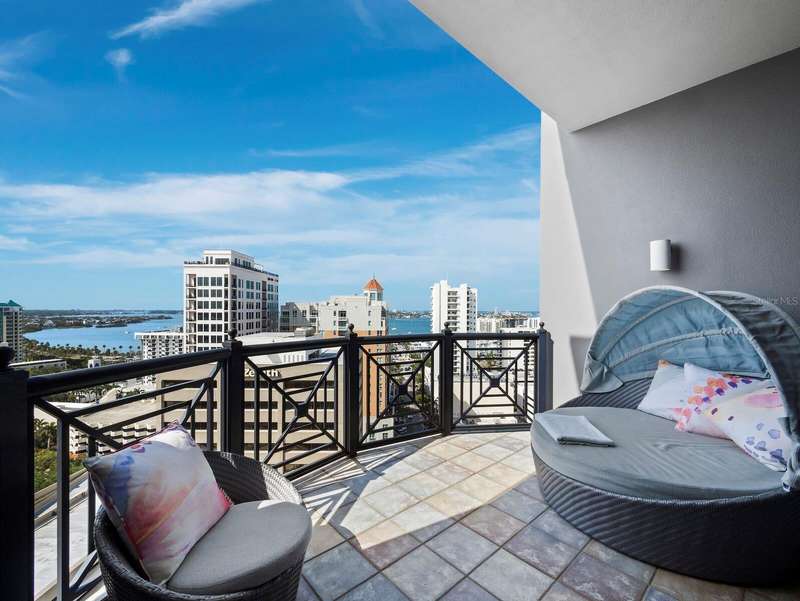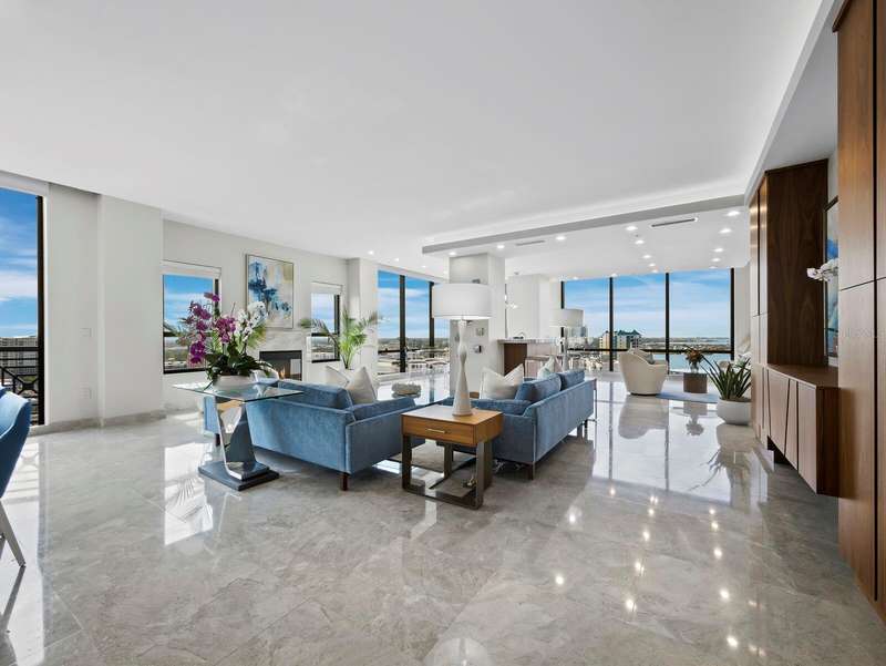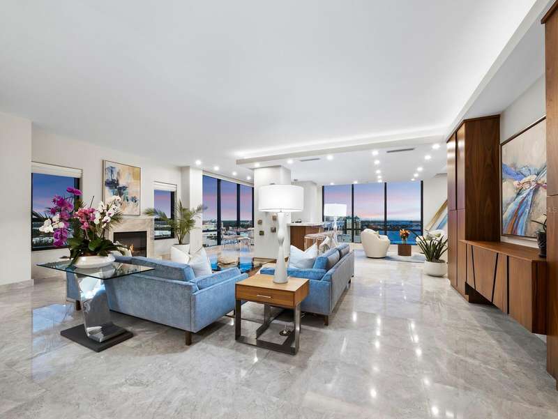 Penthouse Perfection in the Heart of Downtown Sarasota — The Plaza at Five Points Poised high above the vibrant cultural epicenter of Sarasota, this exceptionally renovated 17th-floor penthouse at The Plaza at Five Points epitomizes modern elegance and urban sophistication. Perfectly situated across from Five Points Park, The Selby Library, and the Sarasota Opera House, this distinguished residence places you steps from world-class dining, galleries, theaters, and boutique shopping. With floor-to-ceiling windows and an expansive open-plan layout, this luxurious home in the sky offers breathtaking, panoramic vistas that sweep across the city skyline, Sarasota Bay, the marina, and onward to the shimmering horizon of the Gulf of Mexico. The terrace invites tranquil mornings and unforgettable sunsets, framing the coastal beauty of Florida at its finest. Designed for both effortless entertaining and serene living, the interior boasts soaring volume ceilings and exquisite contemporary finishes throughout. The main living space is a masterclass in modern design, featuring refined stone flooring, custom built-ins, a striking marble-clad gas fireplace, and a fully integrated wet bar with stone counter and led illumination. The gourmet kitchen is a chef’s dream—adorned with new sleek cabinetry, stone countertops, cabinet paneled refrigerator and high-end stainless-steel appliances, a spacious island, large eat in area, and designer tile backsplash - all blending style with functionality. The primary suite is a private sanctuary, complete with a secluded terrace, dual luxurious bathrooms, and generous his-and-her walk-in closets. A sumptuous Jacuzzi tub, separate walk-in shower, and elegant stone finishes elevate the spa-like ambiance. Two additional en-suite bedrooms—one of which serves as a sophisticated study with built-in storage and a hidden Murphy bed—offer privacy, versatility, and guest accommodations of the highest standard. Life at The Plaza at Five Points is defined by its world-class amenities and unwavering attention to detail. Residents enjoy a private, secured lobby entrance, full-time concierge, and valet services. Socialize or entertain in the elegant club room with a fireplace and catering kitchen, hold meetings in the professional conference room, or unwind in the rooftop heated pool and spa, surrounded by expansive sun decks and covered lounging areas. Additional amenities include a fully equipped state-of-the-art fitness center, a furnished guest suite, gazebo and grill area, and a Grand Motor Court. This penthouse residence also includes two secure garage parking spaces and an oversized, climate-controlled storage unit ideally located just steps from the unit’s hallway. The pet-friendly building offers the ultimate convenience for those seeking refined urban living in one of Florida’s most sought-after coastal cities. Don't wait to build, this new apartment is ready for you. Where Sophistication Meets the Sky — Experience the Pinnacle of Sarasota Living.
