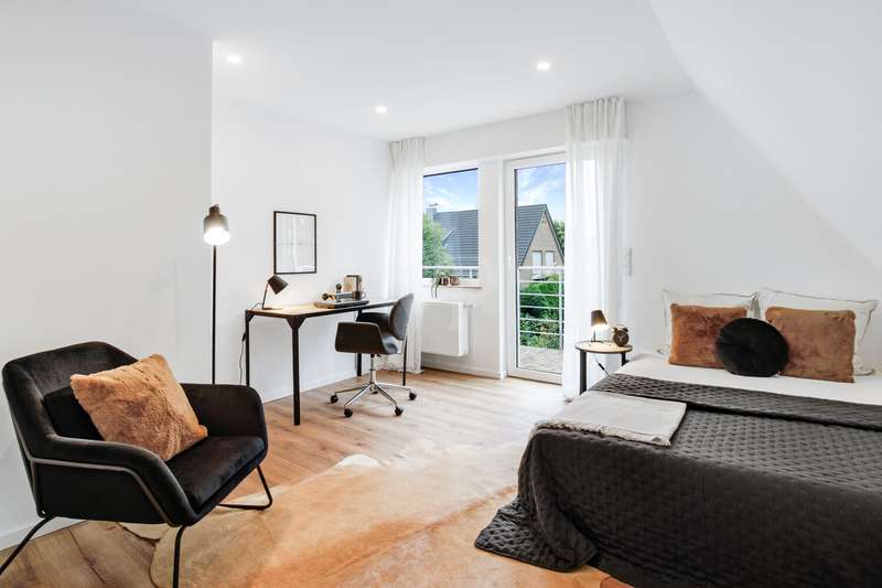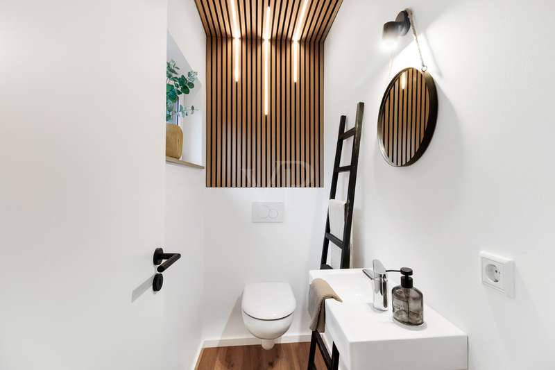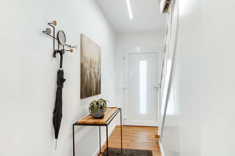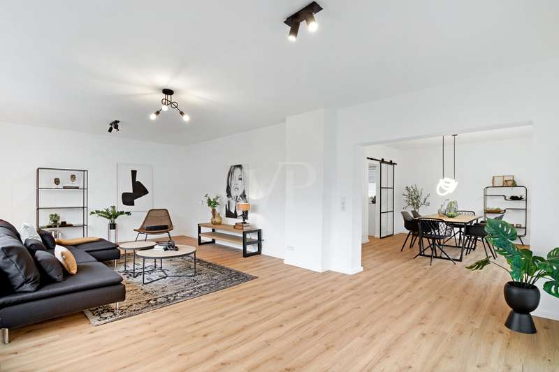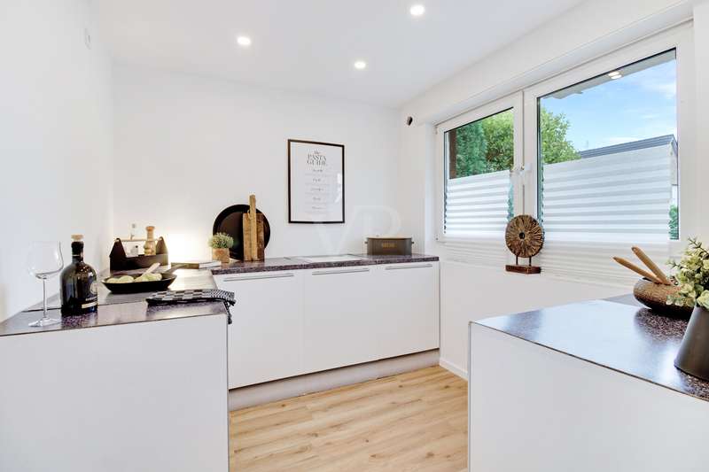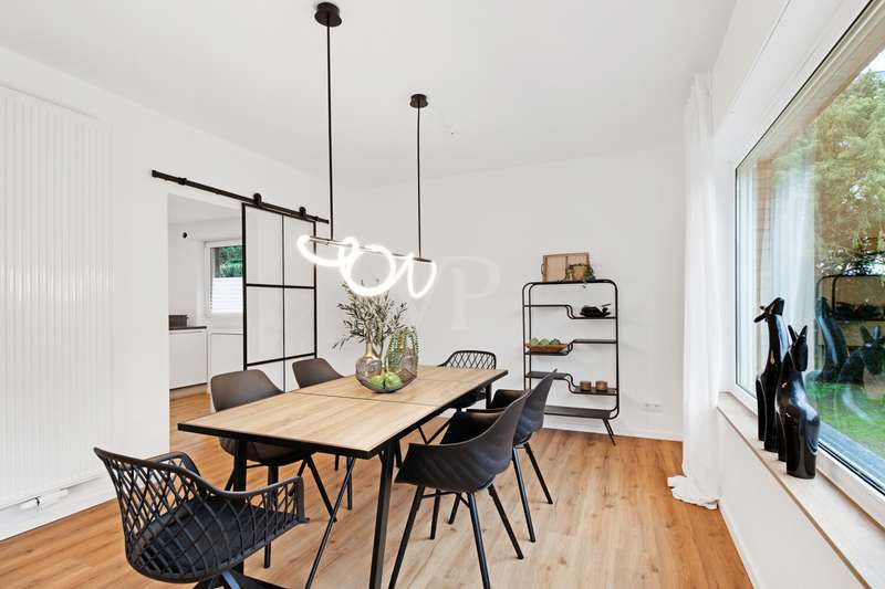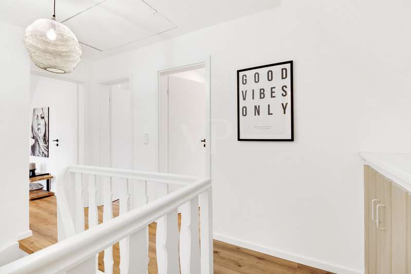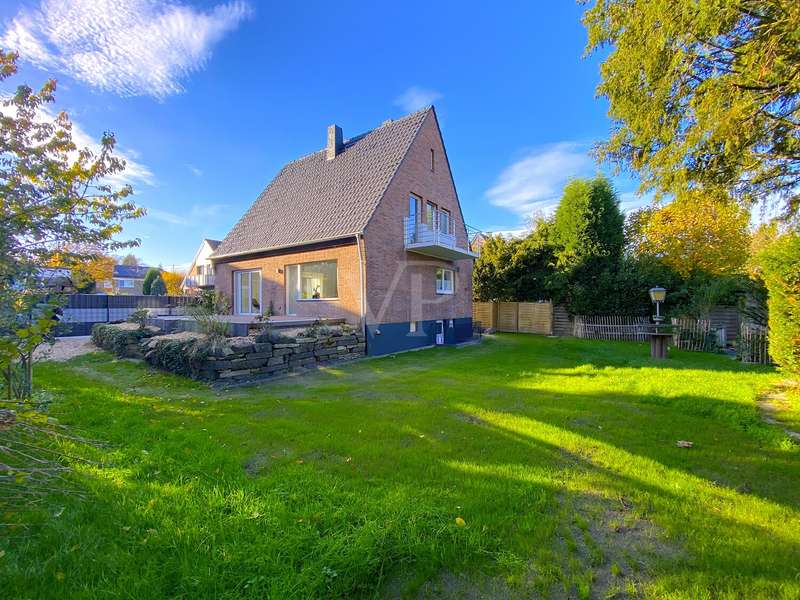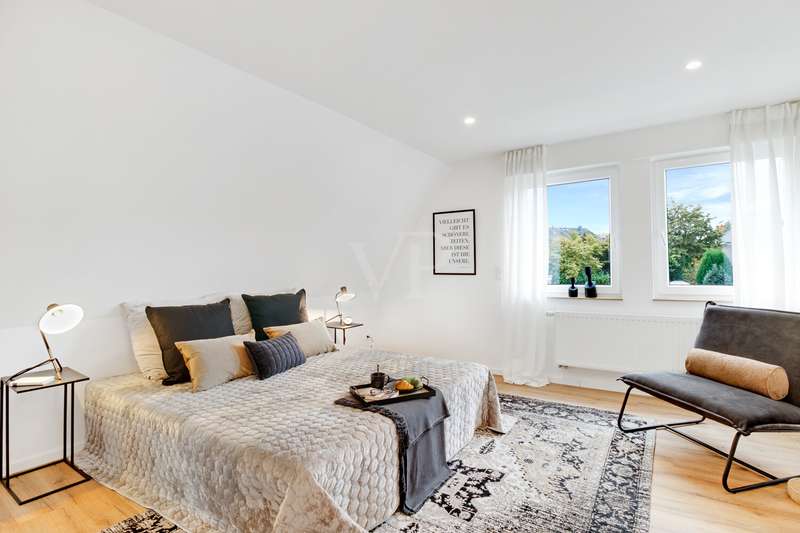 FIRST OCCUPANCY AFTER MODERNIZATION. Following extensive modernization, this modernized detached house built in 1956 presents itself in a contemporary condition with an energy efficiency rating of B. Numerous renovations were carried out by October 2025, bringing the house up to date in terms of technology, furnishings and living comfort. The living space of around 140m2 is spread over two levels with open-plan yet clearly separated areas that allow for pleasant family living. The detached house stands on a plot of approx. 604m2 with a newly designed outdoor area including a fence and lawn. Inside, new ceilings with integrated LED lighting, electric shutters and completely renovated interior and exterior doors create a contemporary ambience. The floors have been freshly laid and the building services brought up to date. Some of the pipes have been renewed and new radiators installed, which are operated by an efficient air heat pump. The property was also fitted with new guttering. The clever room layout offers numerous advantages. From the entrance area, the hallway opens up, providing access to the individual living areas. To the left of the entrance is the practical guest WC. Straight from the hallway, the path leads into the open-plan living and dining area with large windows that let in plenty of natural light and provide direct access to the newly built terrace and the well-tended garden. The terrace from 2025 creates a modern and well-kept connection between the indoor and outdoor areas and offers plenty of space for leisure and relaxation. The spacious kitchen is adjacent to the dining area. This connection creates short distances and at the same time allows for a communicative atmosphere when cooking and eating. A modern staircase leads from the hallway to the top floor, which has a total of three rooms that can be used as a children's room, study or guest room. The master bedroom has a balcony and is quietly situated on the garden side. Directly accessible from the hallway, the bright bathroom, including shower, offers plenty of space and modern fittings. Both the large bathroom and the guest WC are equipped with freshly installed sanitary facilities from 2025. The house has a full basement and offers additional cellar rooms for versatile use as storage, utility or hobby areas. The unfinished attic offers further potential.