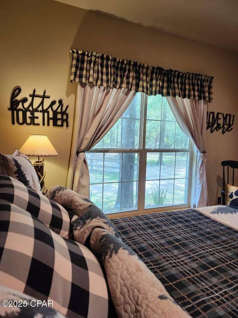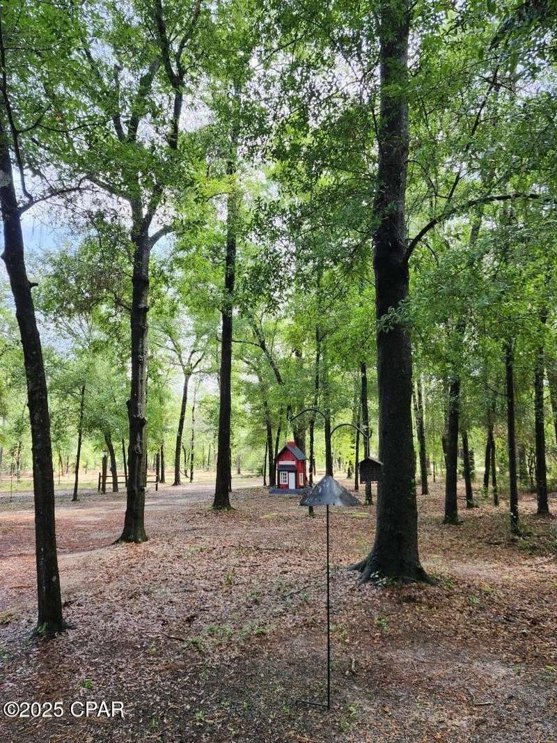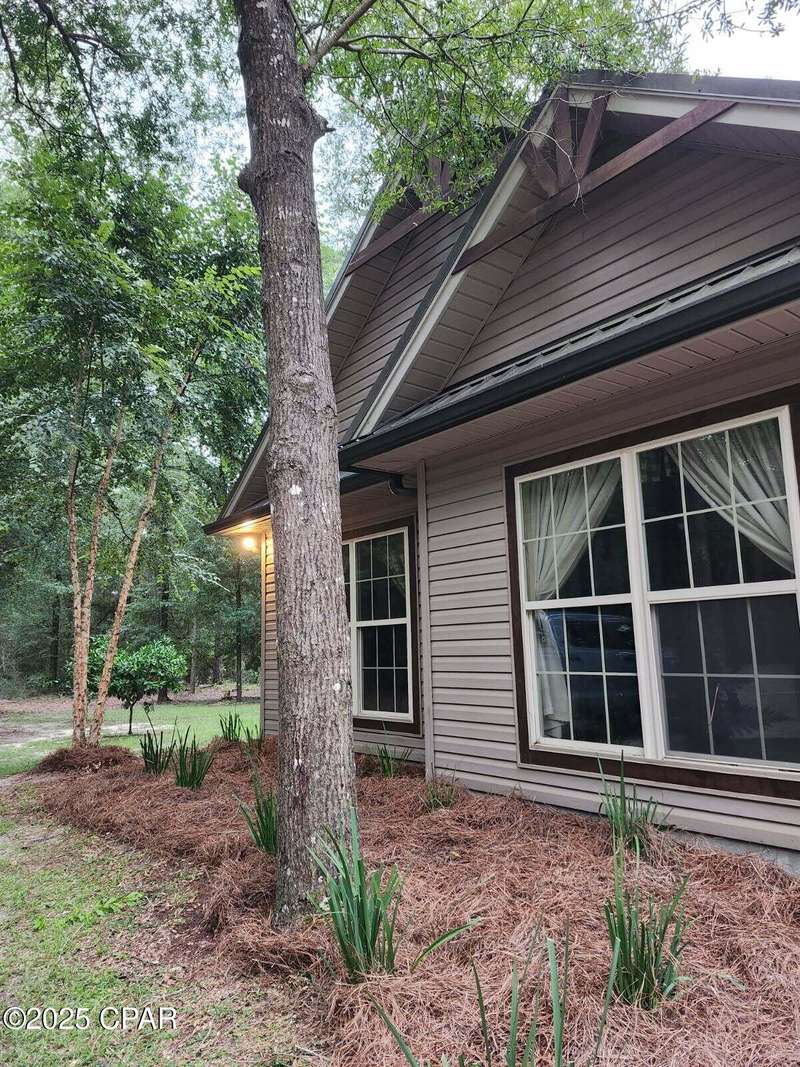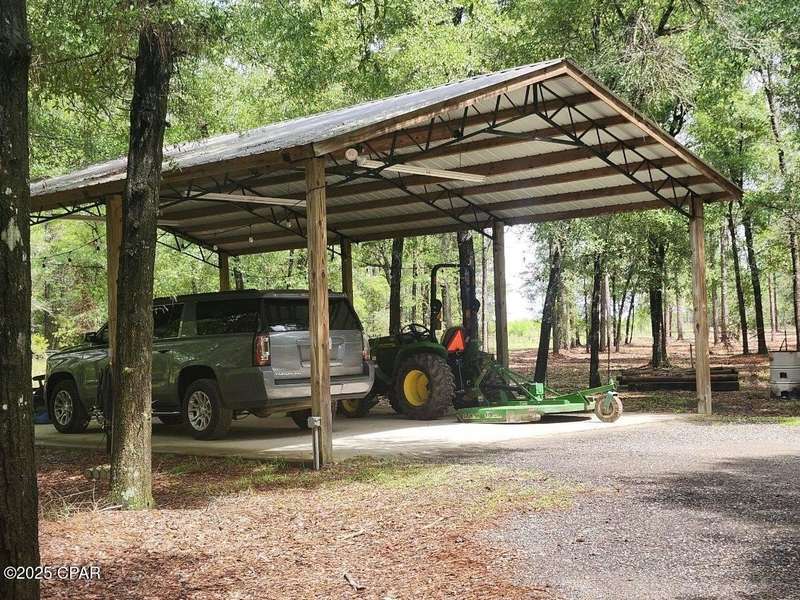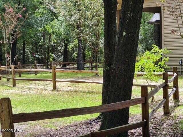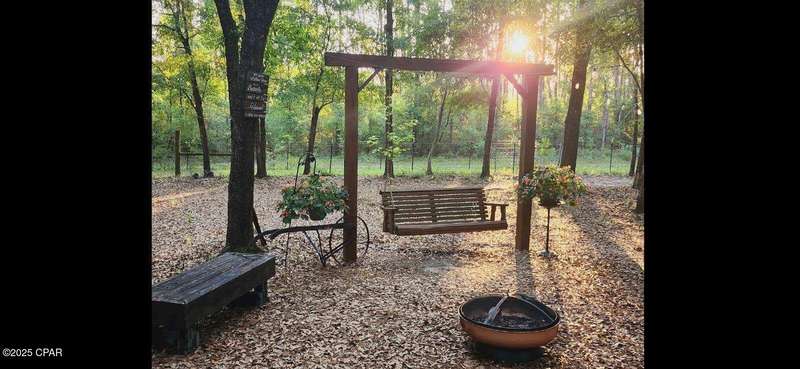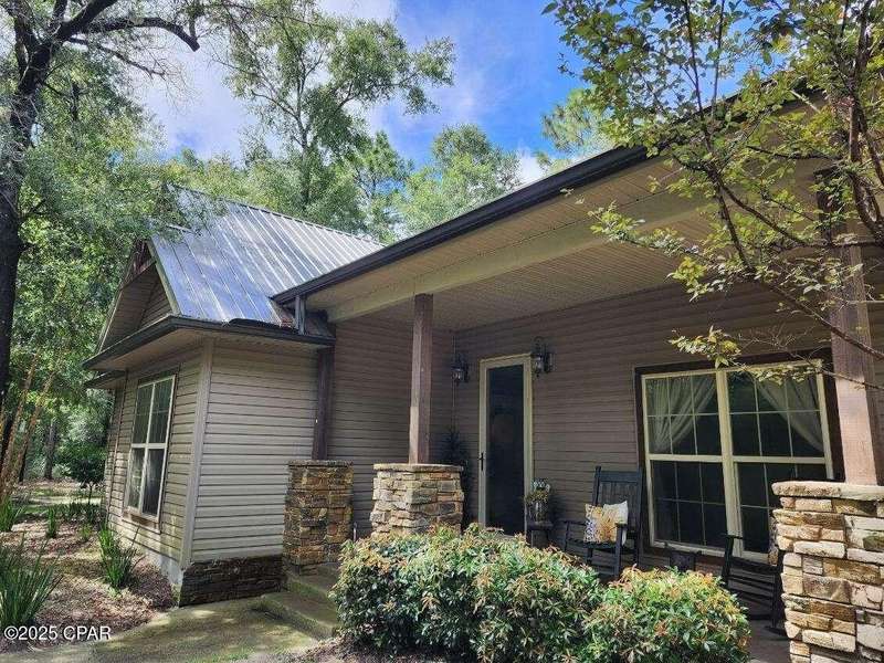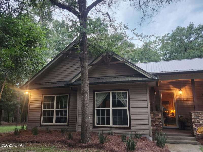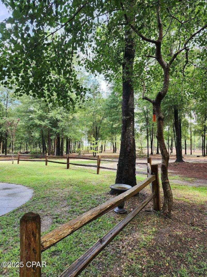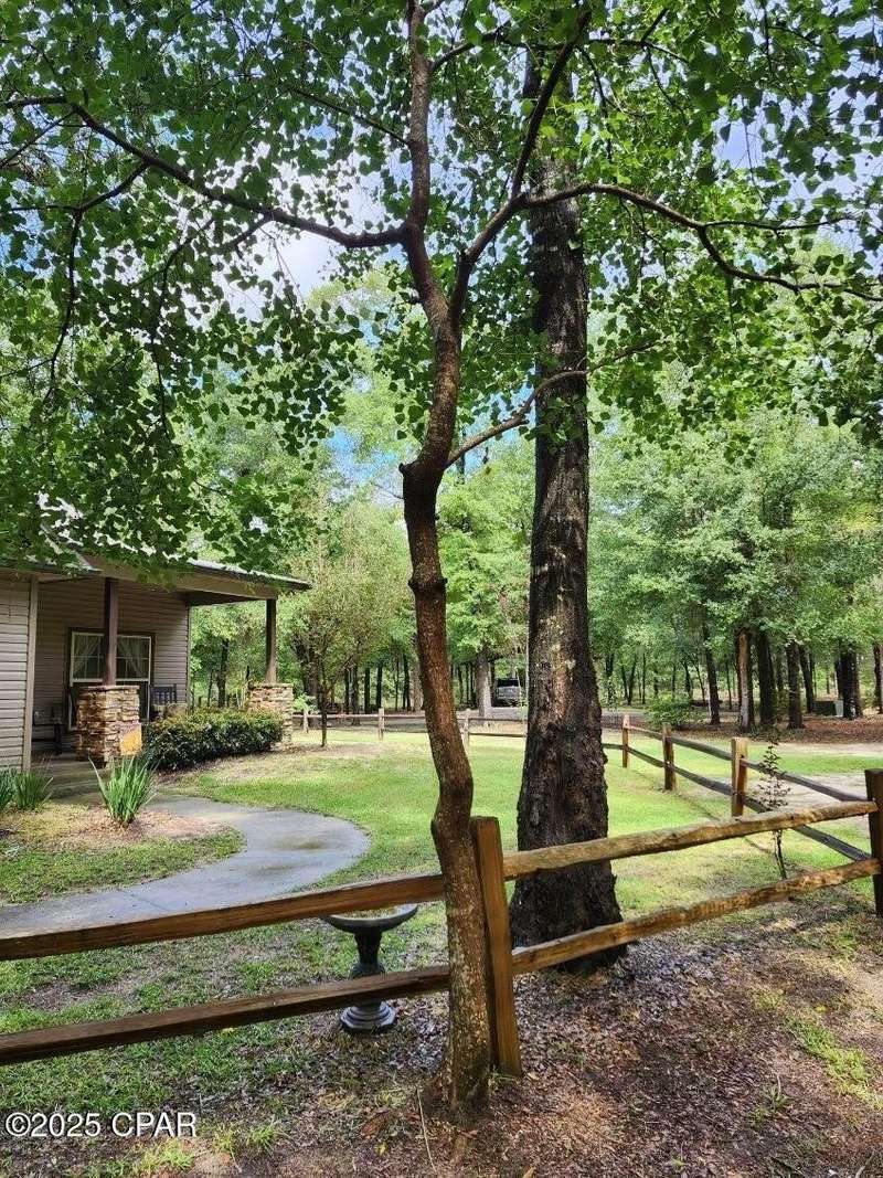 'CURRENTLY UNDER CONTRACT, SELLER WILL CONSIDER BACKUP OFFERS' This gorgeous rustic home looks like those common in Gatlinburg, TN., but it is only about 50 minutes to Pier Park at the beach. Located at the dead end of a cul-de-sac, this 3.17 (+/-) acre lot backs up to land used for hunting so wildlife is abundant. This beautiful home is in the security gated subdivision of Leisure Lakes, just north of Panama City off Highway 77. It has 3 spacious bedrooms and two full baths. The front porch is covered and has a concrete floor. The back deck is covered and a great place to sip coffee and watch the sun go down. The entire property is fenced in and has a separate smaller fenced area for pets out back. The massive wood burning fireplace is impressive with stacked stone surround, as well as the cathedral ceiling with exposed wood beams. Construction like this takes a lot of time and highly skilled wood and stone workers. Tall ceilings allow for tall windows allow for great views with plenty of light to flow into the house. The kitchen has granite countertops, breakfast bar and a pantry. The separate dining room is just off the kitchen. The primary bedroom suite has two vanities separated by a convenient makeup station. The large walk-in shower has a seat, is tiled from the floor up, and the big walk-in closet is also in the bathroom. There is attic storage and access in the 2-car garage, and additional parking or equipment storage is a 24x36 pole barn near the garage entrance. There are numerous oak trees that provide shade and the drive way loops around the front of the house. If you are hunting a beautiful home with a rustic feel, consider this one. The neighborhood amenities features a security gate with live guards weekdays, a swimming pool, boat launch, toddler playground, men's and women's restrooms, basketball court, tennis court, good fishing in two clear lakes, and more. The largest of the two lakes is about a mile across, or about 3 miles around. The water is very clear and spring fed. Be sure to see all of the photos.