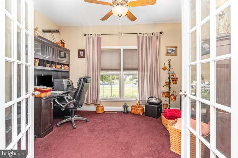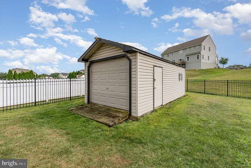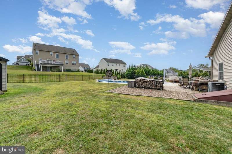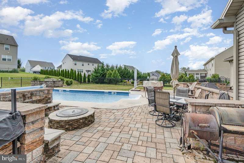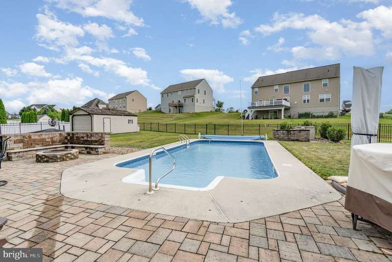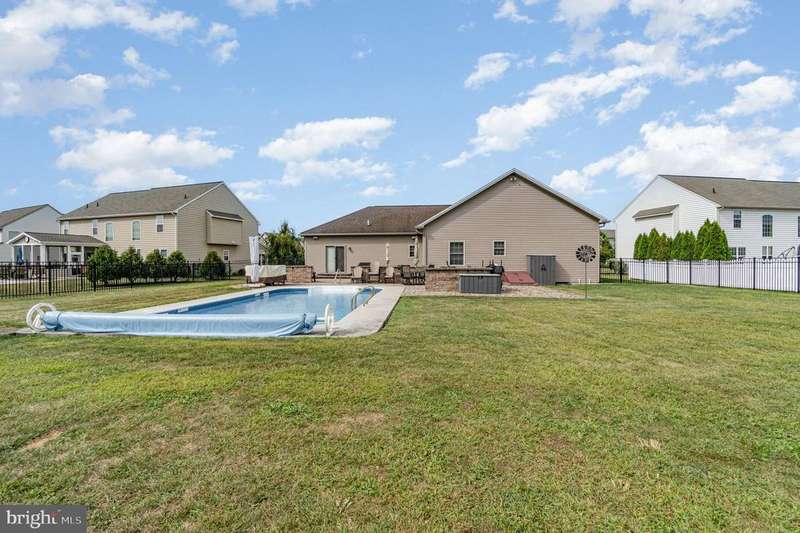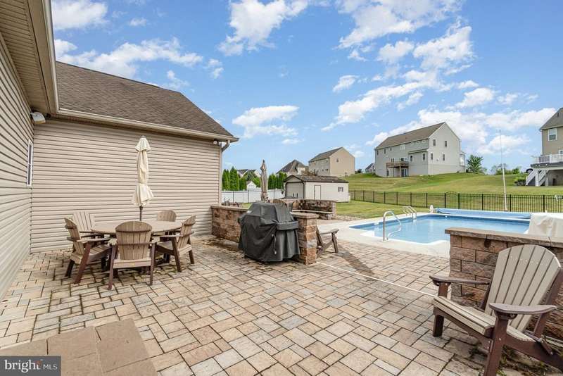 Enjoy one level living at it's finest in this thoughtfully designed, spacious ranch home in the popular community of Amber Fields. The large, fenced rear yard features a backyard oasis with an in-ground pool and extensive hardscaping, including knee walls and a built-in firepit. The expansive primary bedroom suite has two spacious walk-in closets, 2 ceiling fans and full bathroom with double vanity and linen closet. The eat-in kitchen offers a center island with seating, ceiling fan and large walk-in pantry. The formal dining room has crown molding, chair rails and a ceiling fan. The living room opens to the rear patio and adjoins the office with French doors. The laundry room is conveniently located on the main level. Additional features include ceilings fans and 9-foot ceilings throughout the home. Recent updates include beautiful luxury vinyl plank flooring and a newer pool liner. The enormous basement with outside entrance presents endless possibilities for customization, whether you envision a home gym, workshop, or additional living space. Outbuilding and 3 sheds provide extra storage for all your outdoor essentials. With an attached two-car garage offering inside access, parking is a breeze. Experience the warmth and comfort of this inviting home, where every detail has been designed with your needs in mind.