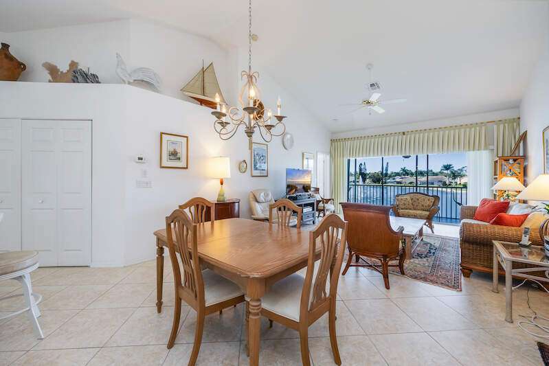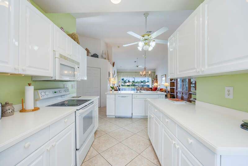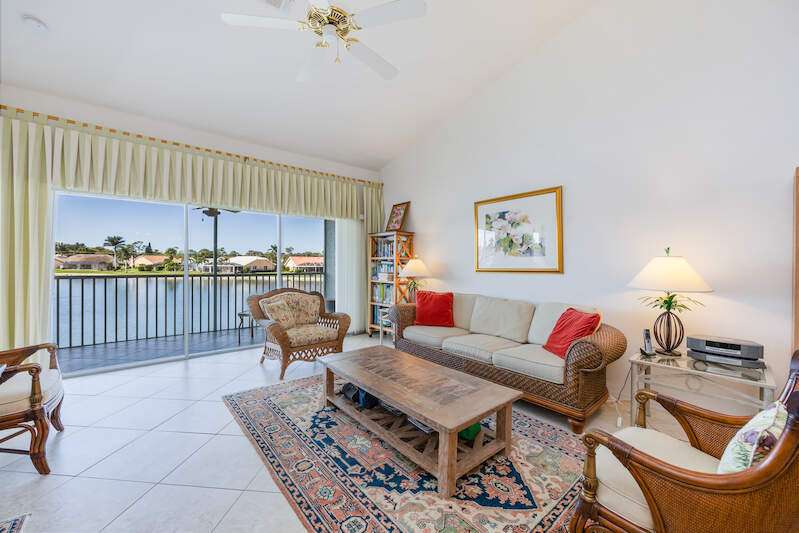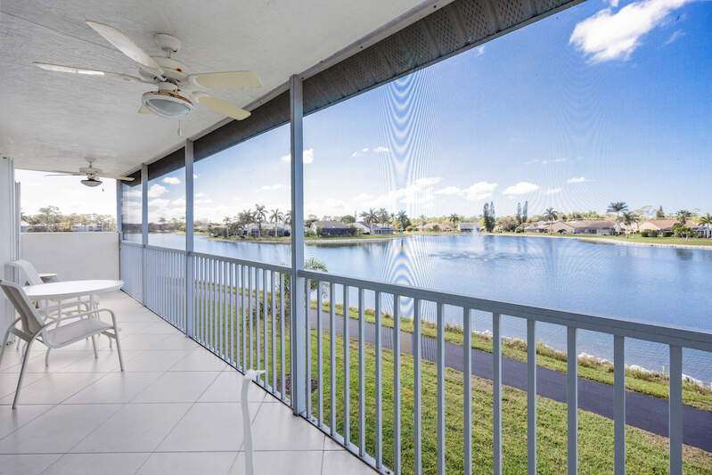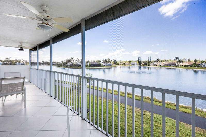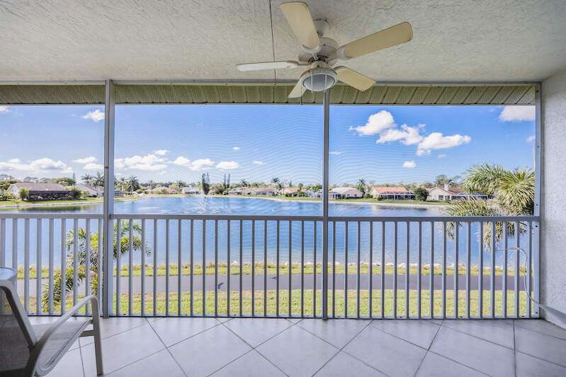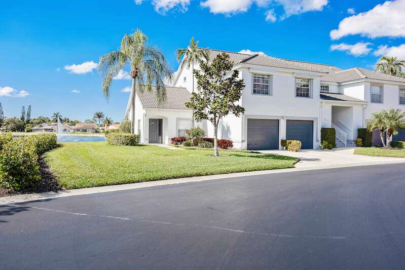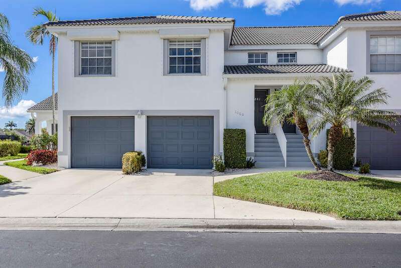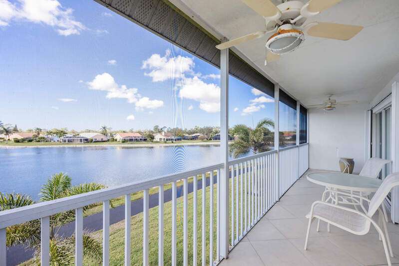 Partridge Pointe is a highly sought-after community within Berkshire Lakes. This one-owner unit is filled with natural light all day, featuring cathedral ceilings, light tile throughout, and wood flooring in the bedrooms. The spacious eat-in kitchen welcomes the morning sun, while the widened steps make them so much more functional to the second floor. The home offers two bedrooms and a long screened lanai with storm shutters on the sliders and windows, providing breathtaking southwest-facing views of the sparkling lake and open vistas on both sides of the condo. Enjoy stunning sunsets from the lanai, living room, or primary bedroom. The attached garage door was replaced and repainted less than two years ago, and the one-car garage includes shelving and additional storage space. The building's roof was replaced with tile in 2019, along with other buildings in Partridge Pointe, with no special assessment. Residents of this charming community enjoy access to a clubhouse with vibrant social activities, a beautiful pool, and a scenic two-mile walking trail around the lake. Berkshire Lakes is meticulously maintained and offers an outstanding location with quick, easy access to shopping, dining, I-75, downtown Naples, beaches, and arts and cultural events. This unit is offered turnkey furnished (excluding artwork) and is move-in ready. Why spend another winter in the cold when you could be here?