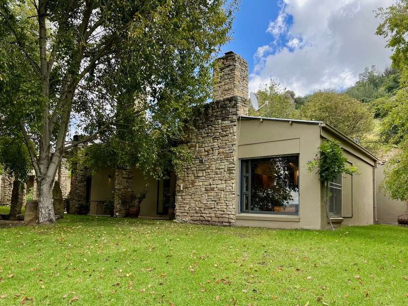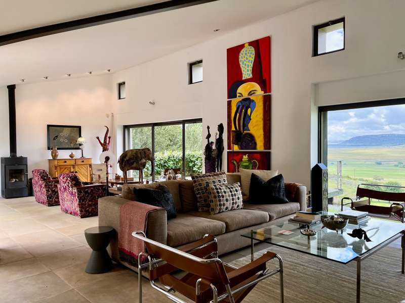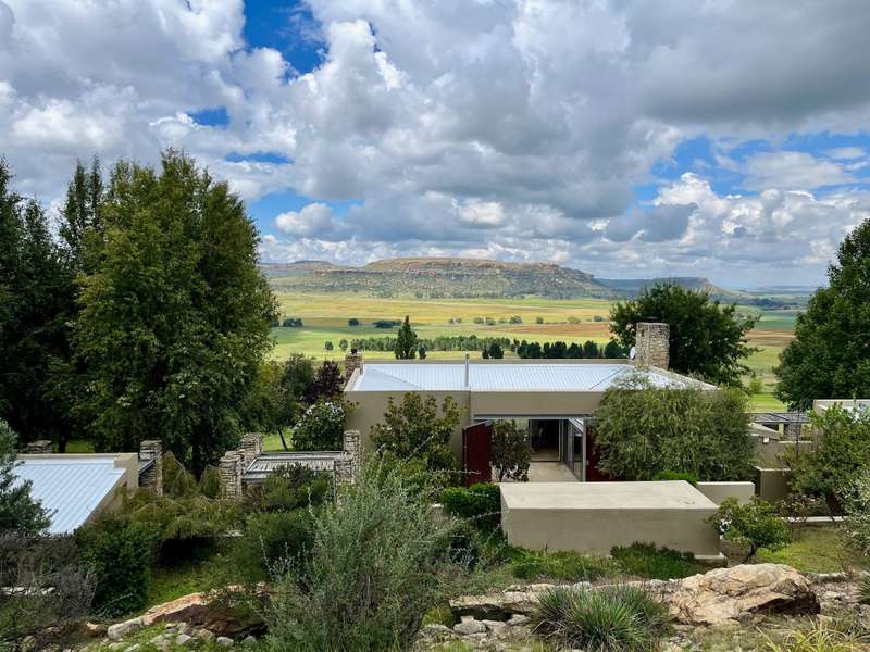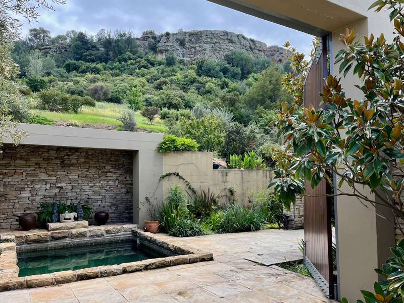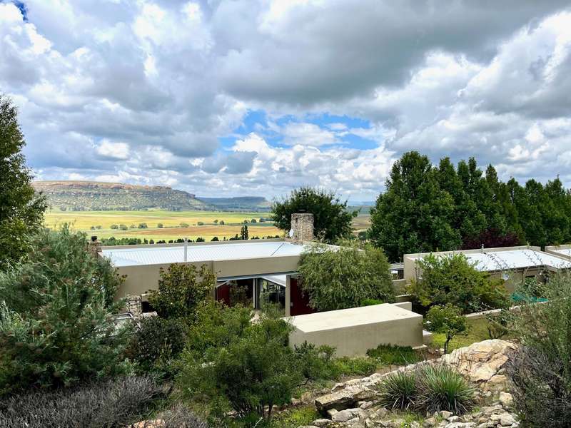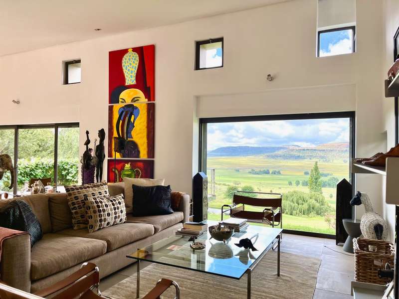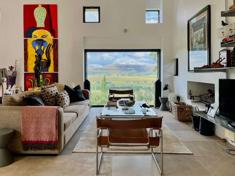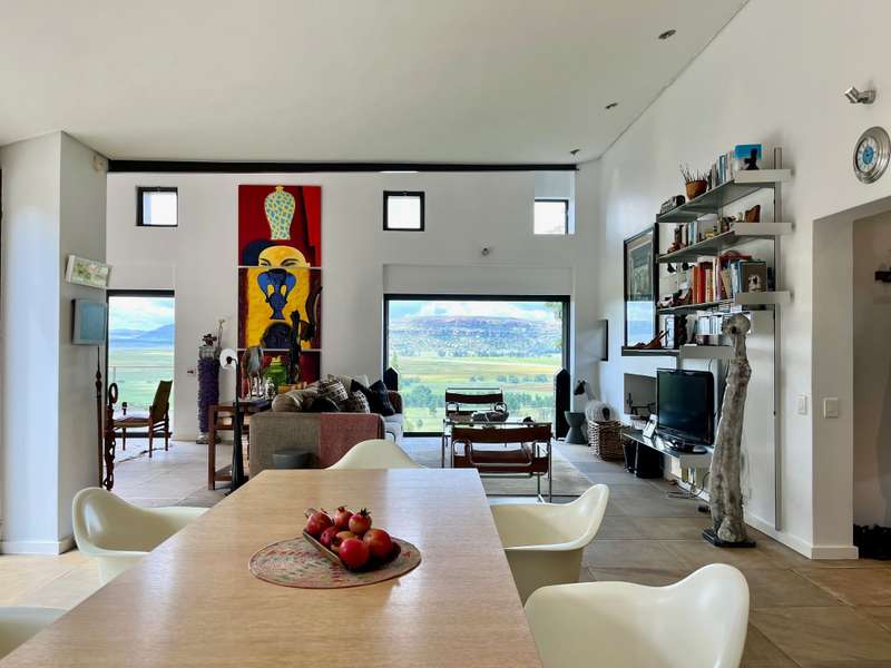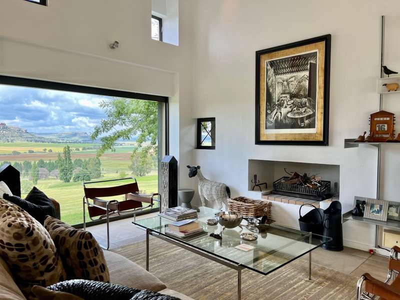 Perched dramatically on the side of an amphitheatre of the Grootnek mountain in the Eastern Free State, this architecturally designed 85-hectare property offers a truly extraordinary living experience. Masterfully hewn from the mountain, this modern sanctuary, with sandstone accents, provides spectacular panoramic views of the majestic surrounding mountain ranges. The main residence features two generous bedrooms, each with its ensuite bathroom, designed with luxurious comfort in mind, and thoughtfully positioned to maximize the breathtaking vistas. The open-plan living spaces create a remarkable sensation of "living in the sky," with the magnificent landscape unfolding before you from the deck and the enormous windows. A custom-built kitchen, a separate scullery, an outdoor pantry, a gas hob and an electric oven create the perfect space to cook and host dinner parties. A separate guest cottage provides additional accommodation with two more rooms, featuring ensuite bathrooms. The cottage has an open-plan living and dining area with a fitted kitchen. Discarded sandstone pillars frame a circular outside fireplace – a site for evening meditation that captures the magic of the unending countryside. The property boasts two dams and a reservoir, filled by three natural mountain springs that provide 27 000 litres of water per day, year-round. The springs feed into three water tanks which overflow into a reservoir. The garden, including the orchard with apple, cherry, lemon and persimmon trees, is serviced by a computerized irrigation system. The property's natural sandstone construction harmonizes beautifully with the surrounding landscape, creating a seamless connection between the built environment and the dramatic natural setting. This is more than just a home; it's an exclusive retreat that captures the essence of luxury living in one of South Africa's most picturesque regions. The property is situated between Rosendal and Ficksburg Architect - Johan Bergenthuin Featured in Visi Magazine February 2011 Underfloor heating throughout the main house and cottage Heated towel rails in all bathrooms in the main house and cottage Morso fireplaces in the main house and cottage Outside built-in braai at the guest cottage Outside fire pit Two fully-appointed staff accommodations Metal roller-shutter security over all windows and access points. No permanent residency on the farm. 3 phase electrical supply directly from Eskom Comprehensive plans and engineering specifications are available on request